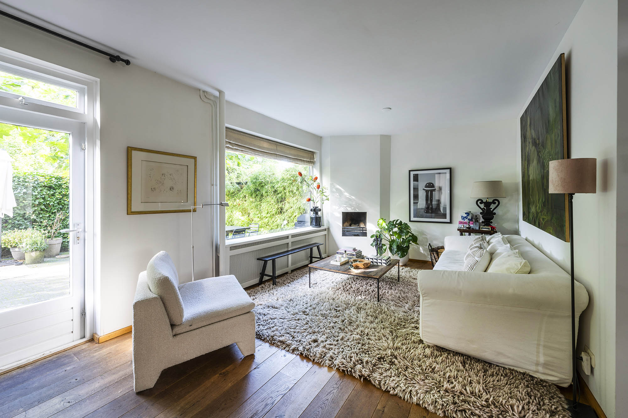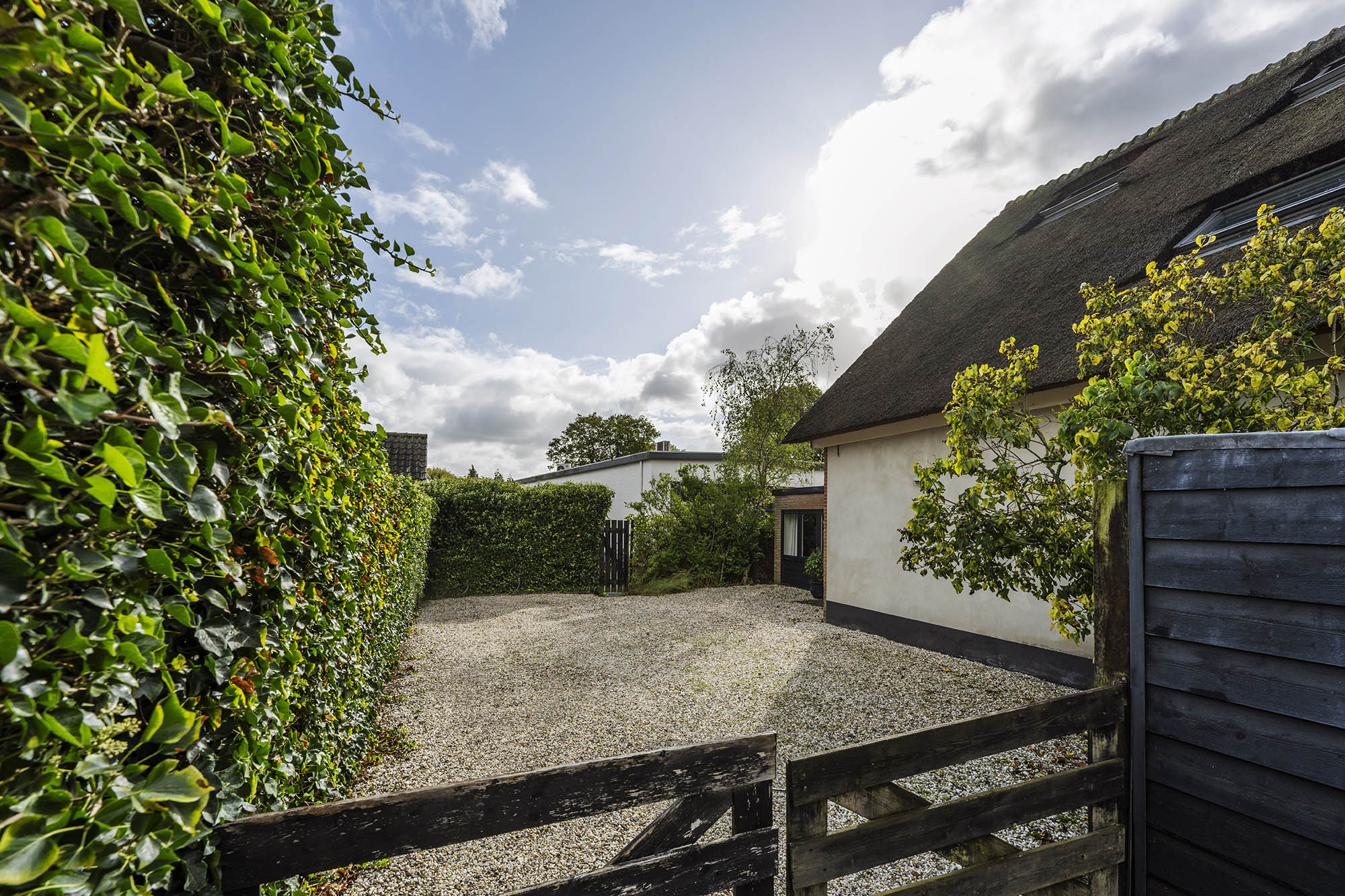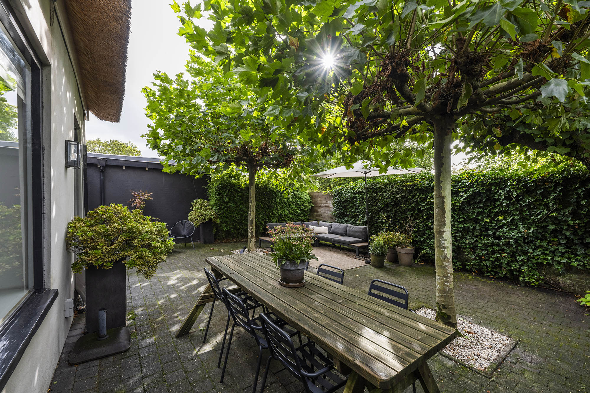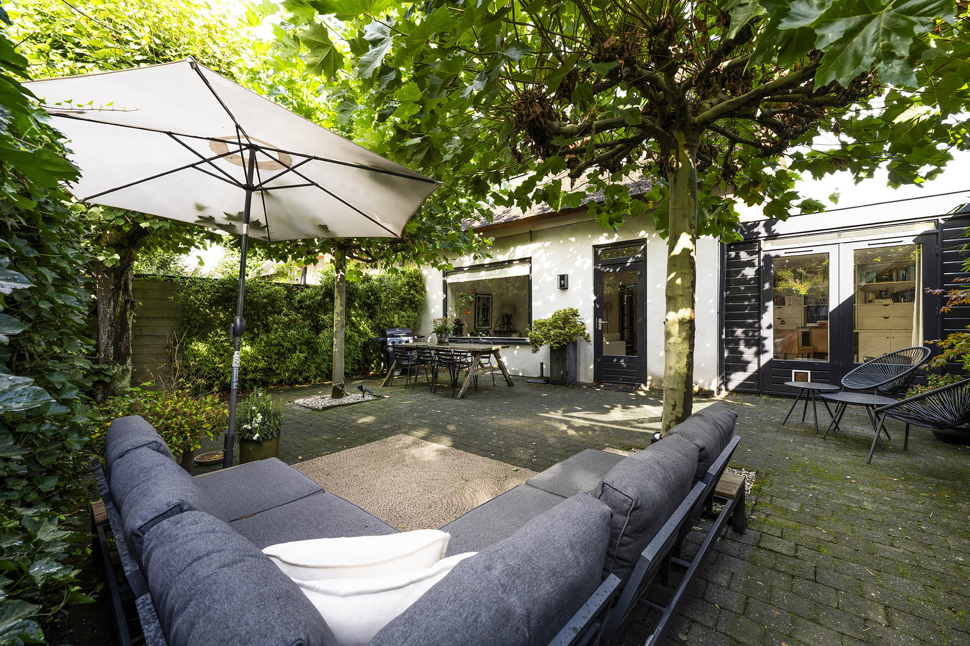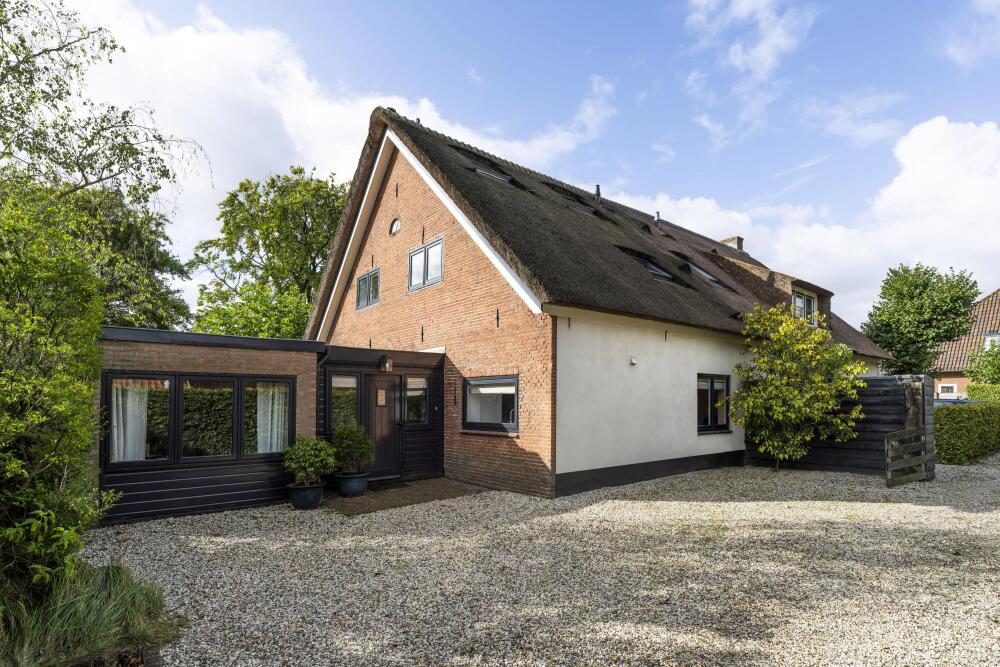 Das Familienhaus in Laren liegt ruhig hinter der Fassade eines reetgedeckten Bauernhauses, das nur über einen diskreten Kiesweg erreichbar ist. Diese abgeschiedene Lage bietet eine ausgewogene Kombination aus Privatsphäre und Komfort mit großzügigen Parkmöglichkeiten auf dem Grundstück sowie Zugang zum Ortszentrum. Schon beim Betreten des Hauses verspürt man ein Raumgefühl, das an diesem Standort selten zu finden ist. Das Wohnzimmer erstreckt sich über die gesamte Breite des Hauses und empfängt dank französischer Türen viel Licht, was einen fließenden Übergang in den sonnigen Garten mit Schatten spendenden Platanen schafft. Ein Kamin bildet den Mittelpunkt des Raumes, während eine separate Arbeitsecke Funktionalität und Wohnkomfort ergänzt. Die moderne, hochwertig ausgestattete Wohnküche sowie das separate Fernsehzimmer tragen zu einem entspannten Alltag bei. Im Obergeschoss sind drei Schlafzimmer durchdacht angeordnet, darunter ein Raum, der für die Wäsche genutzt wird. Das elegante Badezimmer ist mit Badewanne, Waschtisch und WC ausgestattet. Eine feste Treppe führt ins oberste Geschoss, wo sich die Master Suite mit maßgefertigtem Schrank und eigenem Bad als privater Rückzugsort präsentiert. Flexibilität ist das Herzstück dieser Immobilie: Der großzügige Grundriss erlaubt Schlafmöglichkeiten im Erdgeschoss und macht das Haus generationenübergreifend nutzbar. Das Haus umfasst 157 m² Wohnfläche auf einem 310 m² großen Grundstück sowie natürliche Belüftung, gedämmte Dächer und Böden, teilweise doppelt verglaste Fenster und Komfort der Energieklasse C. Alle Annehmlichkeiten des Ortes sind schnell erreichbar, während Wald und offene Landschaft nur eine kurze Radtour entfernt liegen. Für alle, die ein vielseitiges und einladendes Zuhause im Herzen von Laren suchen, bietet dieses Familienhaus diskreten Charme und ruhigen Luxus.