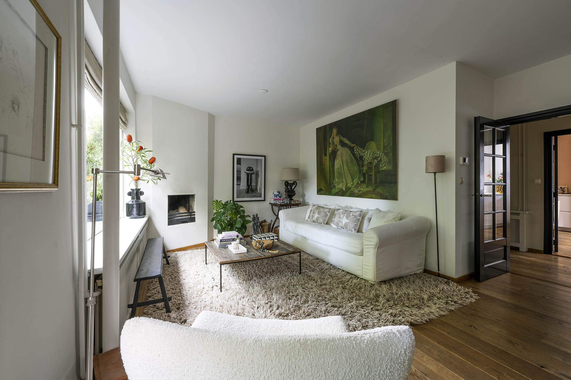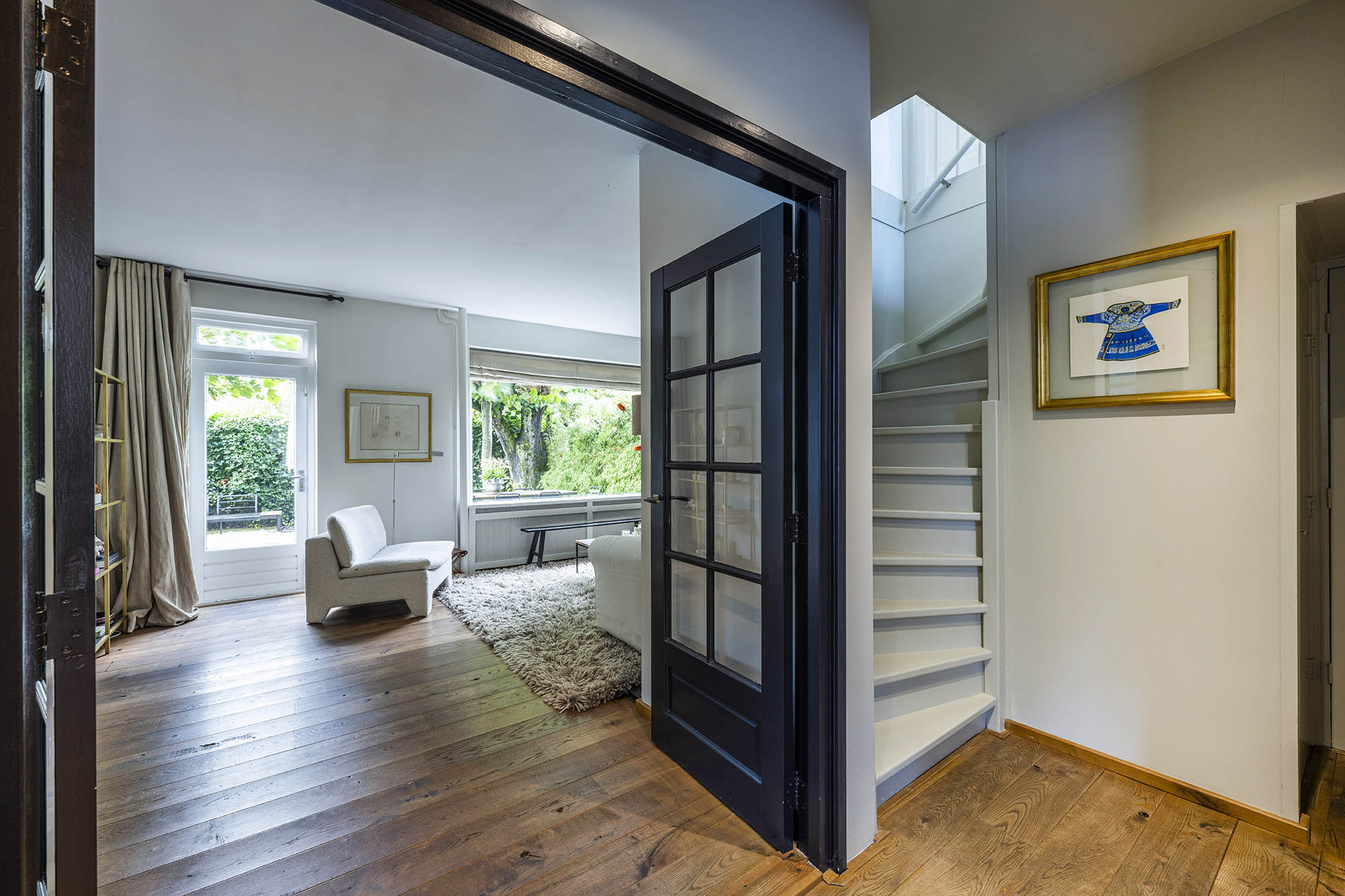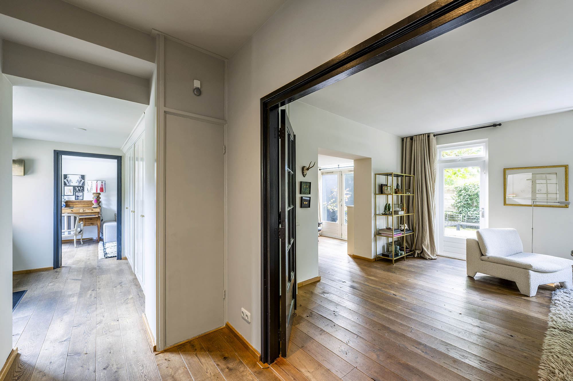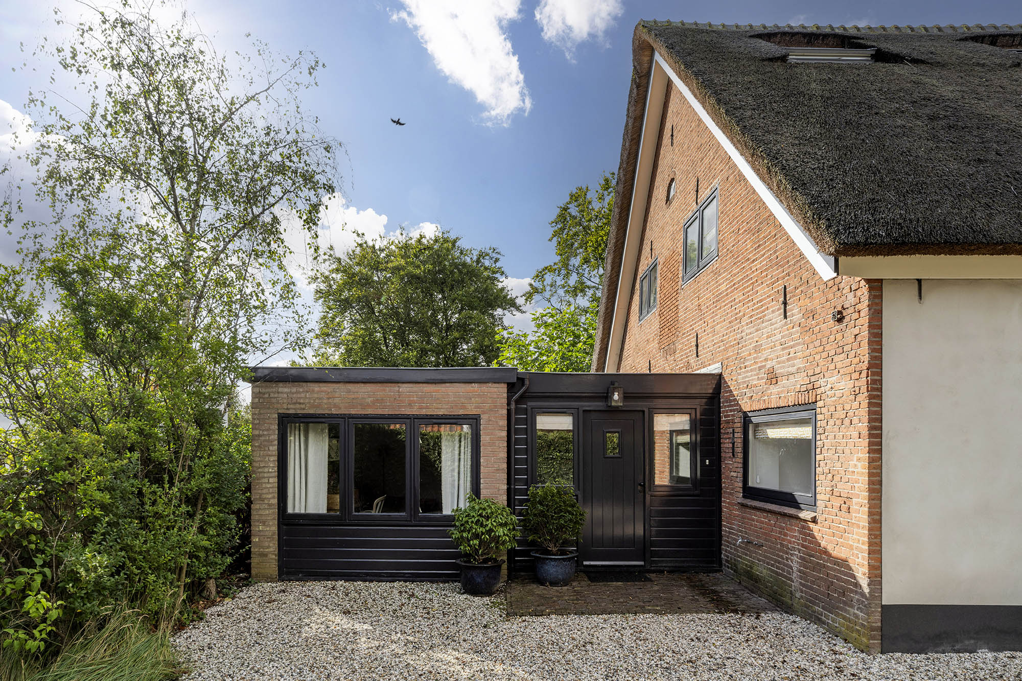 Das Familienhaus in Laren liegt ruhig hinter der Fassade eines reetgedeckten Bauernhauses, das nur über einen diskreten Kiesweg erreichbar ist. Diese abgeschiedene Lage bietet eine ausgewogene Kombination aus Privatsphäre und Komfort mit großzügigen Parkmöglichkeiten auf dem Grundstück sowie Zugang zum Ortszentrum. Schon beim Betreten des Hauses verspürt man ein Raumgefühl, das an diesem Standort selten zu finden ist. Das Wohnzimmer erstreckt sich über die gesamte Breite des Hauses und empfängt dank französischer Türen viel Licht, was einen fließenden Übergang in den sonnigen Garten mit Schatten spendenden Platanen schafft. Ein Kamin bildet den Mittelpunkt des Raumes, während eine separate Arbeitsecke Funktionalität und Wohnkomfort ergänzt. Die moderne, hochwertig ausgestattete Wohnküche sowie das separate Fernsehzimmer tragen zu einem entspannten Alltag bei. Im Obergeschoss sind drei Schlafzimmer durchdacht angeordnet, darunter ein Raum, der für die Wäsche genutzt wird. Das elegante Badezimmer ist mit Badewanne, Waschtisch und WC ausgestattet. Eine feste Treppe führt ins oberste Geschoss, wo sich die Master Suite mit maßgefertigtem Schrank und eigenem Bad als privater Rückzugsort präsentiert. Flexibilität ist das Herzstück dieser Immobilie: Der großzügige Grundriss erlaubt Schlafmöglichkeiten im Erdgeschoss und macht das Haus generationenübergreifend nutzbar. Das Haus umfasst 157 m² Wohnfläche auf einem 310 m² großen Grundstück sowie natürliche Belüftung, gedämmte Dächer und Böden, teilweise doppelt verglaste Fenster und Komfort der Energieklasse C. Alle Annehmlichkeiten des Ortes sind schnell erreichbar, während Wald und offene Landschaft nur eine kurze Radtour entfernt liegen. Für alle, die ein vielseitiges und einladendes Zuhause im Herzen von Laren suchen, bietet dieses Familienhaus diskreten Charme und ruhigen Luxus.