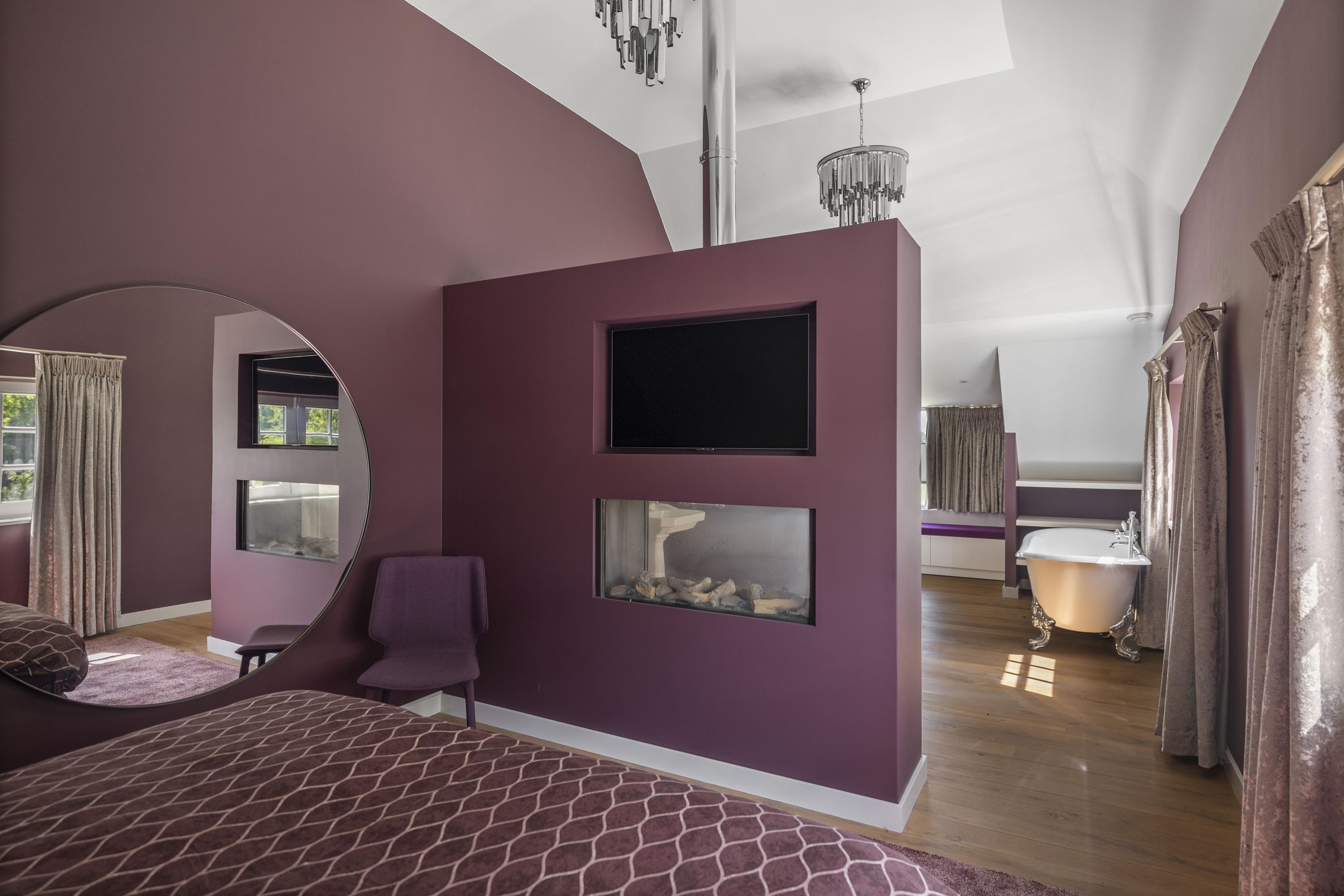 The light-filled landing leads to three bedrooms, two of which are suites with their own bathrooms. The master suite evokes the feel of a boutique hotel, complete with walk-in wardrobe and integrated bathroom with bath, walk-in shower, and twin basins. Indulging in the freestanding bath becomes all the more blissful when you light the glass-fronted fireplace. The landing also includes storage cupboards and a separate Geberit AquaClean WC.