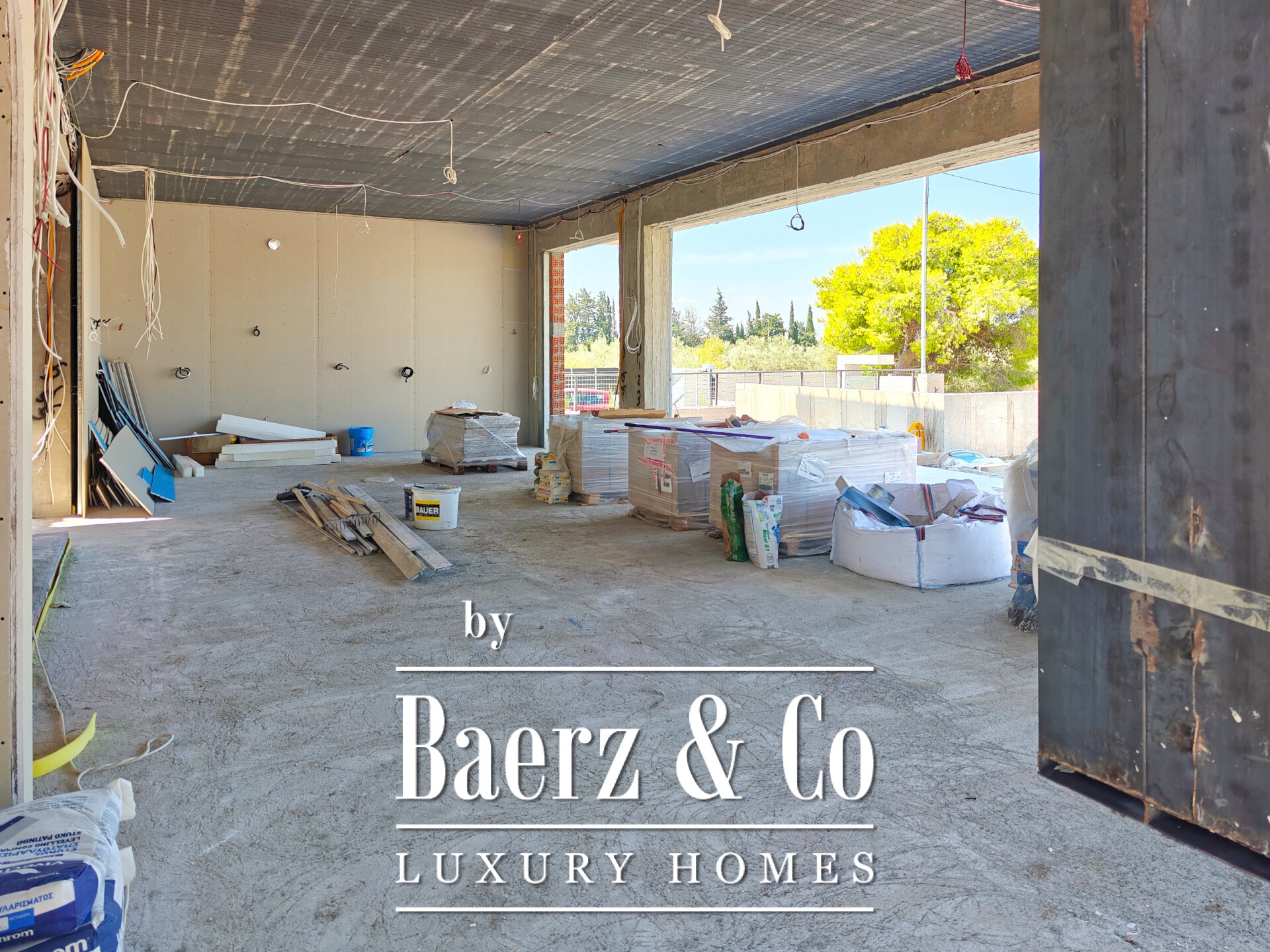 In the most privileged location of Loutraki, a rare, high-specification detached house is presented, on a 530 sq.m. plot, with panoramic, unobstructed views of greenery, the sea, and the mountainous horizon. The residence, on three levels (basement – elevated ground floor – 1st floor), with a total area of 412 sq.m., ideally combines the tranquility of a quiet neighborhood with direct access to the beach, public transport, schools, a church, a supermarket, and dining and entertainment venues. Its orientation (Northwest) ensures natural light throughout the day and delightful sunsets.