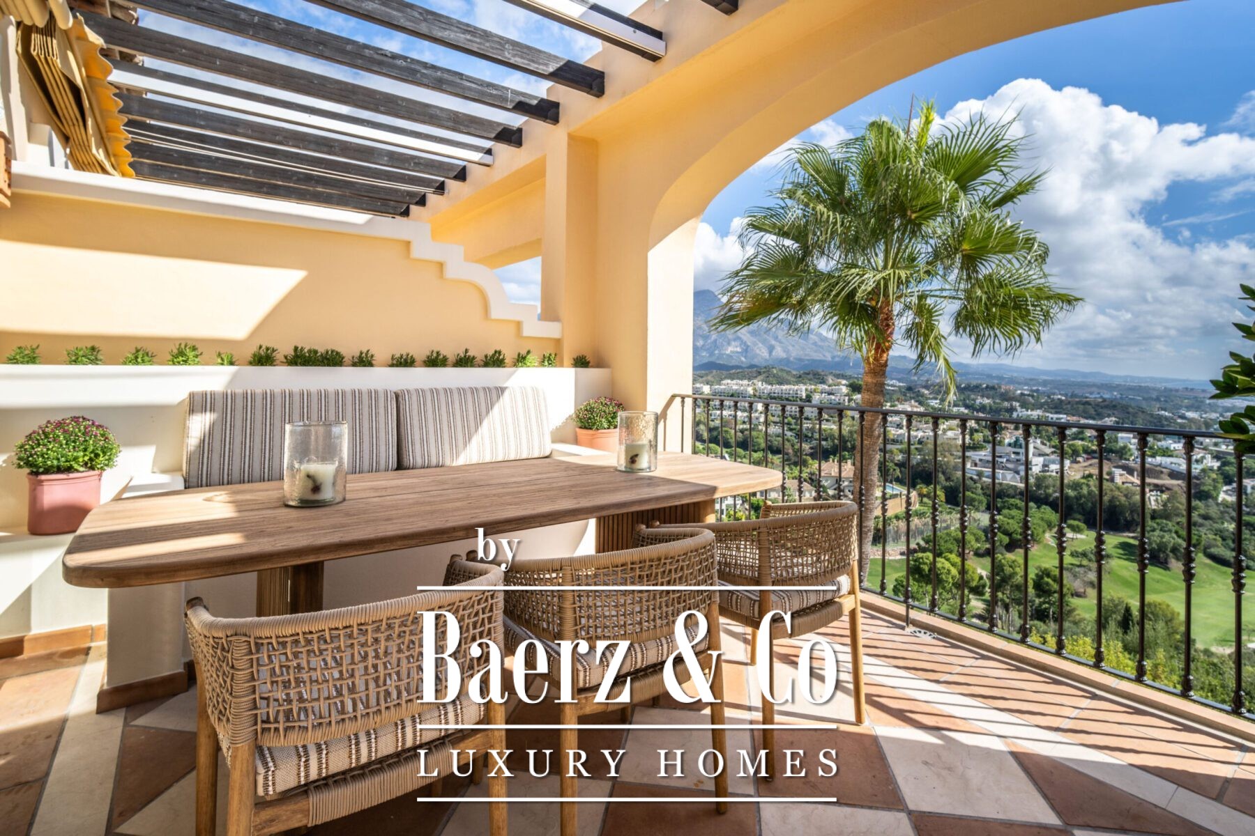 Dieses Penthouse in Marbella La Quinta krönt die Landschaft mit ununterbrochenem Blick über das Meer, die Berge und die smaragdgrünen Fairways des Golfplatzes. Die Terrassen laden zu ganzjährigem Wohnen ein, ihre Ausrichtung fängt die Ruhe des Sonnenaufgangs sowie das sanfte Licht des Abends ein – ideal für private Abendessen oder stille Rückzugsorte.