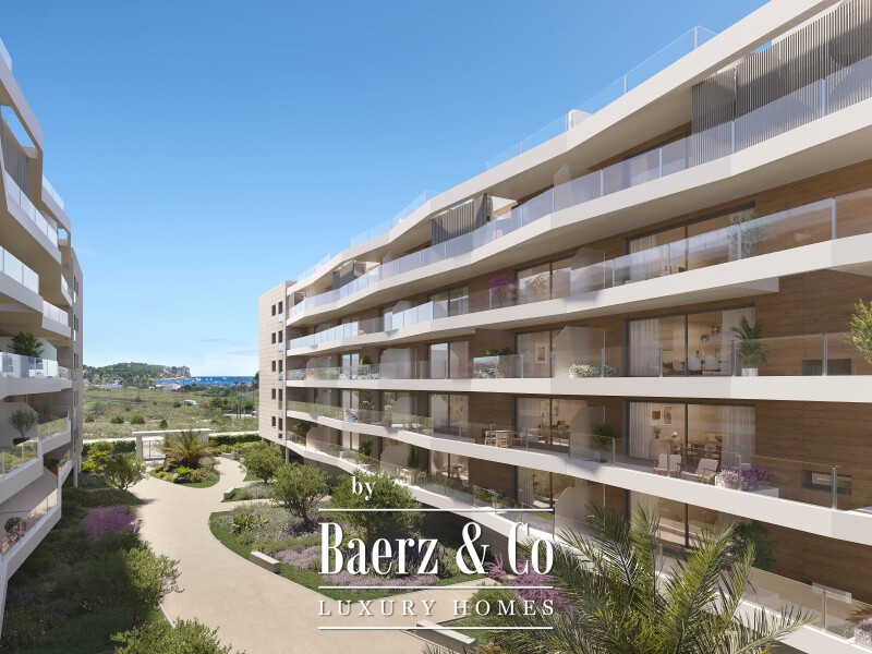 Fußbodenheizung sorgt für ganzjährigen Komfort, während Stellplatz und eigener Abstellraum praktische Vorteile bieten. Der Gemeinschaftspool befindet sich in geschmackvoll angelegten Gartenbereichen, die zum stillen Verweilen oder entspannten Beisammensein einladen. Vom Apartment eröffnet sich ein sorgfältig inszenierter Blick auf das Mittelmeer und die umliegenden Berge und schafft so eine Verbindung zwischen modernem Leben und der ikonischen Landschaft Ibizas.