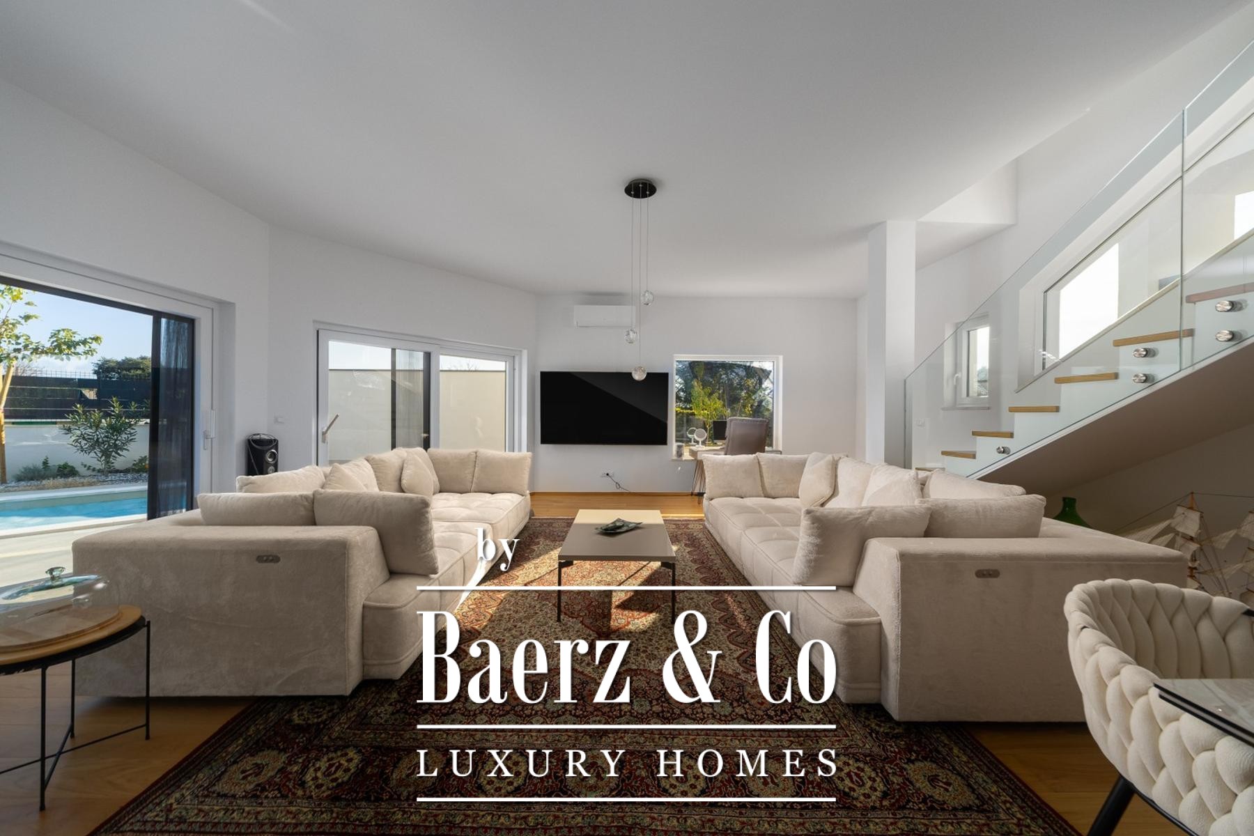 Das elegante Layout der Villa verteilt sich auf zwei Etagen. Im Erdgeschoss befindet sich ein großzügiges Wohnzimmer mit raumhohen Glaswänden, die viel Tageslicht hereinlassen und zu einer überdachten Terrasse führen. Direkt daneben liegt ein beeindruckender Pool von 3 mal 23 Metern, umgeben vom üppigen mediterranen Garten. Eine moderne Küche mit Essbereich, ein Technikraum und ein stilvolles Gäste-WC vervollständigen diese Ebene. Für behagliche Abende sorgt ein Kamin.