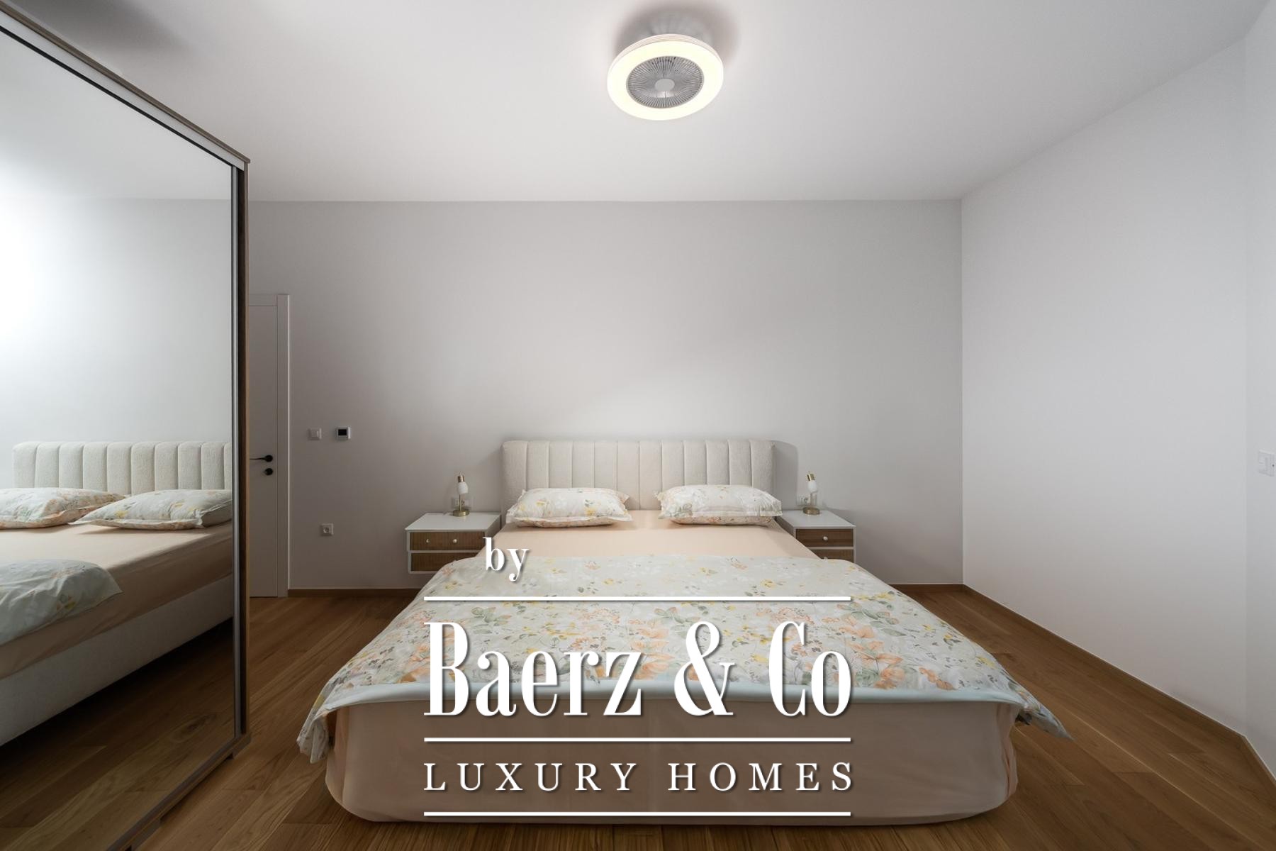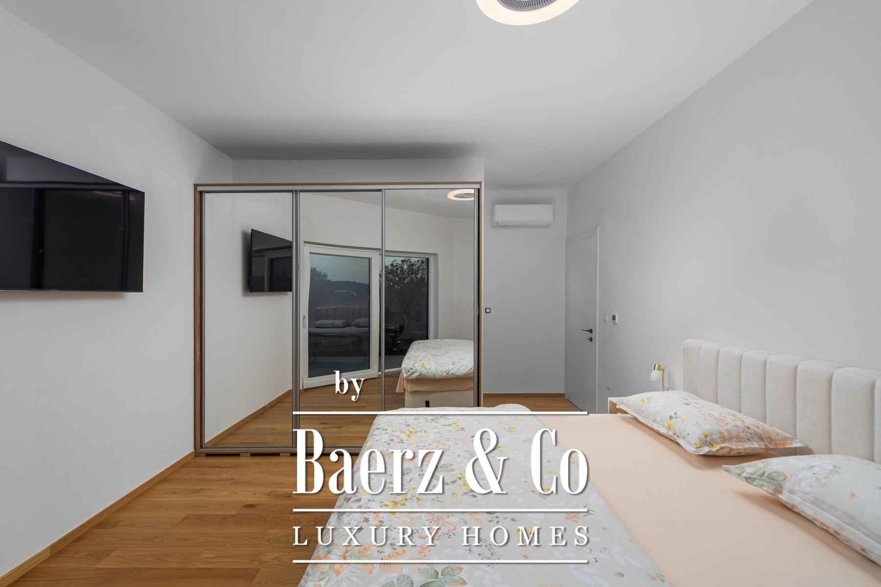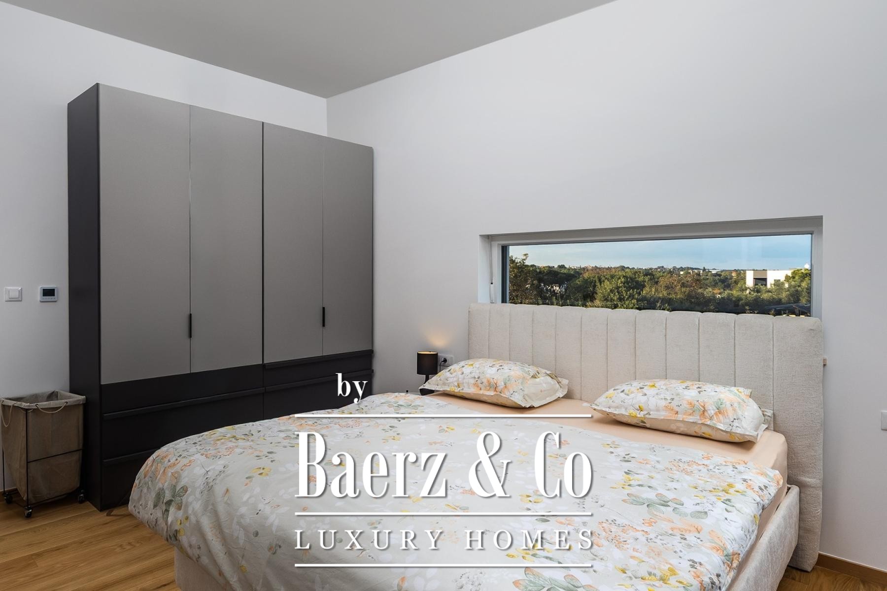 Im Obergeschoss öffnen drei großzügige Schlafzimmer ihre Terrassen mit Blick auf den Pool und das satte Grün; edles Eichenparkett und Bosch-Klimaanlagen schaffen höchsten Wohnkomfort. Zwei stilvolle Badezimmer bieten Privatsphäre und modernen Komfort. Die Ost-, Süd- und Westausrichtung garantiert ganztägig lichtdurchflutete Innenräume.