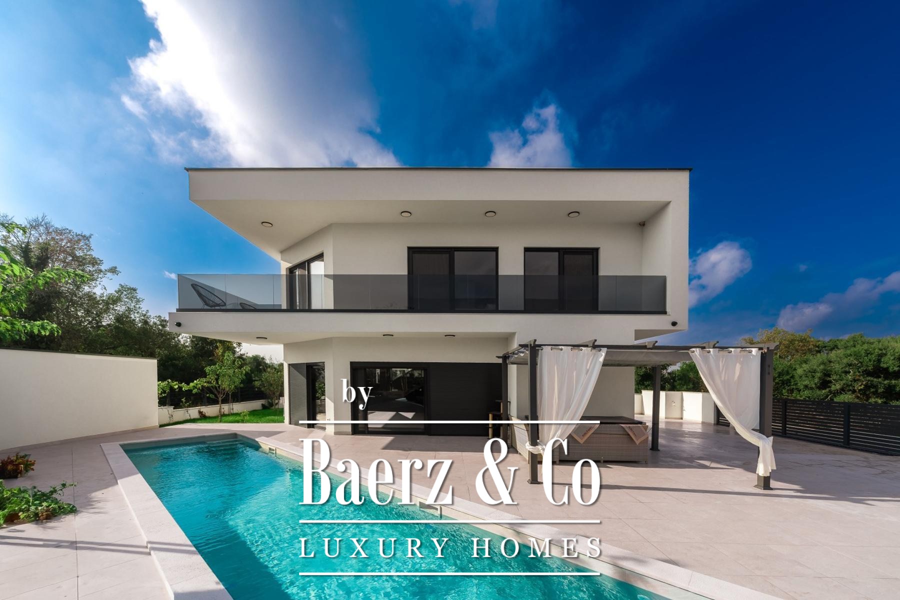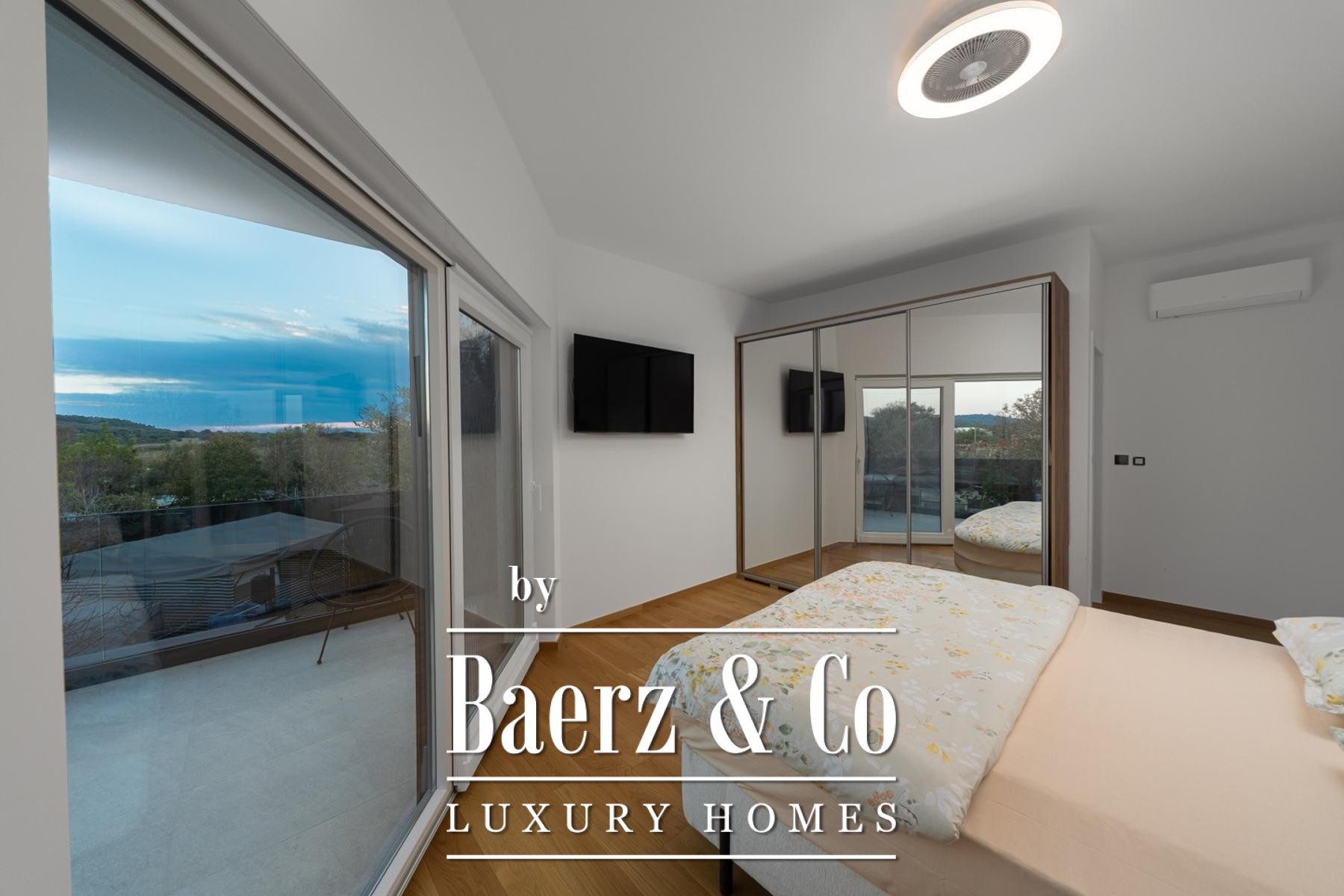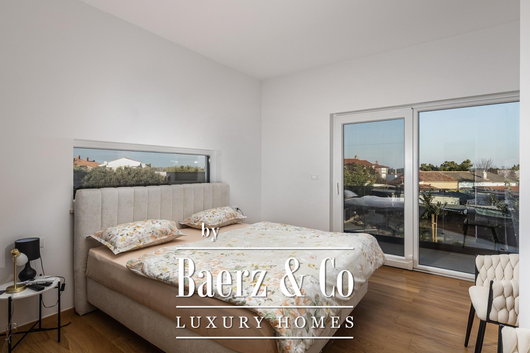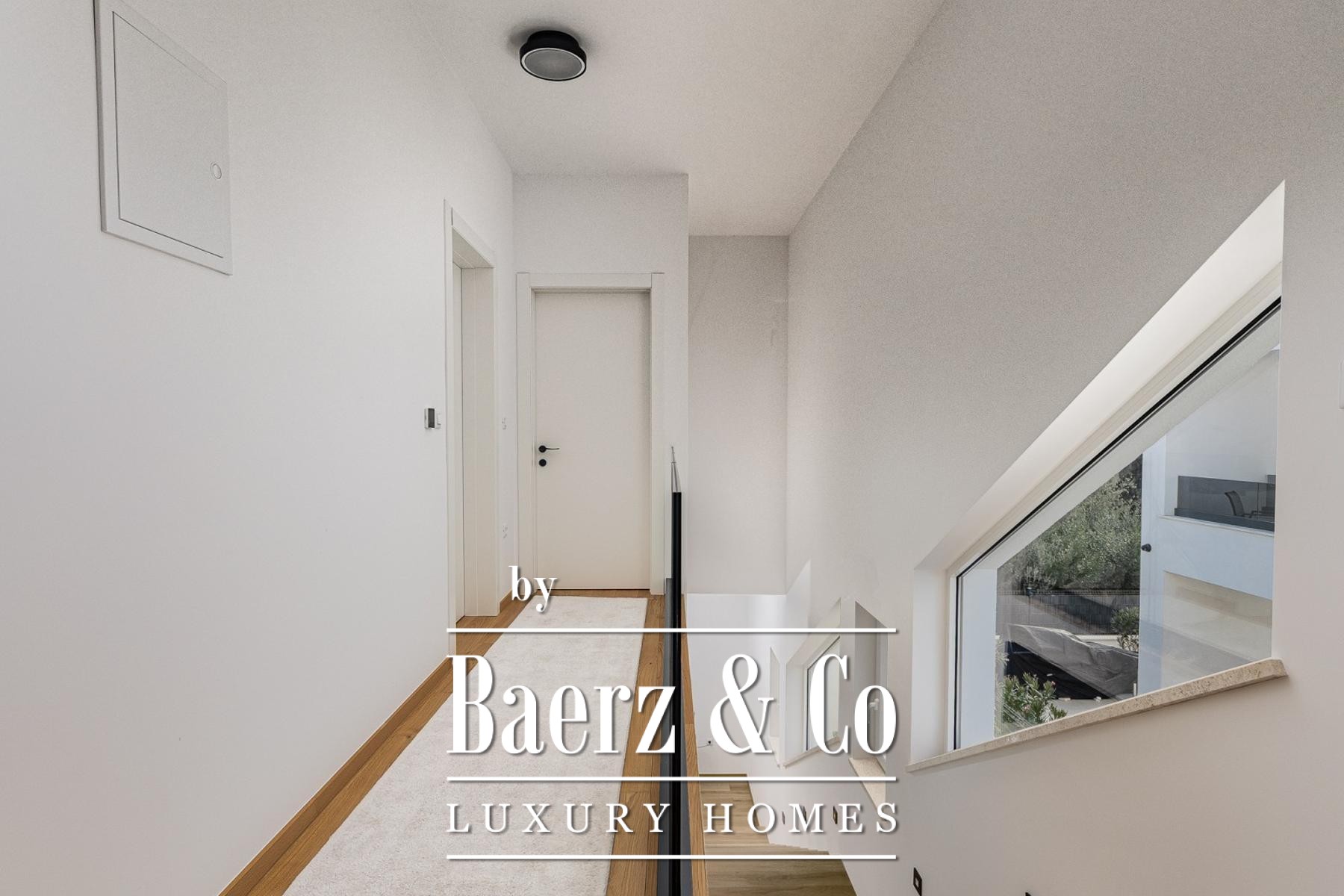 Im Obergeschoss öffnen drei großzügige Schlafzimmer ihre Terrassen mit Blick auf den Pool und das satte Grün; edles Eichenparkett und Bosch-Klimaanlagen schaffen höchsten Wohnkomfort. Zwei stilvolle Badezimmer bieten Privatsphäre und modernen Komfort. Die Ost-, Süd- und Westausrichtung garantiert ganztägig lichtdurchflutete Innenräume.