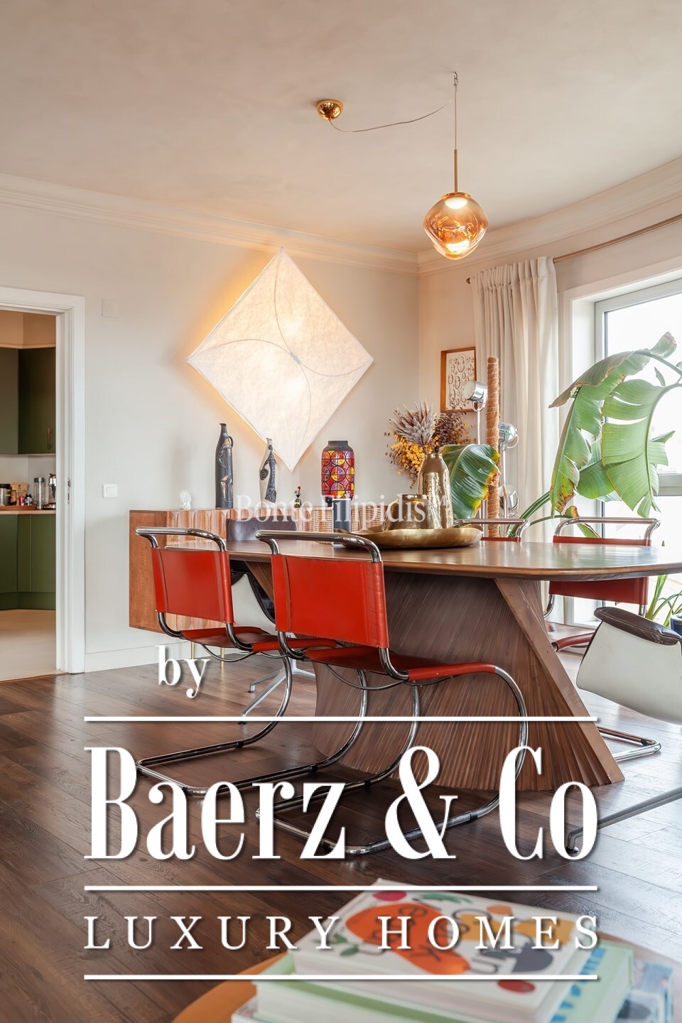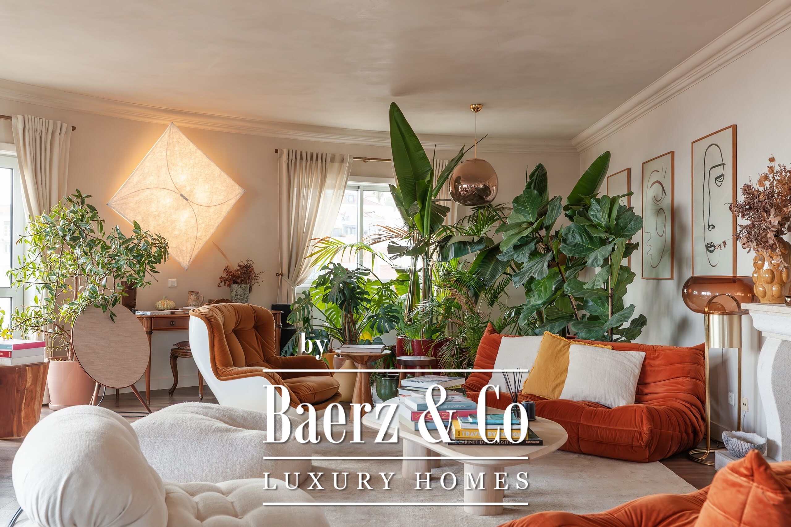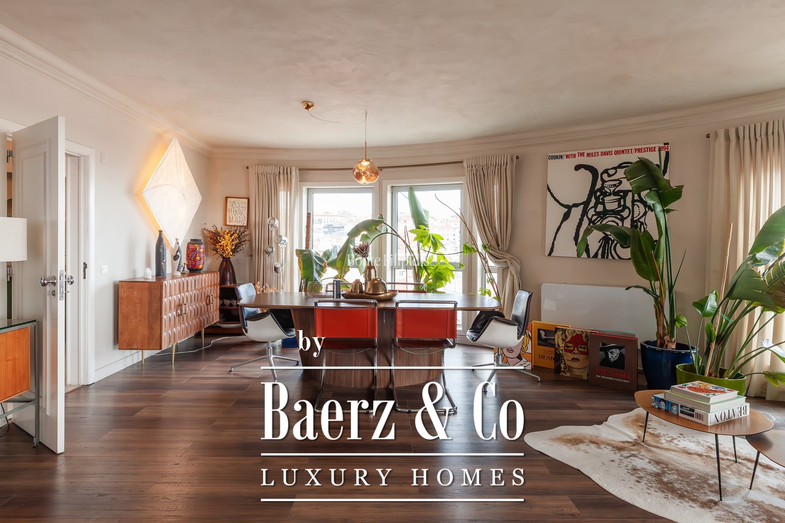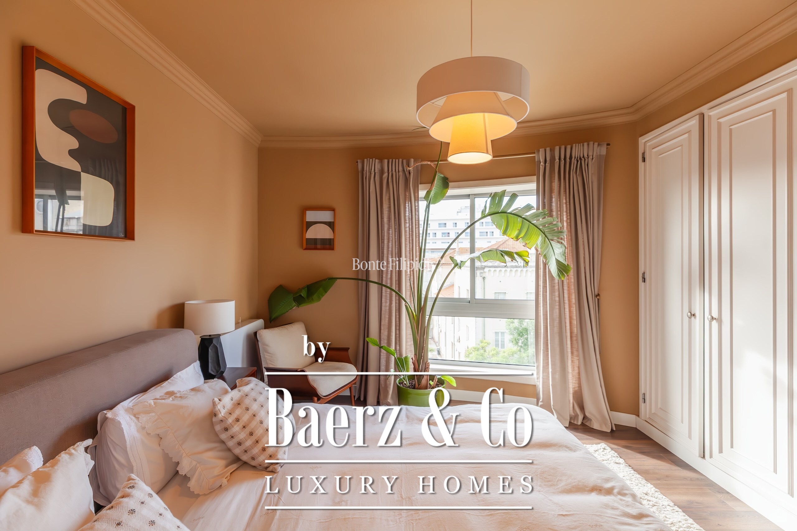 Die vier Schlafzimmer zeichnen sich durch eine diskrete Großzügigkeit aus und werden durch drei vollwertige Bäder ergänzt. Die Wohnung verbindet traditionelle Lissabonner Eleganz – hohe Decken, Holzböden, originale Details – mit durchdachtem modernen Komfort. Das Gebäude bietet Aufzug, gesicherte Parkmöglichkeiten und durchdachte Annehmlichkeiten.