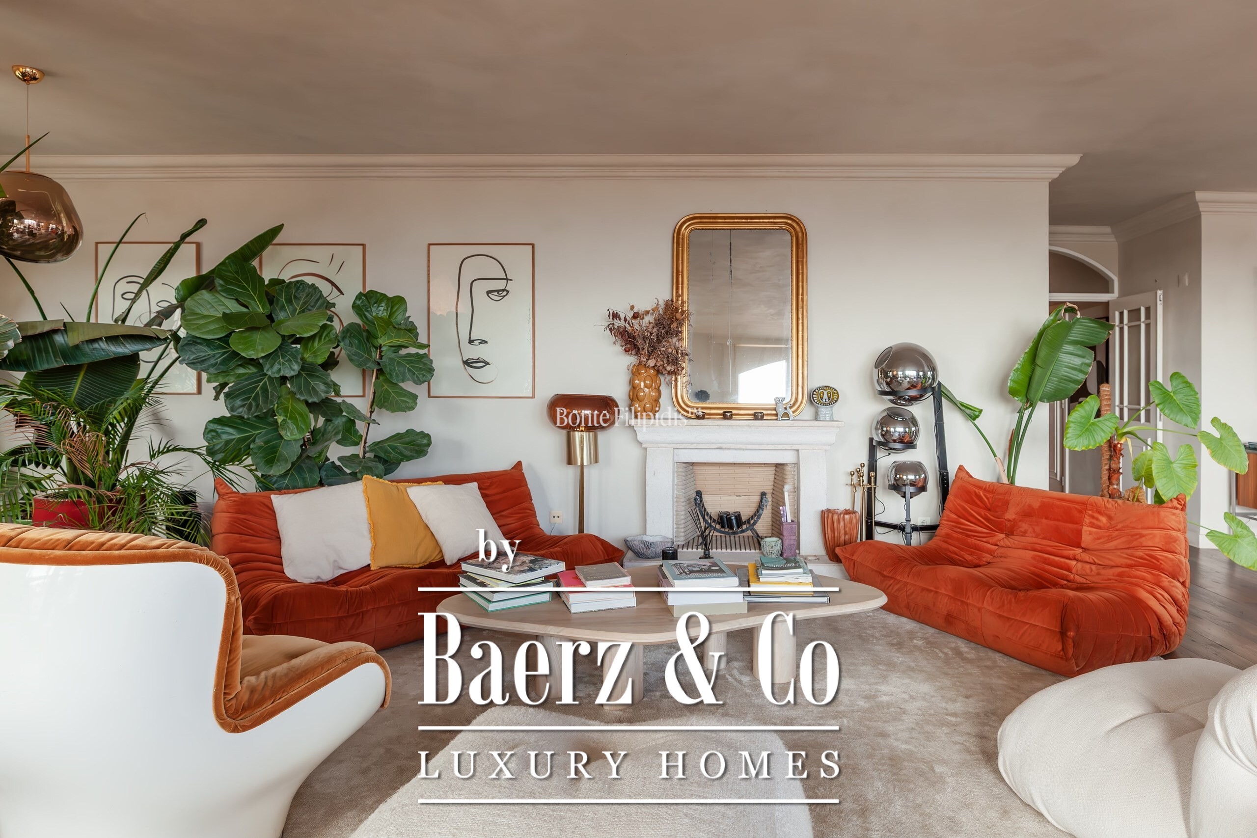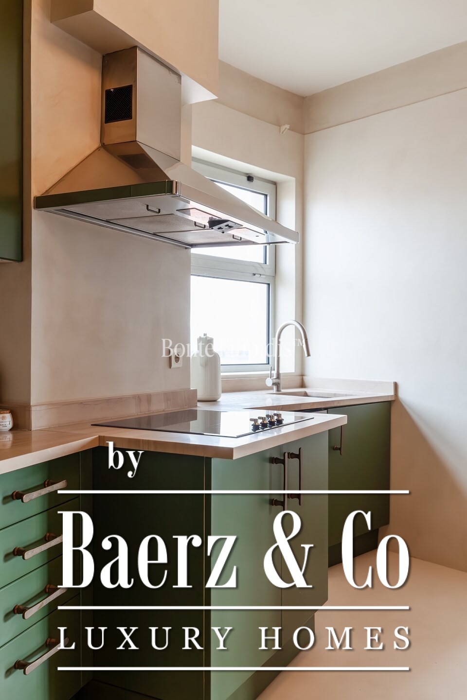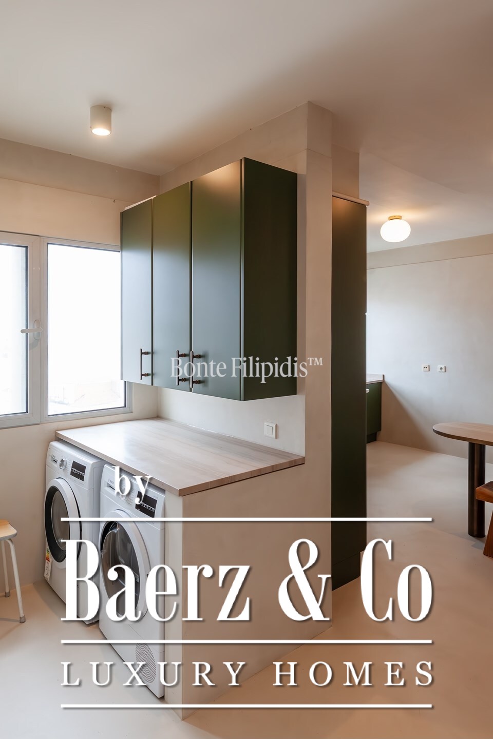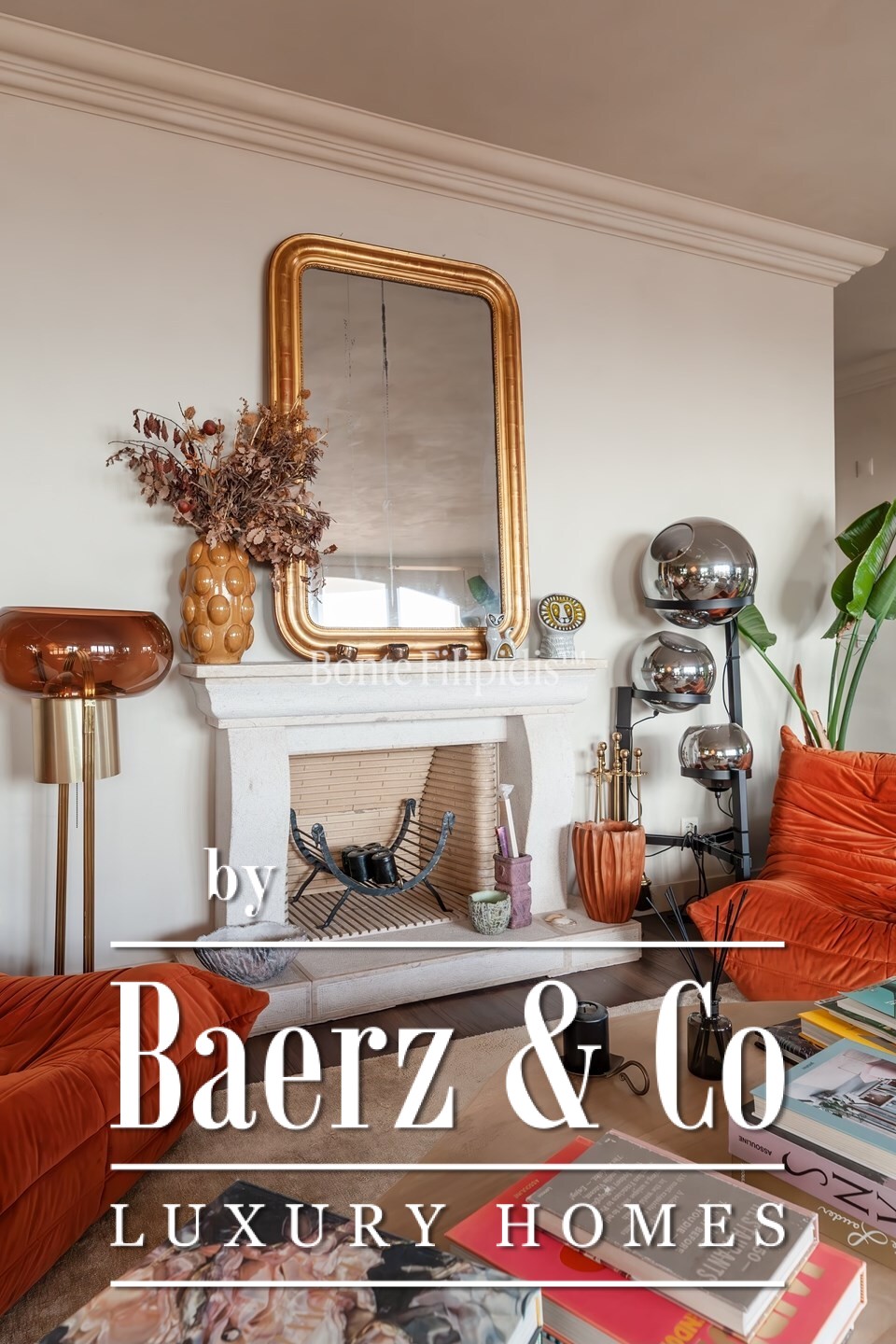 Große Fenster im Wohn- und Essbereich eröffnen einen beruhigenden Blick auf den Fluss und führen auf einen großzügigen Balkon, wodurch Innen- und Außenräume harmonisch miteinander verbunden werden. Ein Kamin bildet den Mittelpunkt des Raumes und schafft an kühleren Abenden in Lissabon eine behagliche Atmosphäre und einen Ort der Begegnung. Die Küche ist mit hochwertigen, modernen Geräten und einer integrierten Waschküche ausgestattet, die Funktionalität und Diskretion vereint.