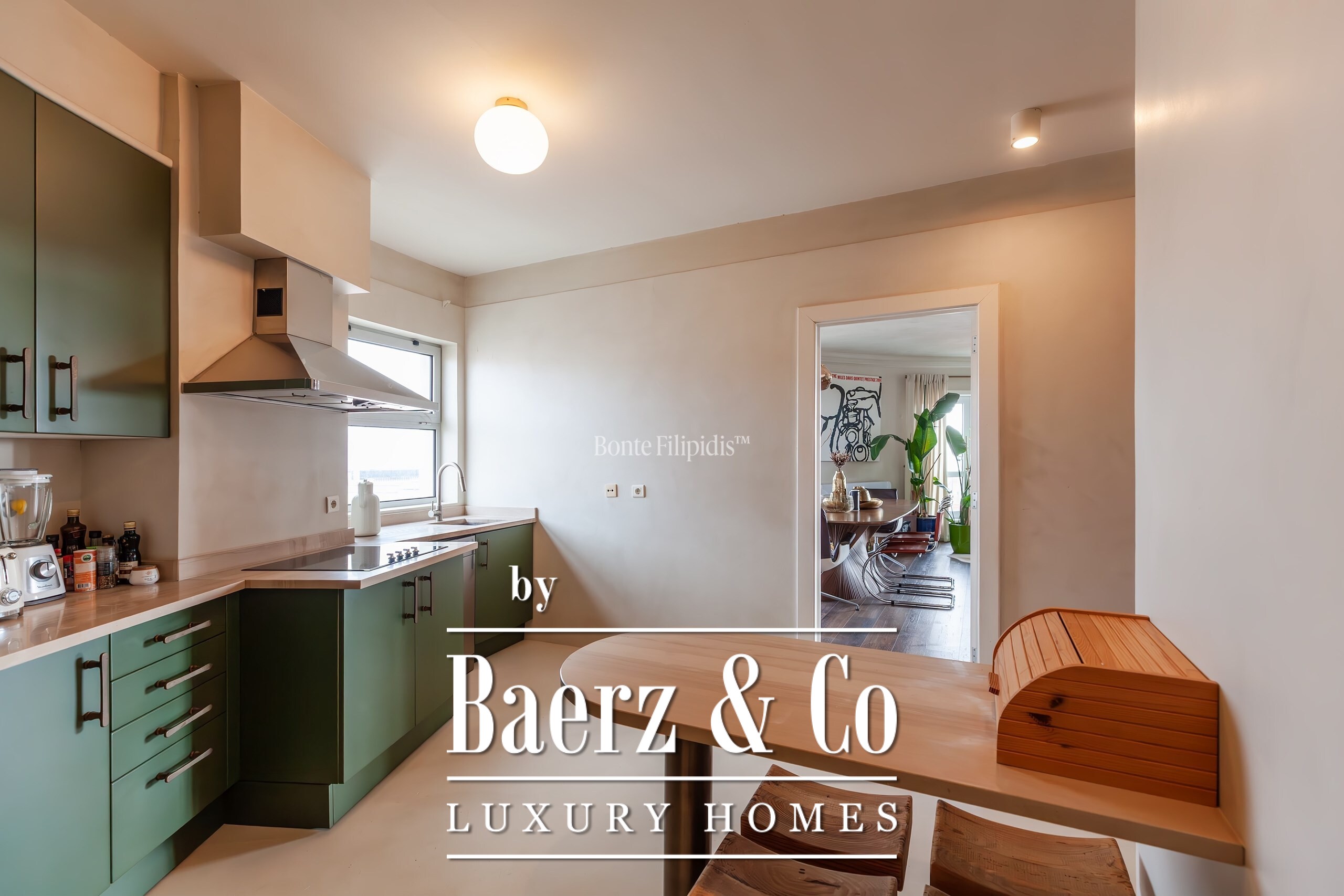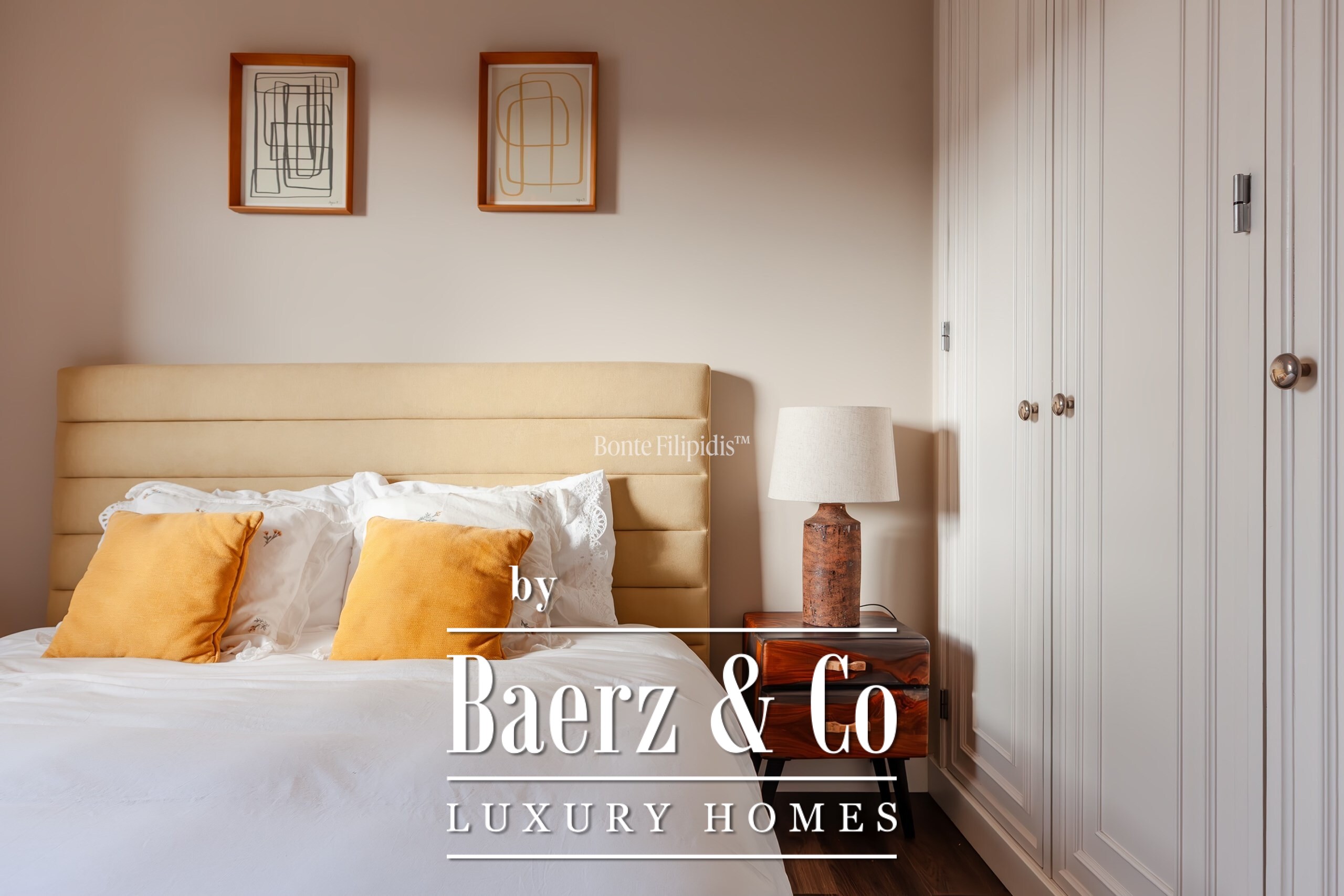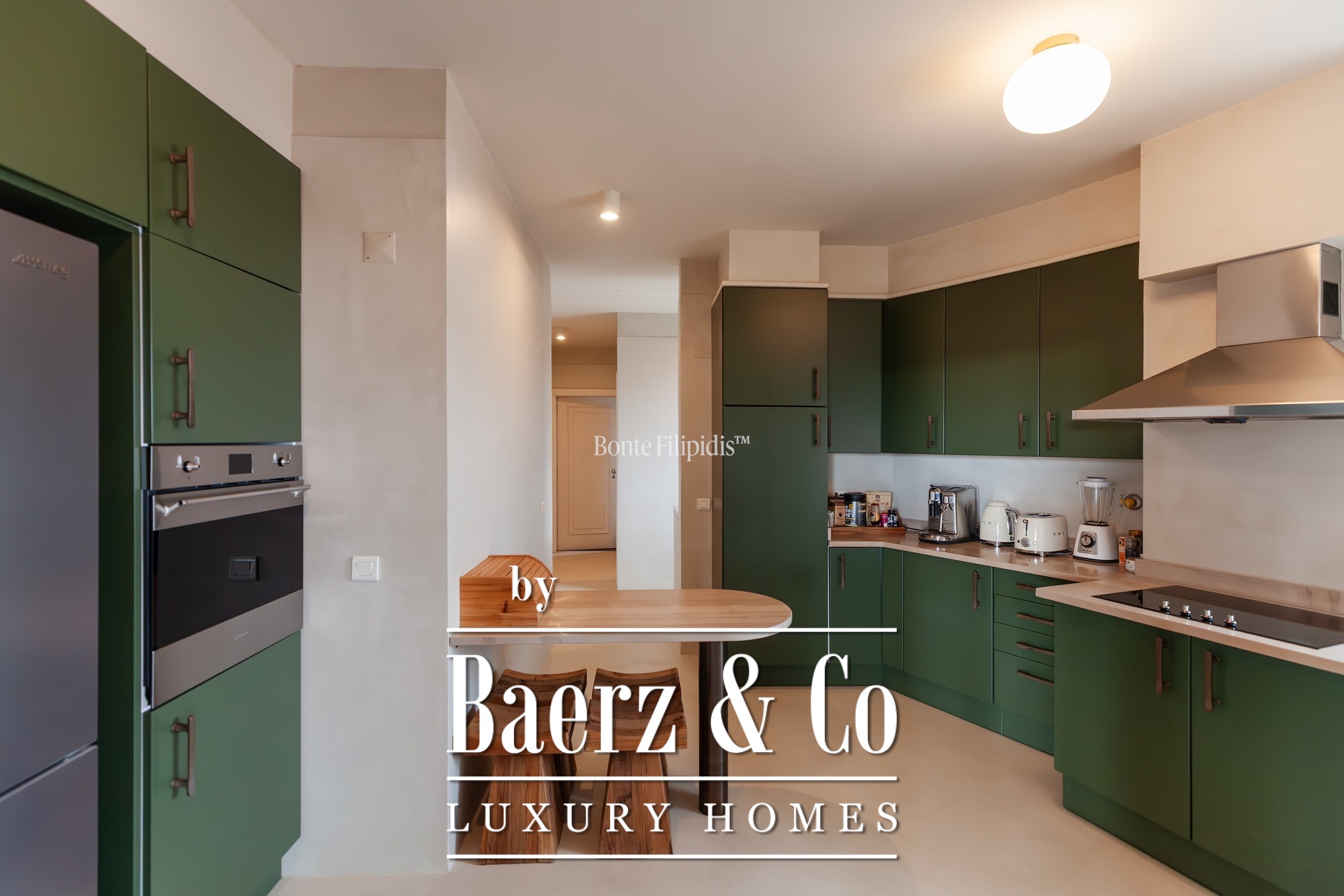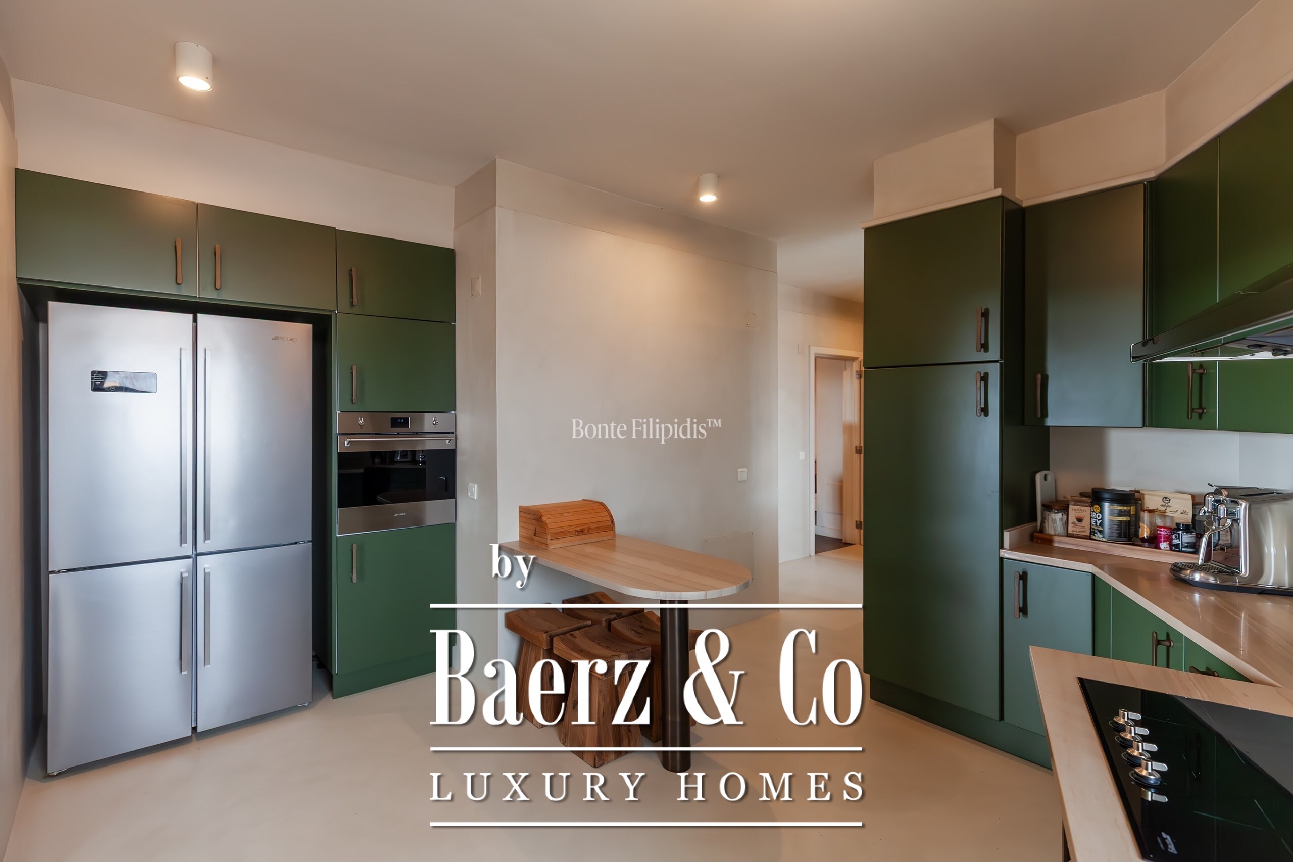 Große Fenster im Wohn- und Essbereich eröffnen einen beruhigenden Blick auf den Fluss und führen auf einen großzügigen Balkon, wodurch Innen- und Außenräume harmonisch miteinander verbunden werden. Ein Kamin bildet den Mittelpunkt des Raumes und schafft an kühleren Abenden in Lissabon eine behagliche Atmosphäre und einen Ort der Begegnung. Die Küche ist mit hochwertigen, modernen Geräten und einer integrierten Waschküche ausgestattet, die Funktionalität und Diskretion vereint.