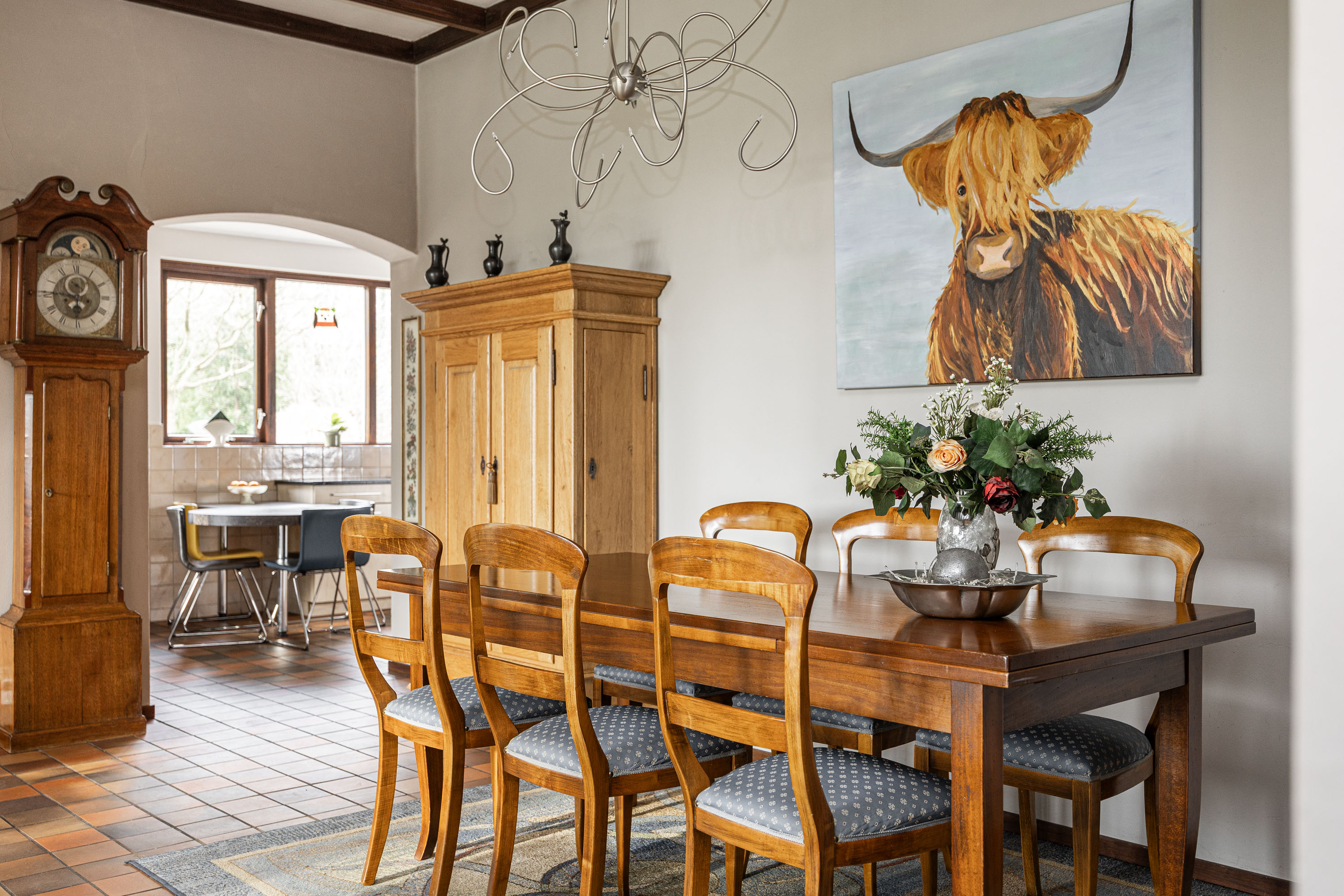 Im hinteren Bereich des Grundstücks befindet sich ein separates Gästehaus mit 50 m² Wohnfläche und zwei Schlafzimmern, das seit 2018 für die Freizeitnutzung genehmigt ist – perfekt für Besucher oder als Feriendomizil. Weitere Nebengebäude umfassen zwei Pferdeställe, eine Garage, einen Carport und umfangreiche Lagerräume. Der angelegte Garten bietet alten Baumbestand, weitläufige Rasenflächen und mehrere Terrassen mit Rückzugsorten in Sonne oder Schatten.