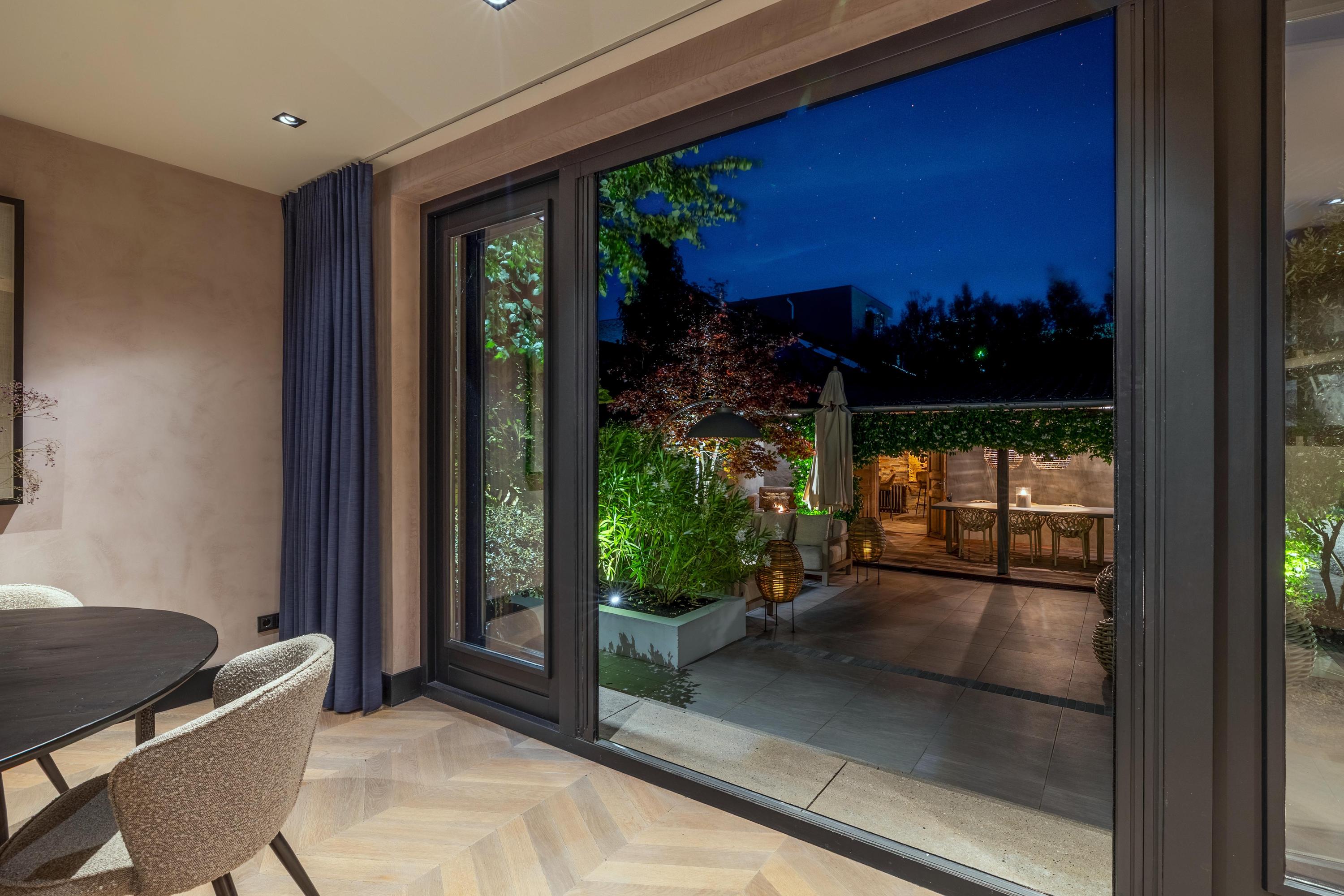 De begane grond biedt volop ruimte om te leven, te koken en te ontspannen. De inrichting is harmonieus, met aandacht voor detail – van de perfecte verlichting tot aan de luxueus uitgevoerde afwerking van vloeren, wanden en ingebouwde elementen. Alles draagt bij aan een sfeer van ingetogen luxe.