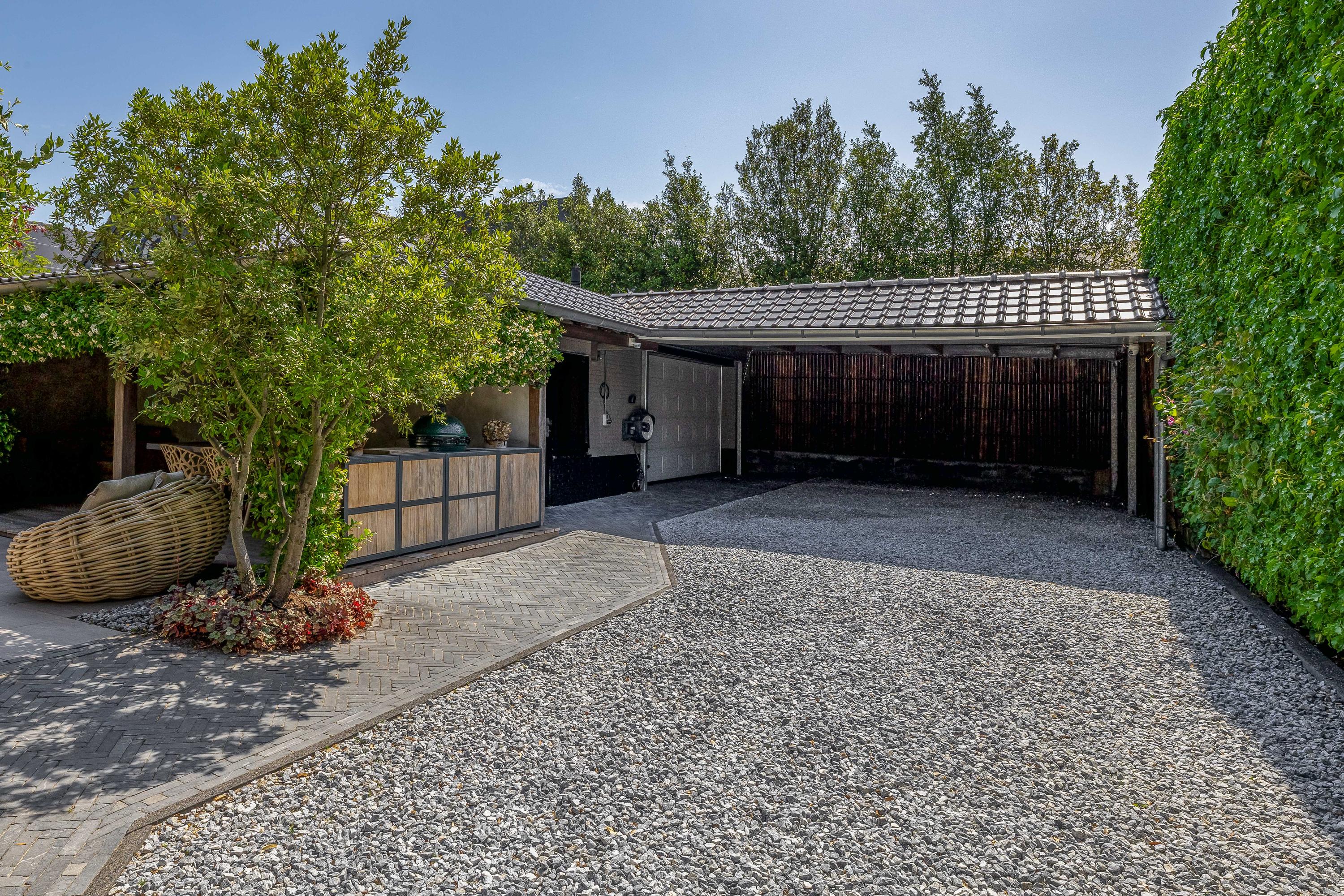 De luxe ervaring wordt doorgetrokken in het bijgebouw, ingericht als comfortabele lounge met bar en eigen toilet. Deze veelzijdige ruimte biedt volop mogelijkheden, zoals een hobbyruimte, thuiskantoor of plek om gasten te ontvangen. De hoogwaardige afwerking sluit perfect aan bij de woning en de tuin. In de royale, verwarmde garage en onder de riante carport is er voldoende ruimte voor meerdere luxe voertuigen. De elektrisch bedienbare toegangspoorten zorgen voor optimale veiligheid.