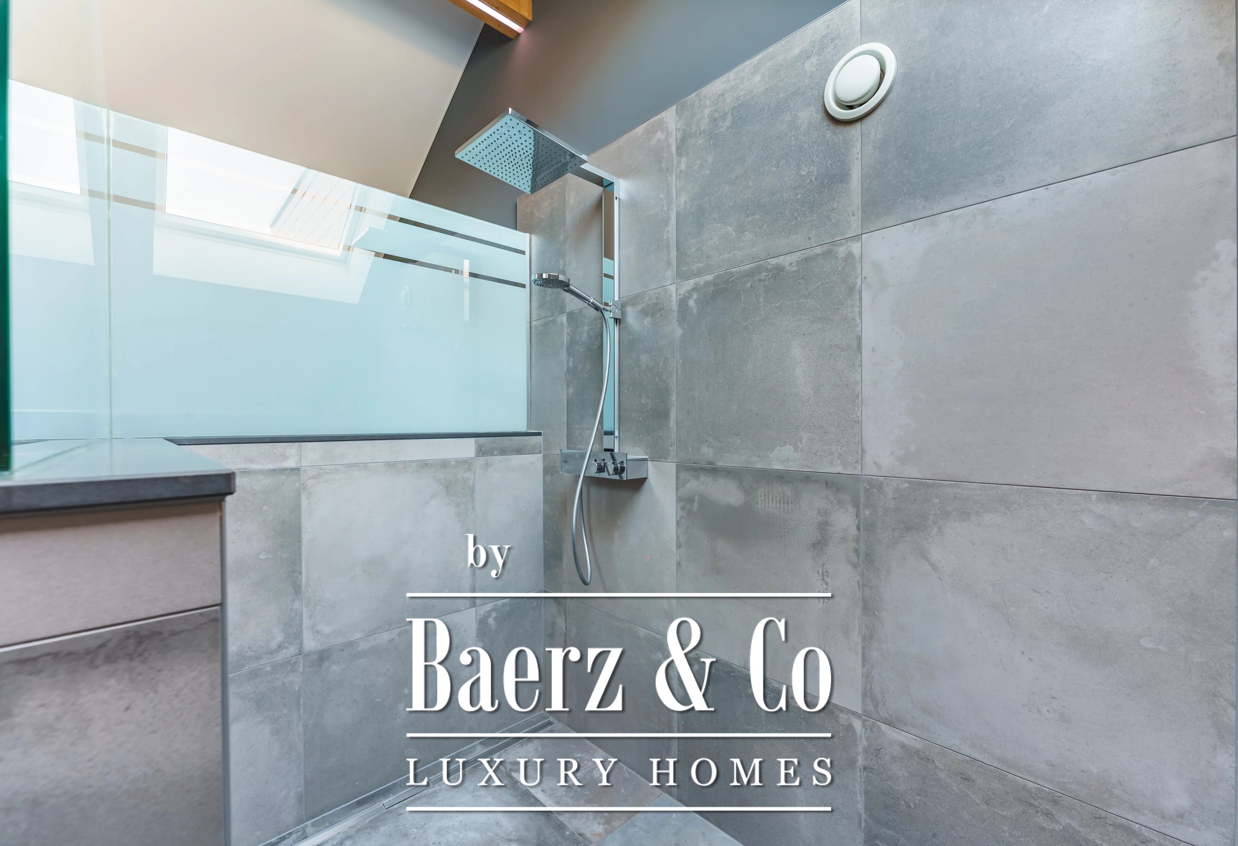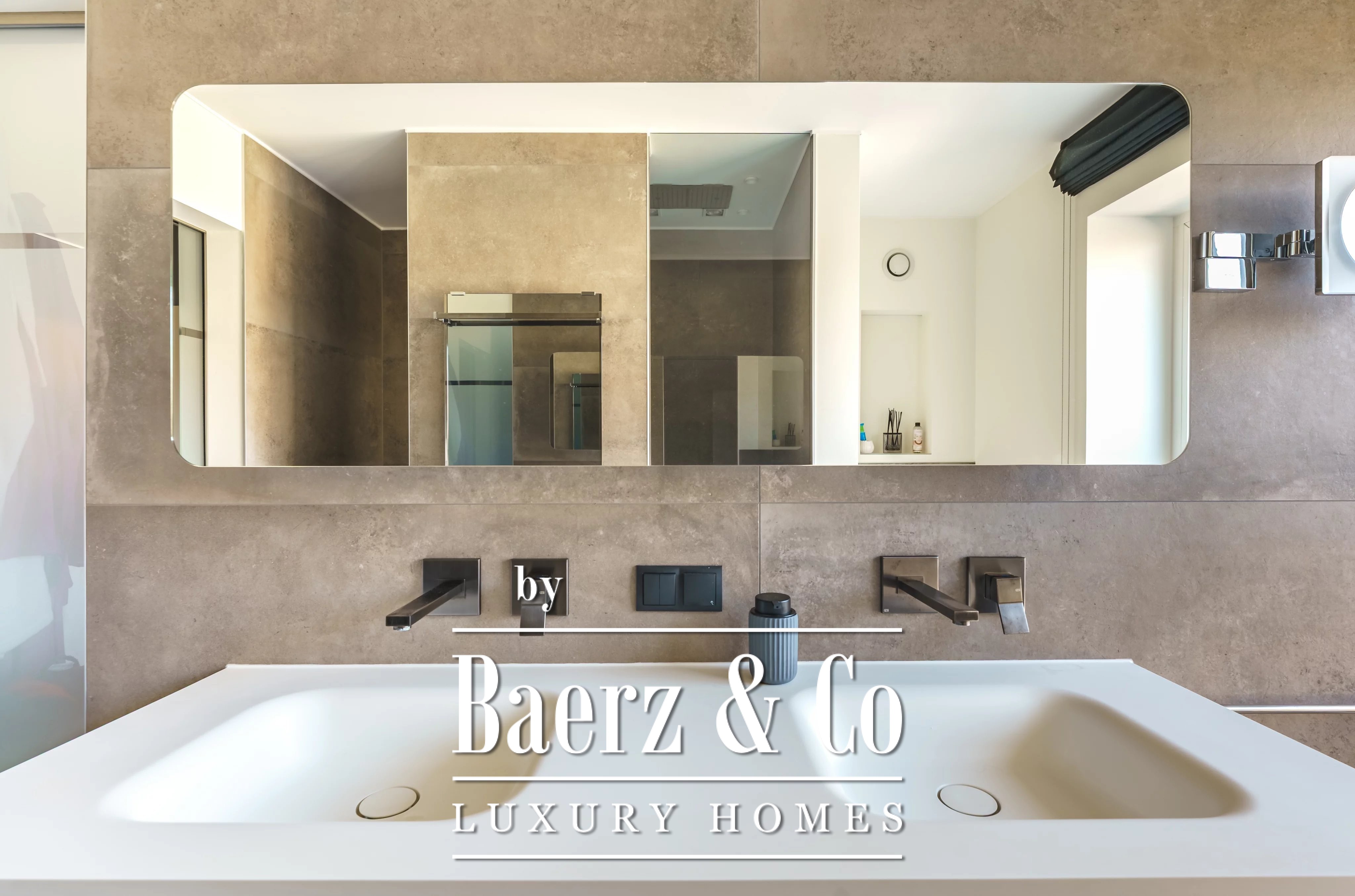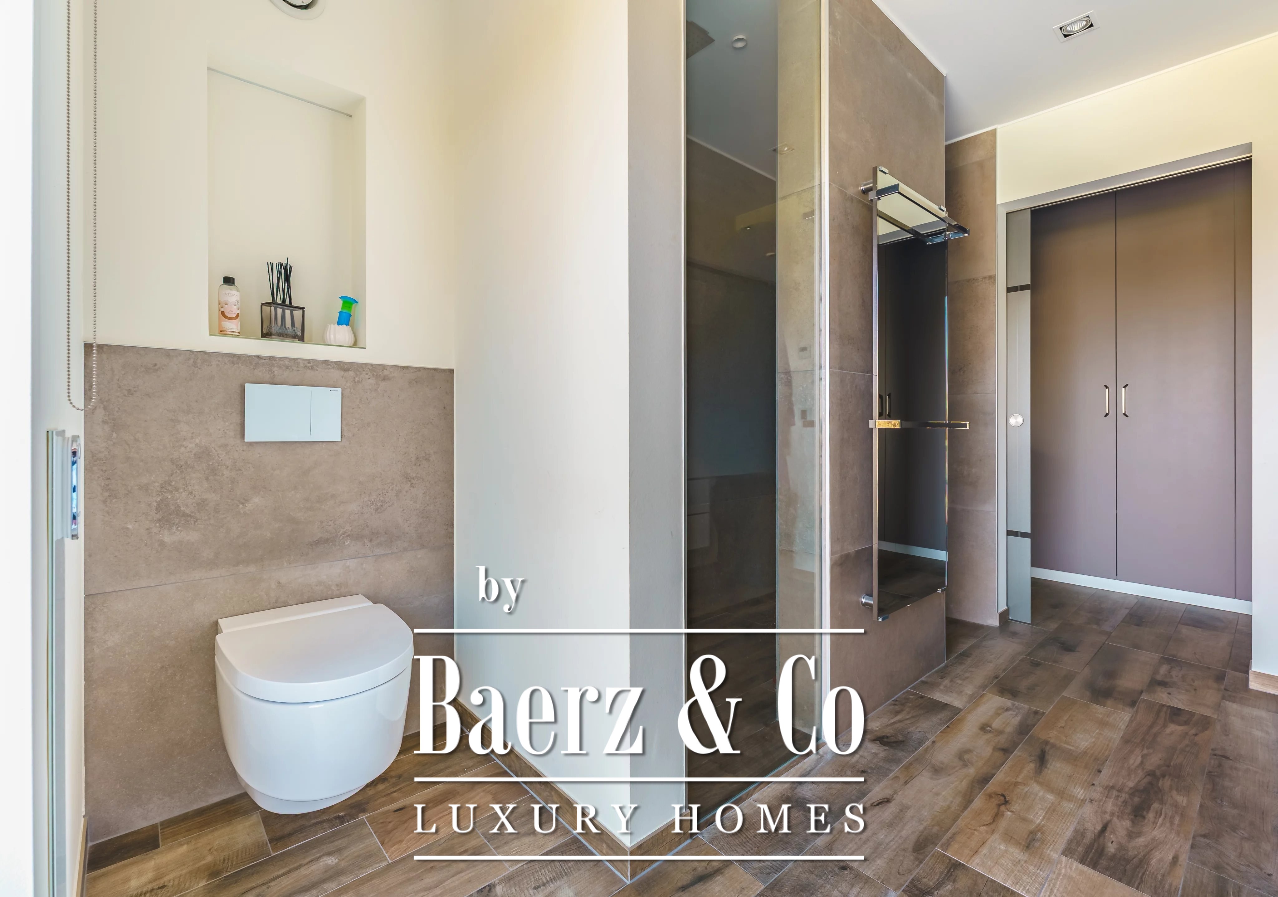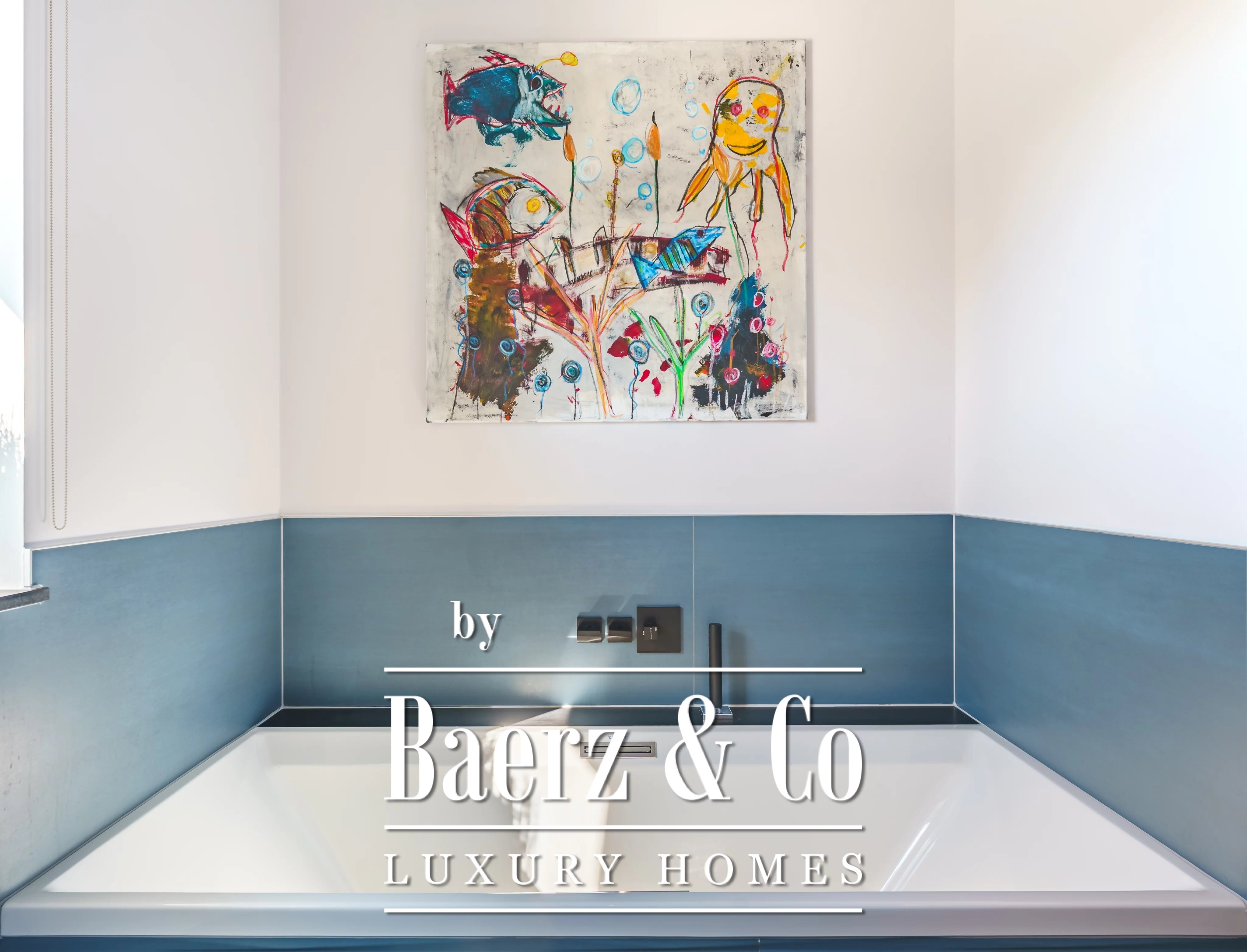 Im Obergeschoss schafft ein weiteres Wohnzimmer einen privaten Rückzugsort für die Familie. Es gibt fünf Schlafzimmer und vier Bäder, darunter eine Master-Suite mit Ankleidezimmer, eigenem Duschbad und ein Gästezimmer mit eigenem Bad. Der Hauswirtschaftsraum ist dezent und effizient und unterstützt den täglichen Komfort.