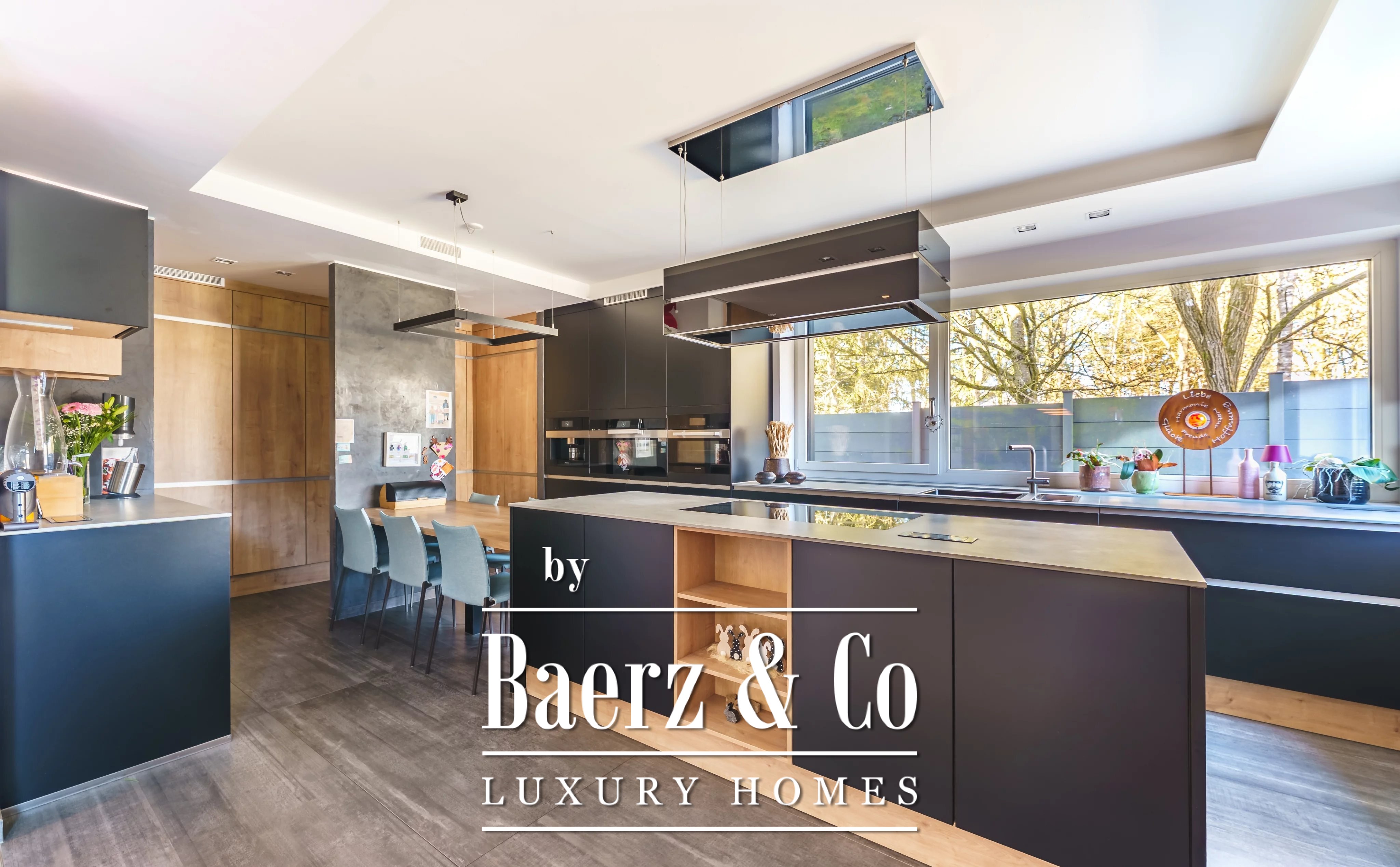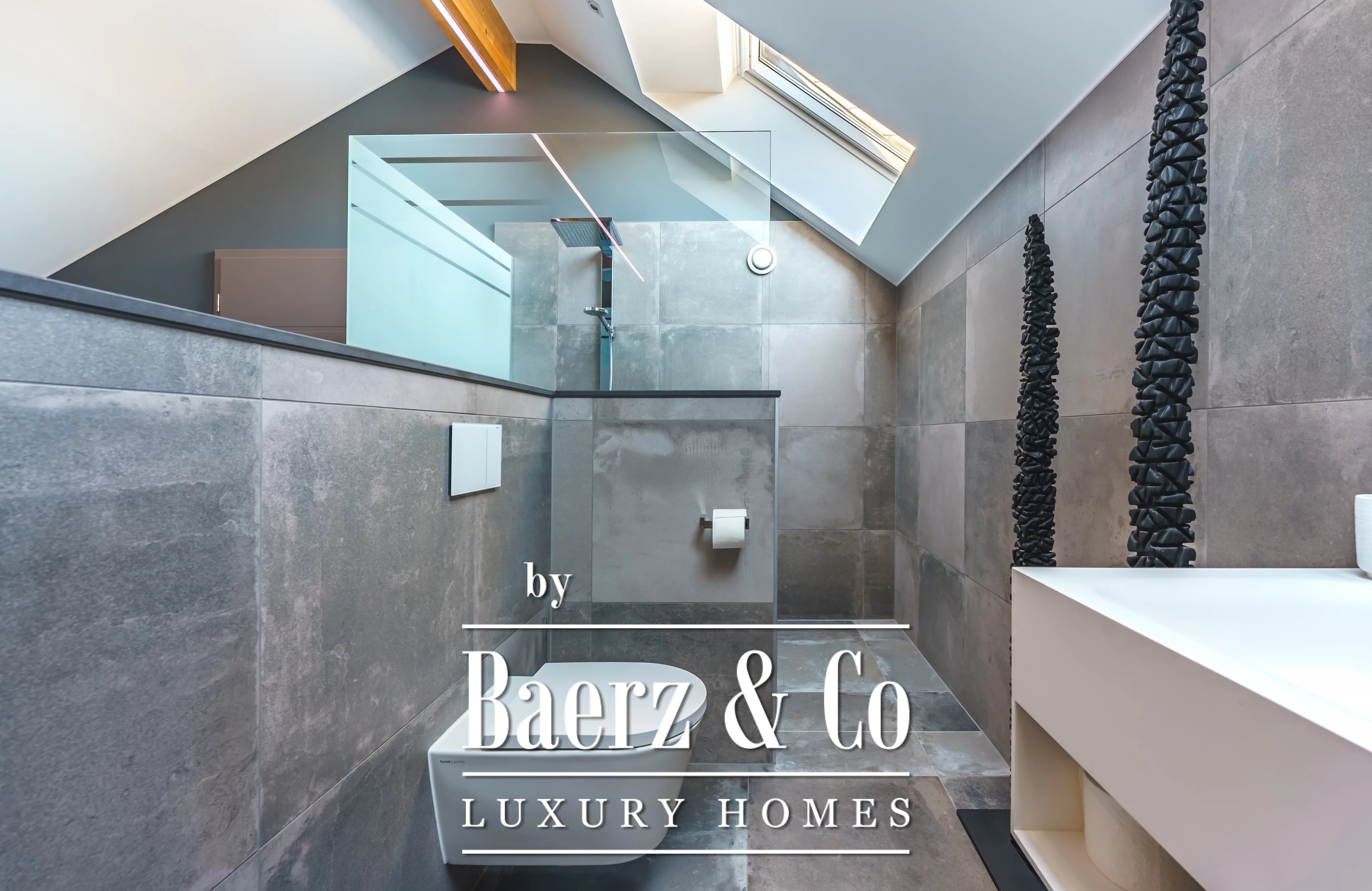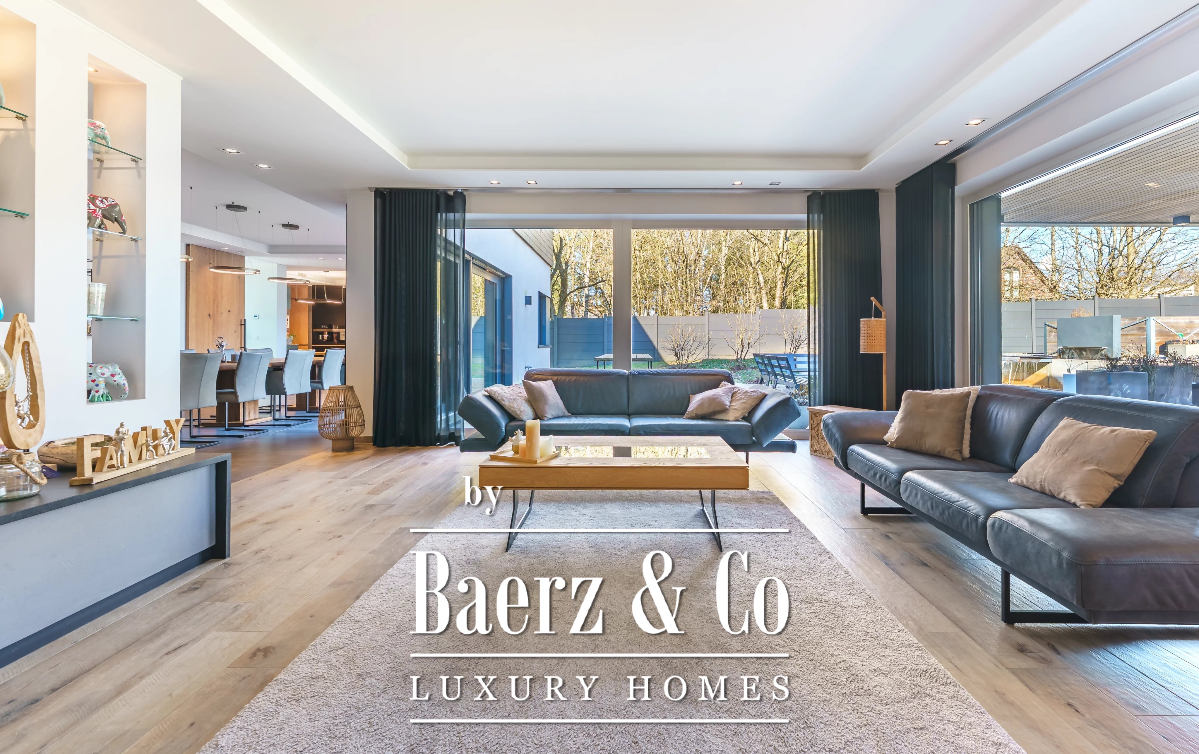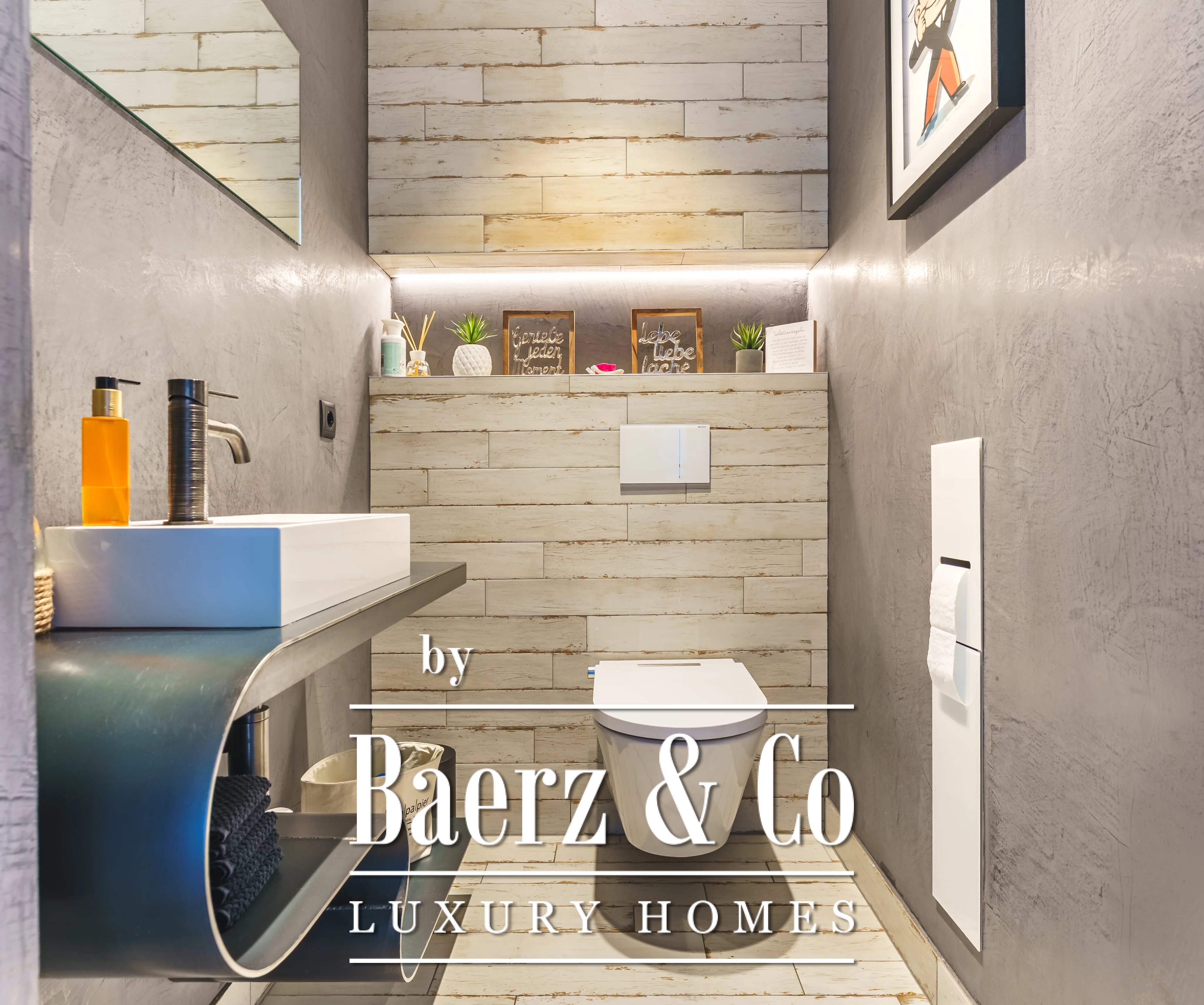 Im Obergeschoss schafft ein weiteres Wohnzimmer einen privaten Rückzugsort für die Familie. Es gibt fünf Schlafzimmer und vier Bäder, darunter eine Master-Suite mit Ankleidezimmer, eigenem Duschbad und ein Gästezimmer mit eigenem Bad. Der Hauswirtschaftsraum ist dezent und effizient und unterstützt den täglichen Komfort.