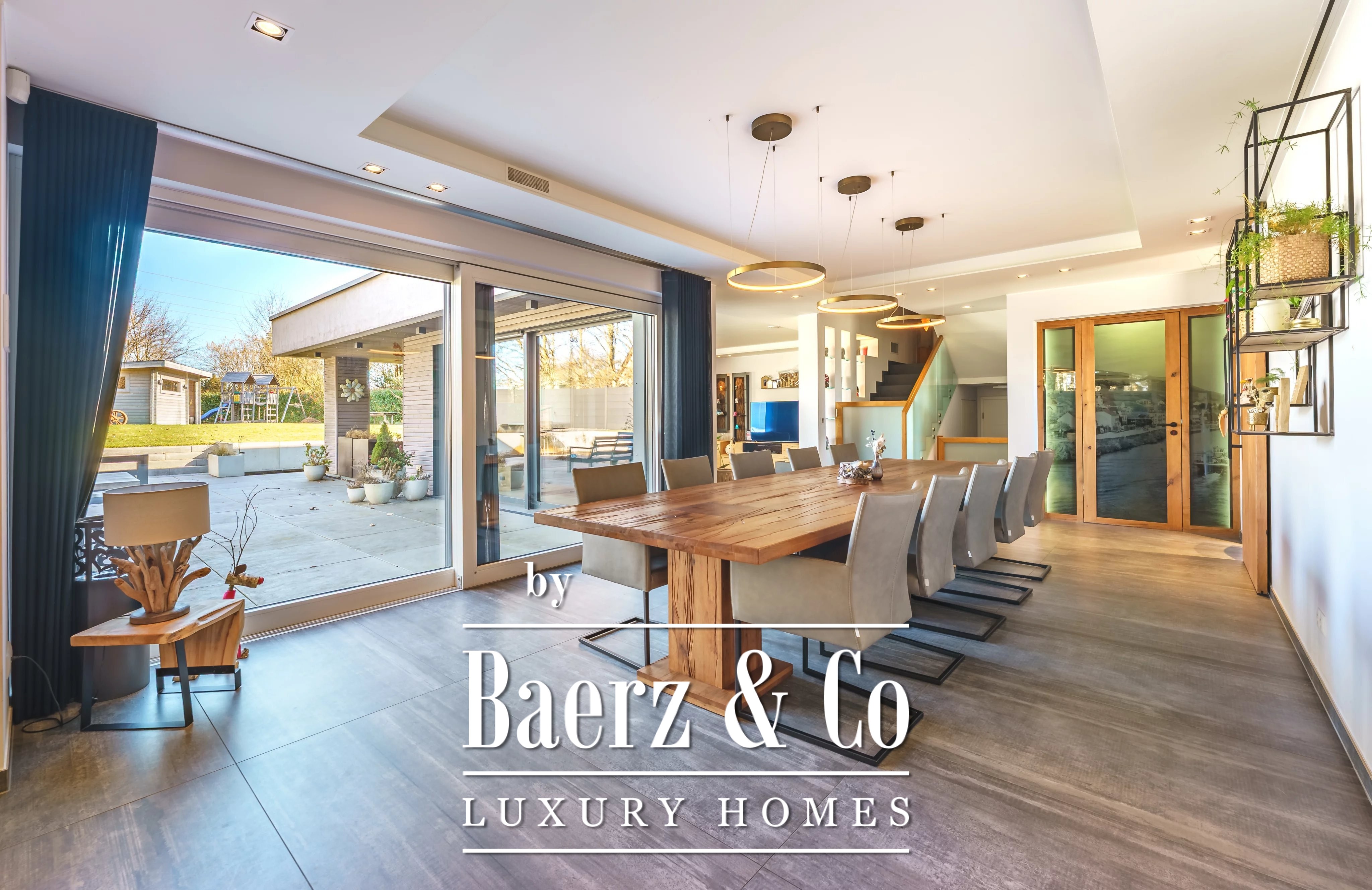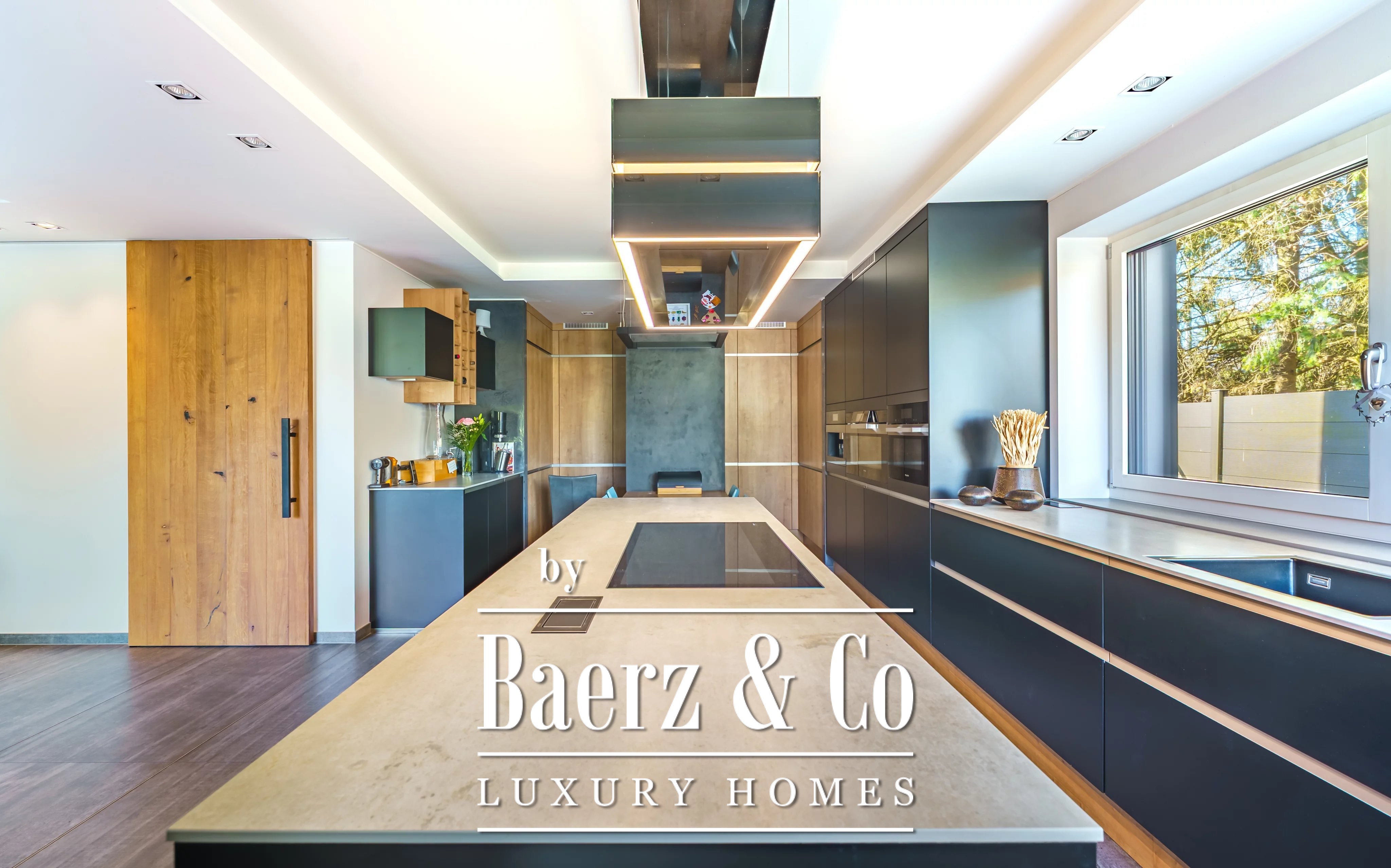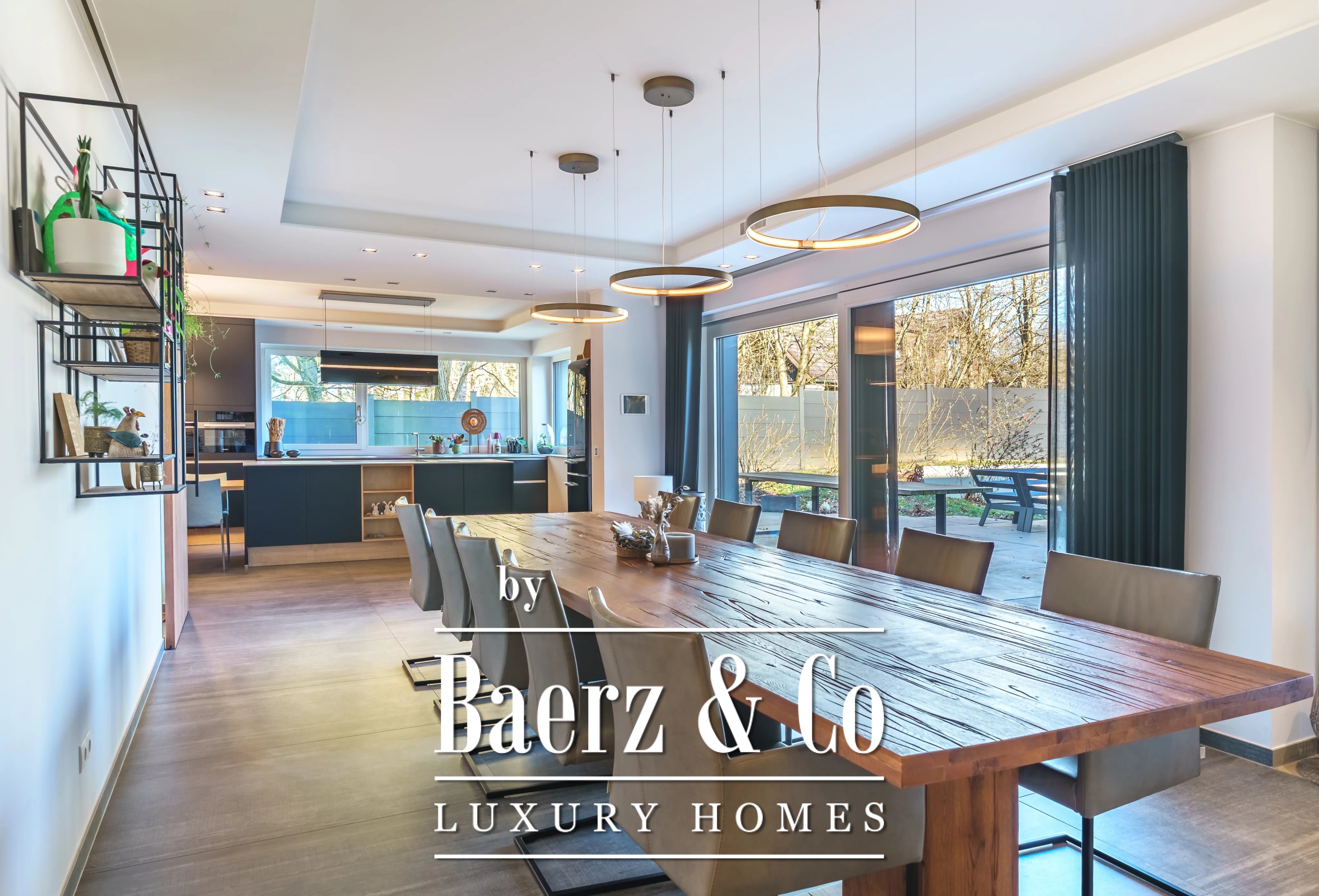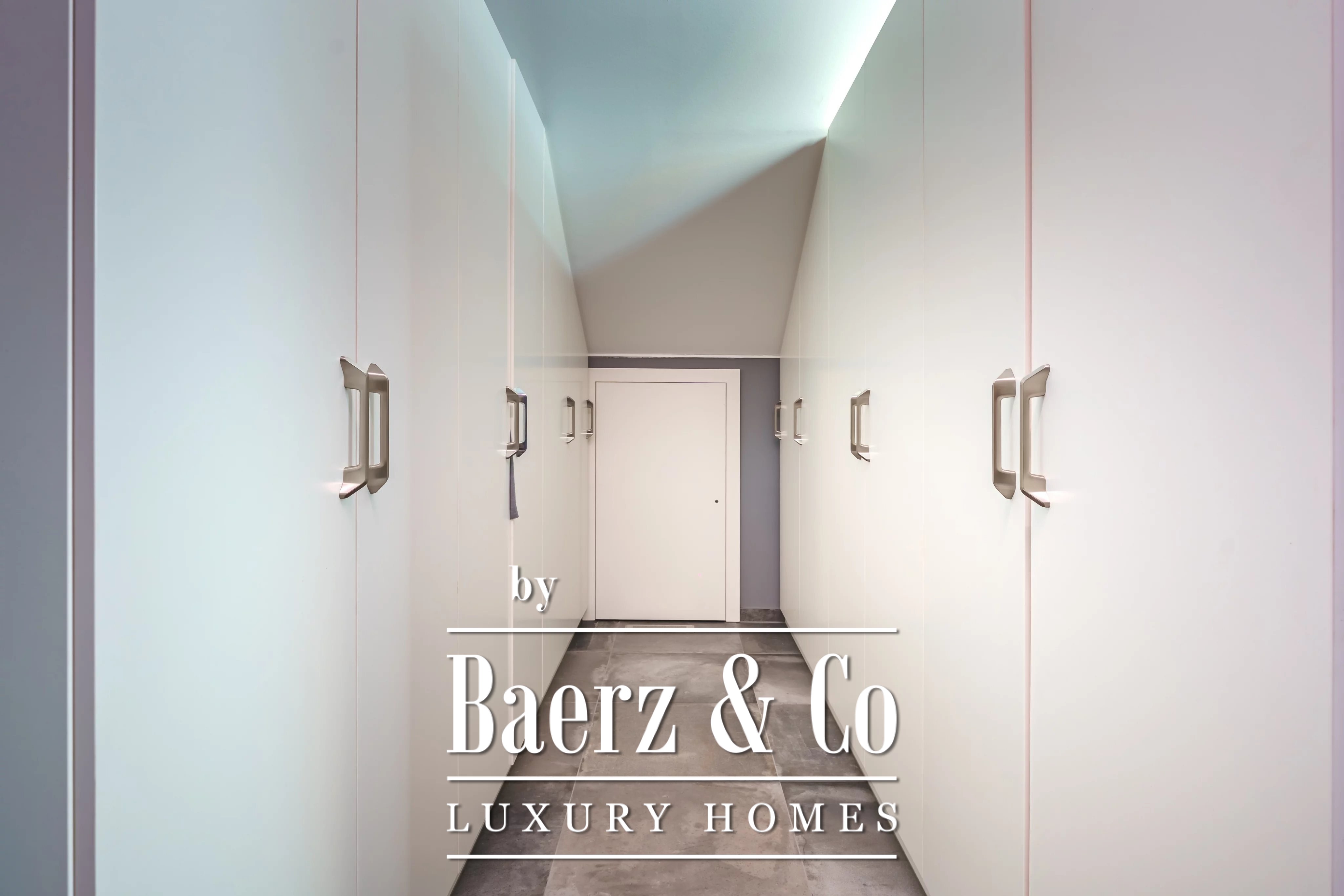 Im Obergeschoss schafft ein weiteres Wohnzimmer einen privaten Rückzugsort für die Familie. Es gibt fünf Schlafzimmer und vier Bäder, darunter eine Master-Suite mit Ankleidezimmer, eigenem Duschbad und ein Gästezimmer mit eigenem Bad. Der Hauswirtschaftsraum ist dezent und effizient und unterstützt den täglichen Komfort.