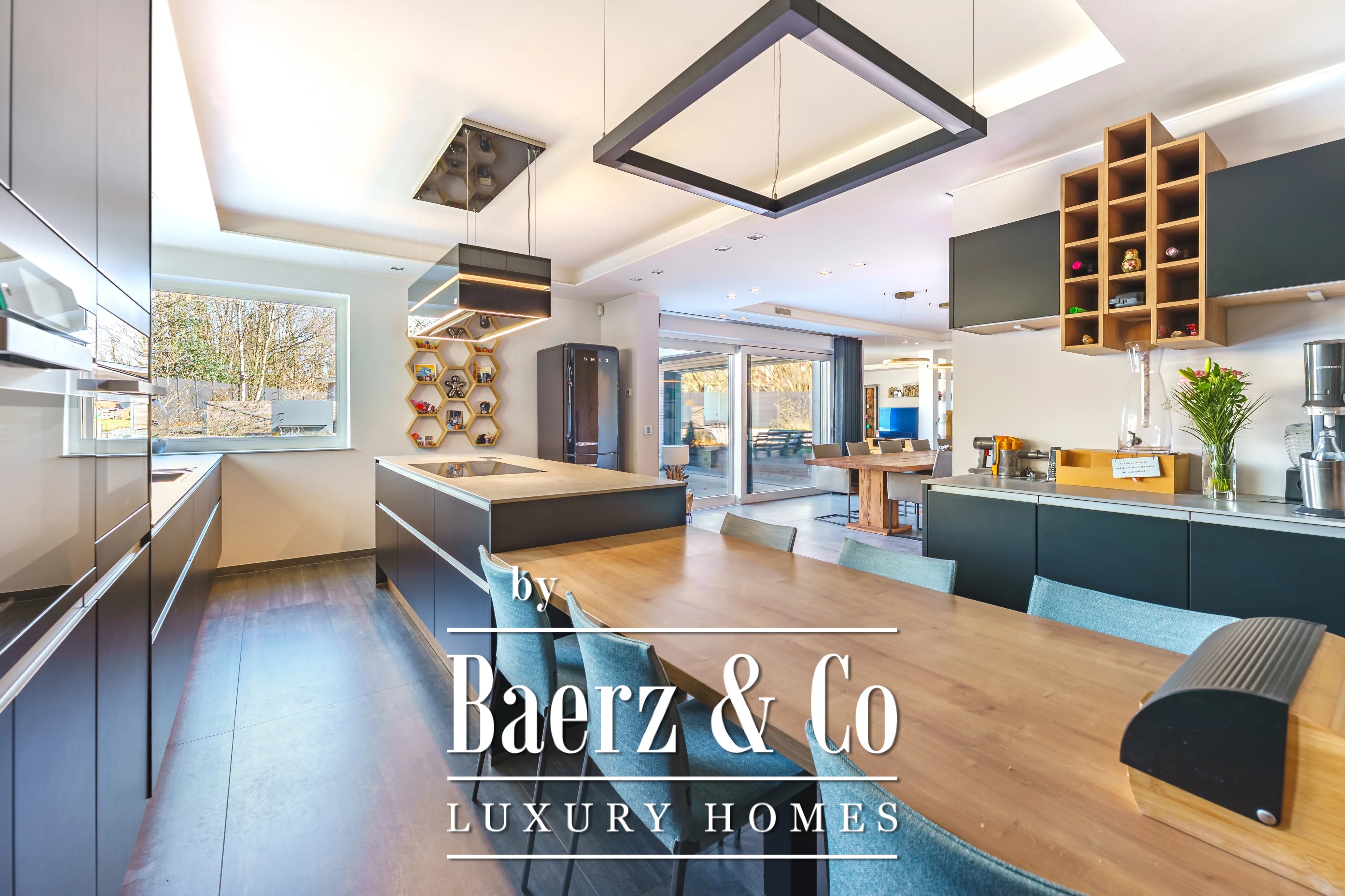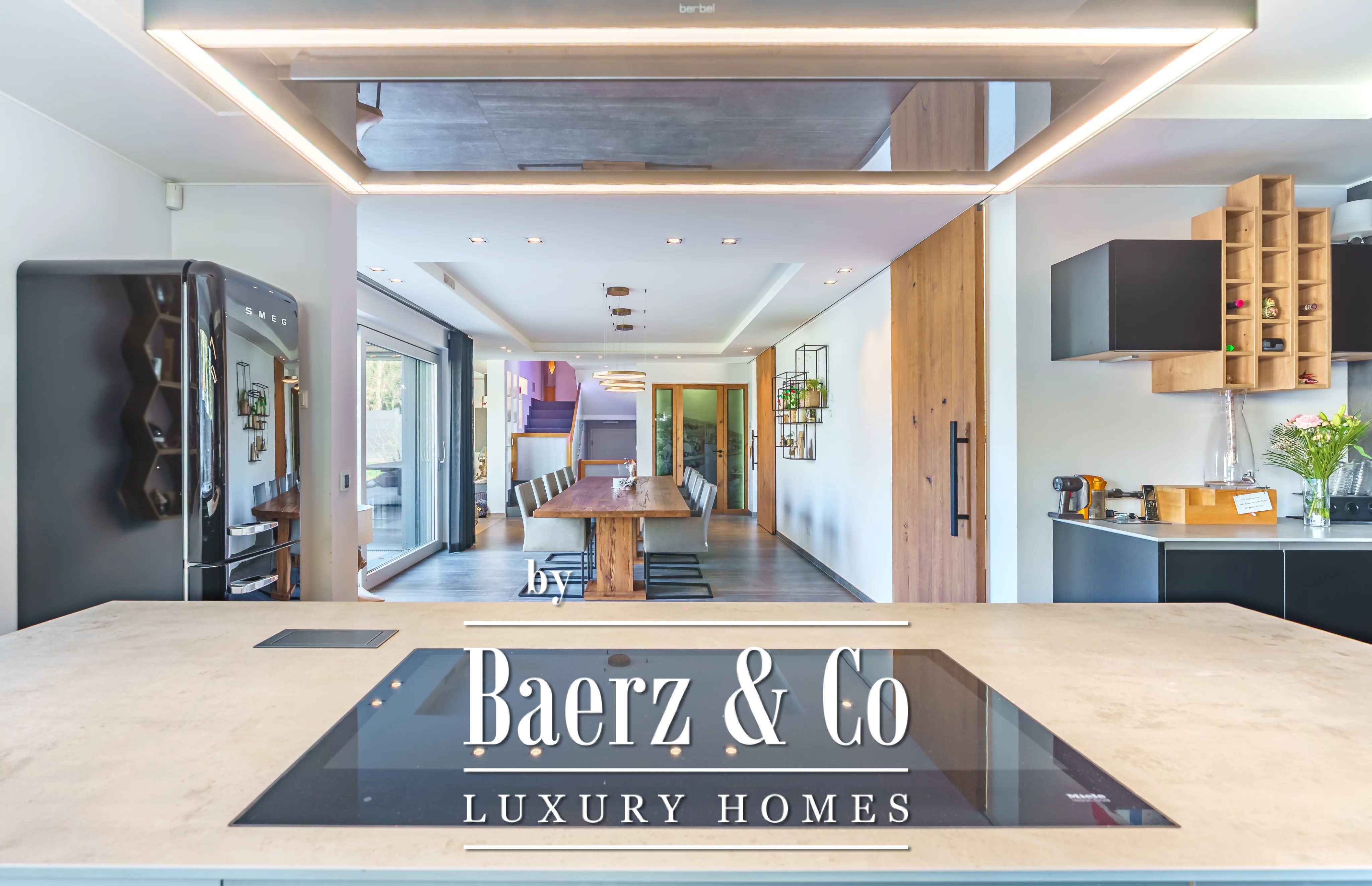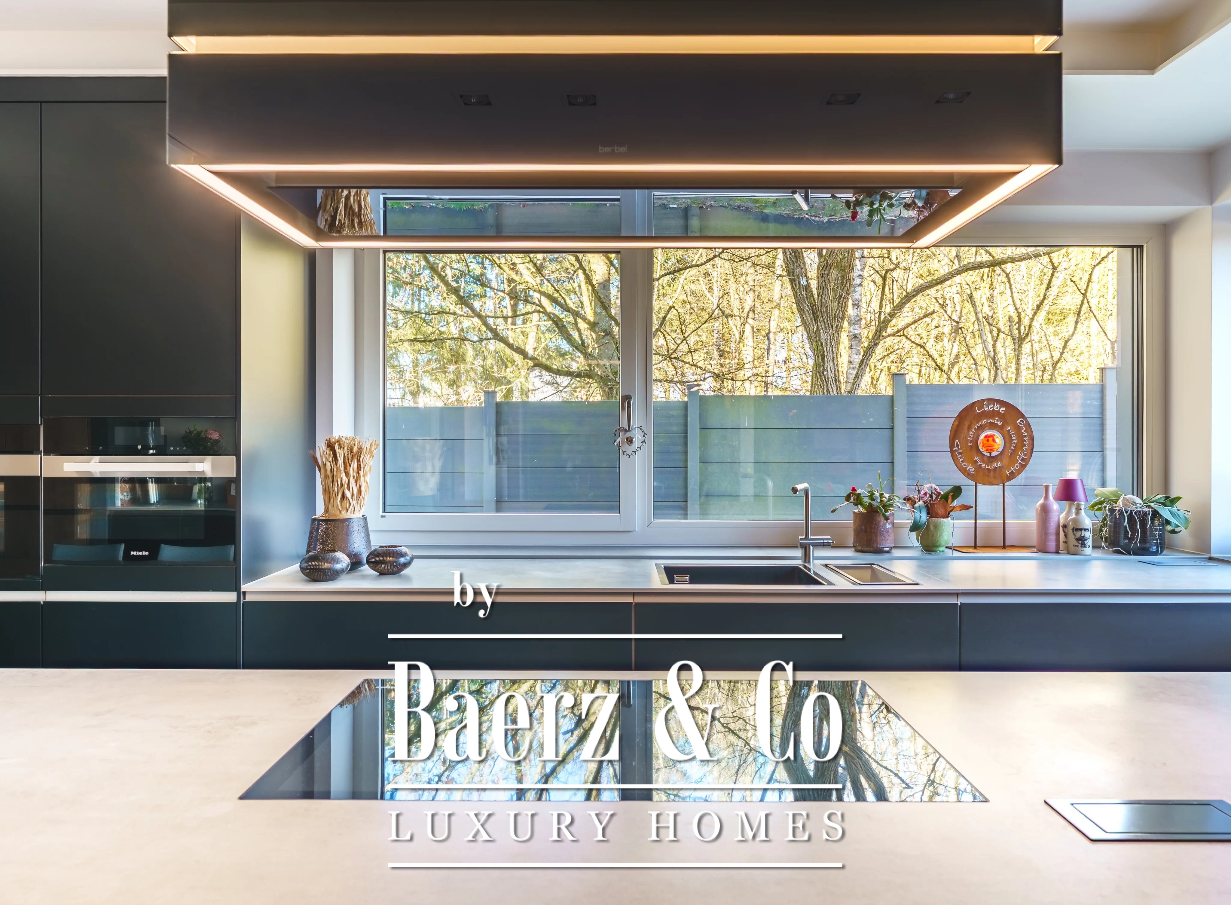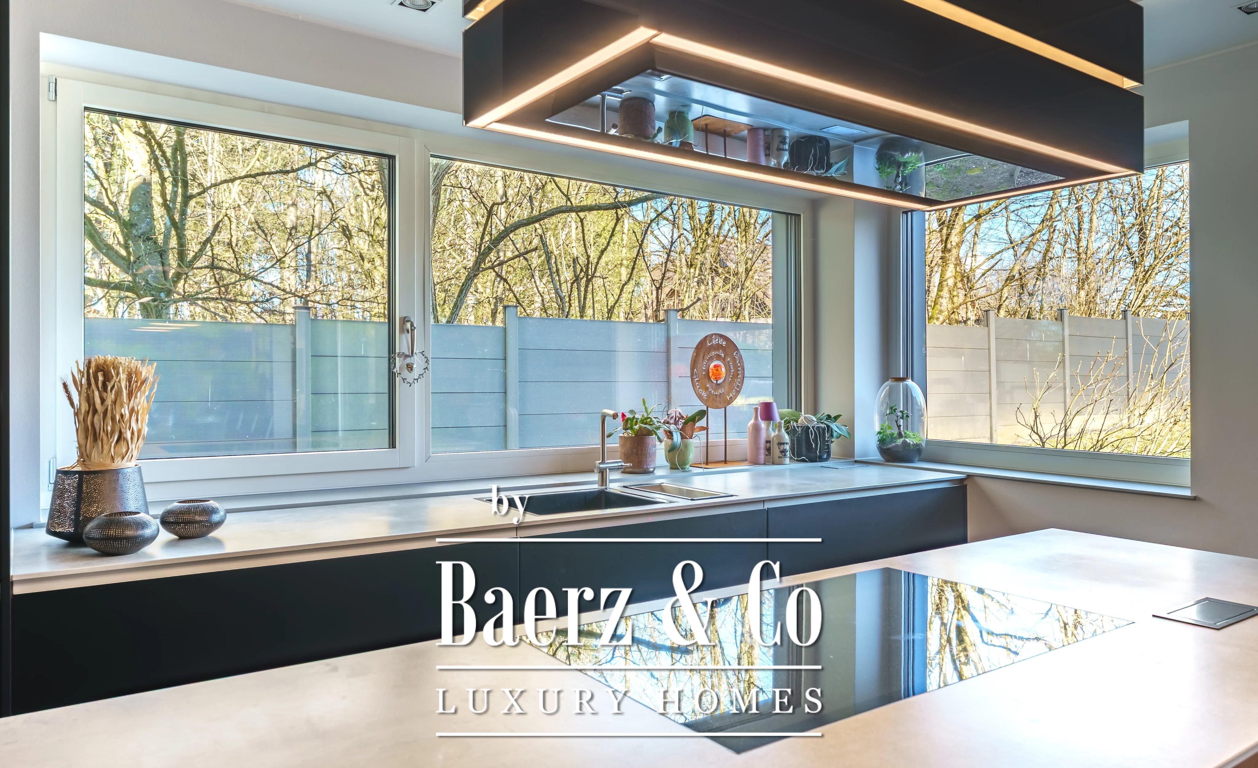 Im Obergeschoss schafft ein weiteres Wohnzimmer einen privaten Rückzugsort für die Familie. Es gibt fünf Schlafzimmer und vier Bäder, darunter eine Master-Suite mit Ankleidezimmer, eigenem Duschbad und ein Gästezimmer mit eigenem Bad. Der Hauswirtschaftsraum ist dezent und effizient und unterstützt den täglichen Komfort.