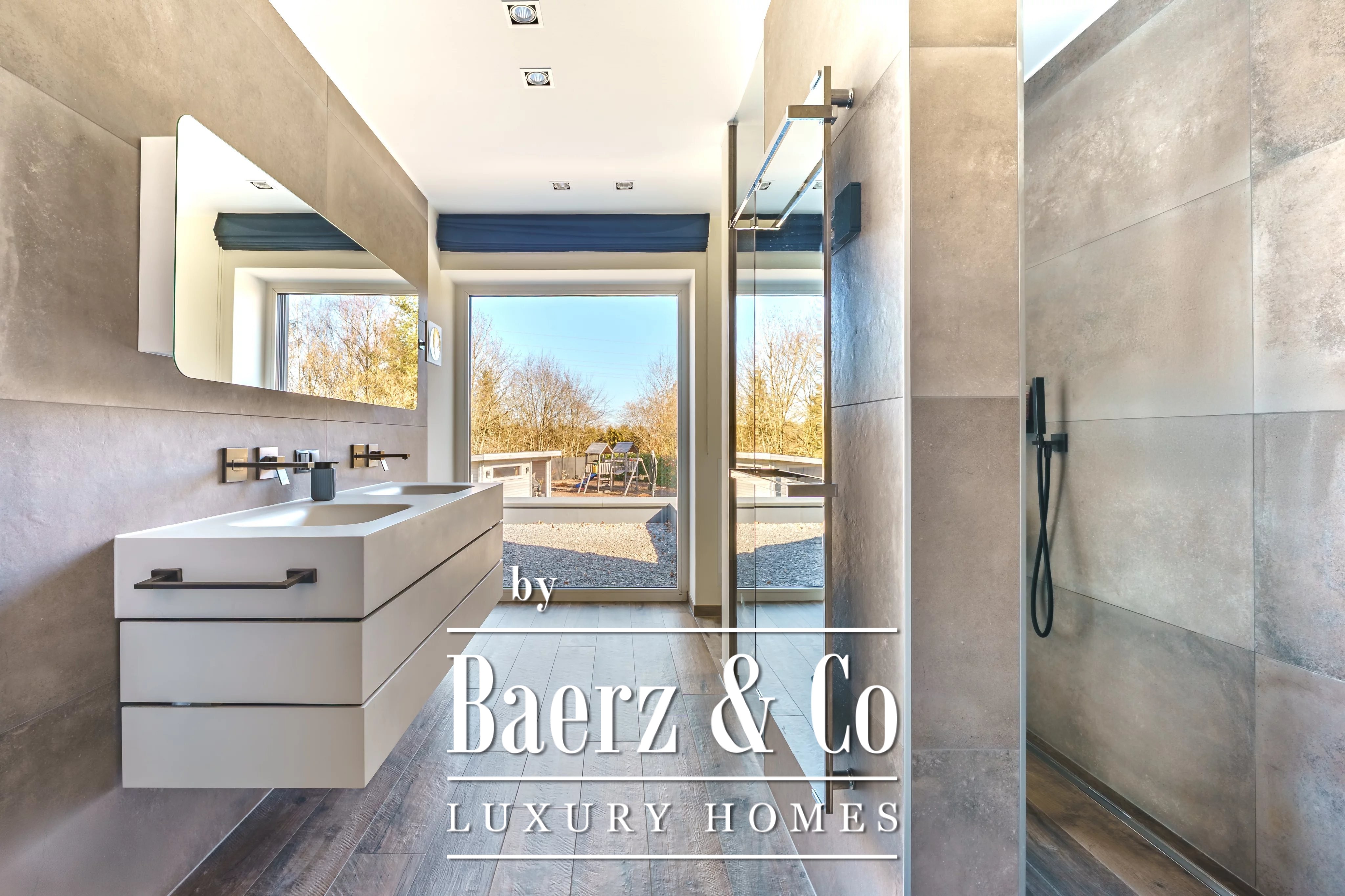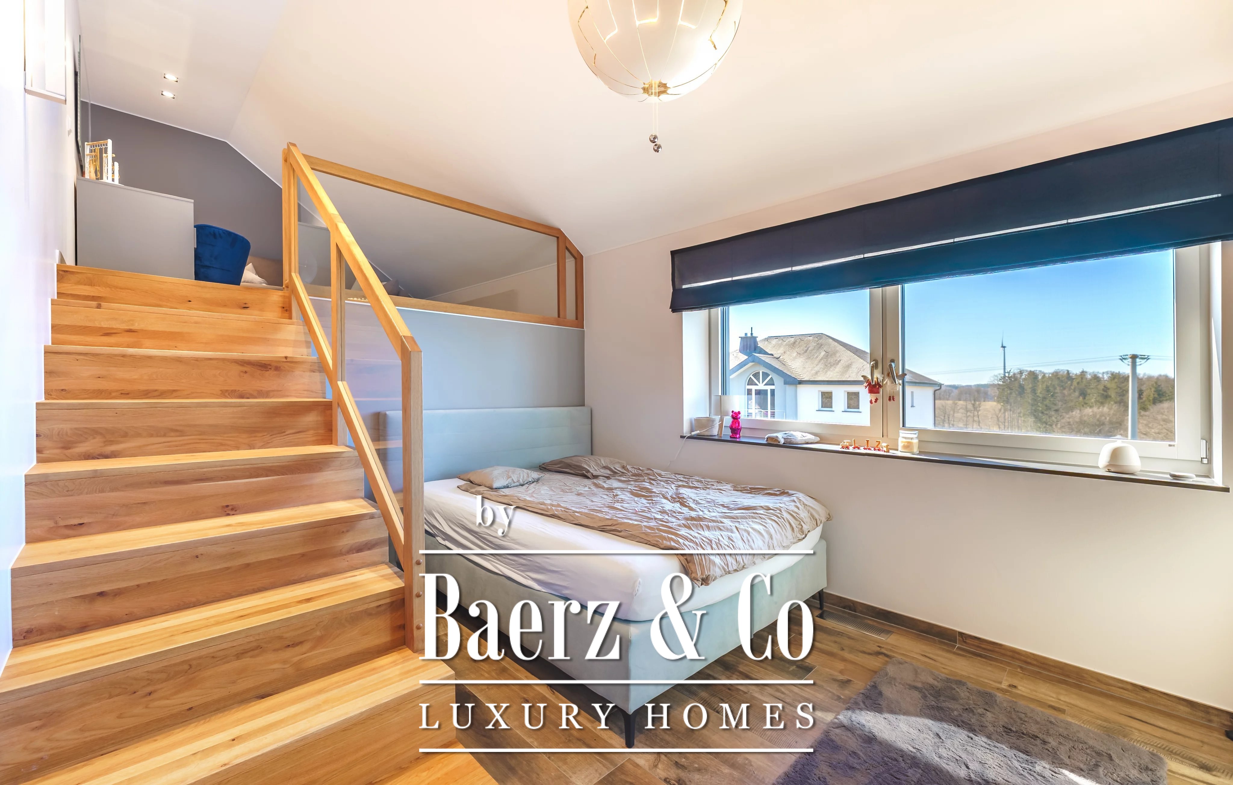 Der Wellnessbereich ist einzigartig und ruhig, ausgestattet mit Sauna, Jacuzzi und Dusche auf einer überdachten Terrasse – perfekt zu jeder Jahreszeit. Die Haustechnik ist zukunftsweisend: ein KNX-Gebäudesteuerungssystem, dreifach verglaste Fenster, geothermische und Photovoltaik-Energie, solarbetriebene Warmwasserbereitung, Sicherheitssystem und Vorbereitung für einen zukünftigen Aufzug. Dieses luxuriöse Haus zum Verkauf in Nocher-Route bietet eine seltene Balance aus moderner Technik und ländlicher Gelassenheit mit weitreichendem Blick über die Landschaft.