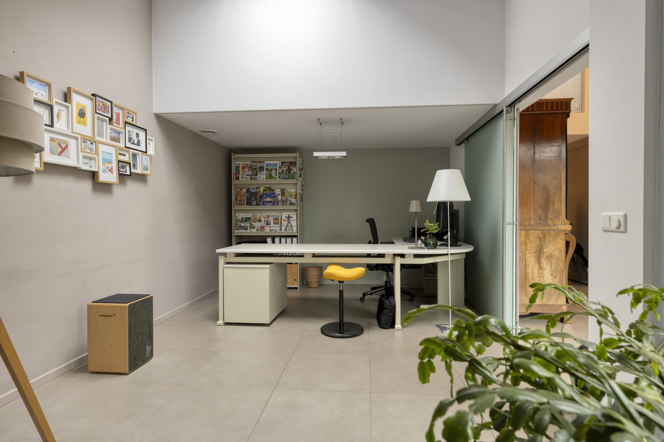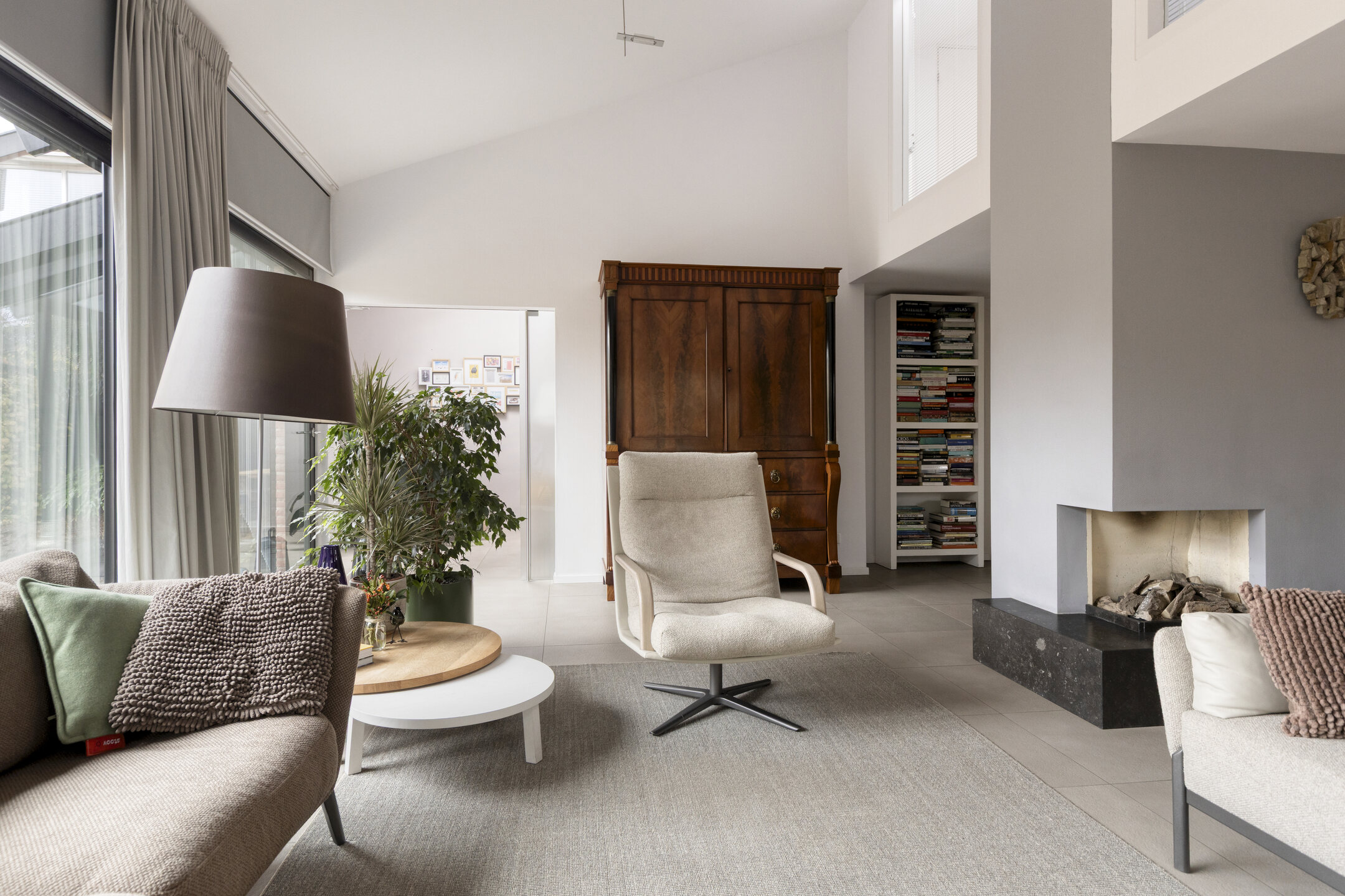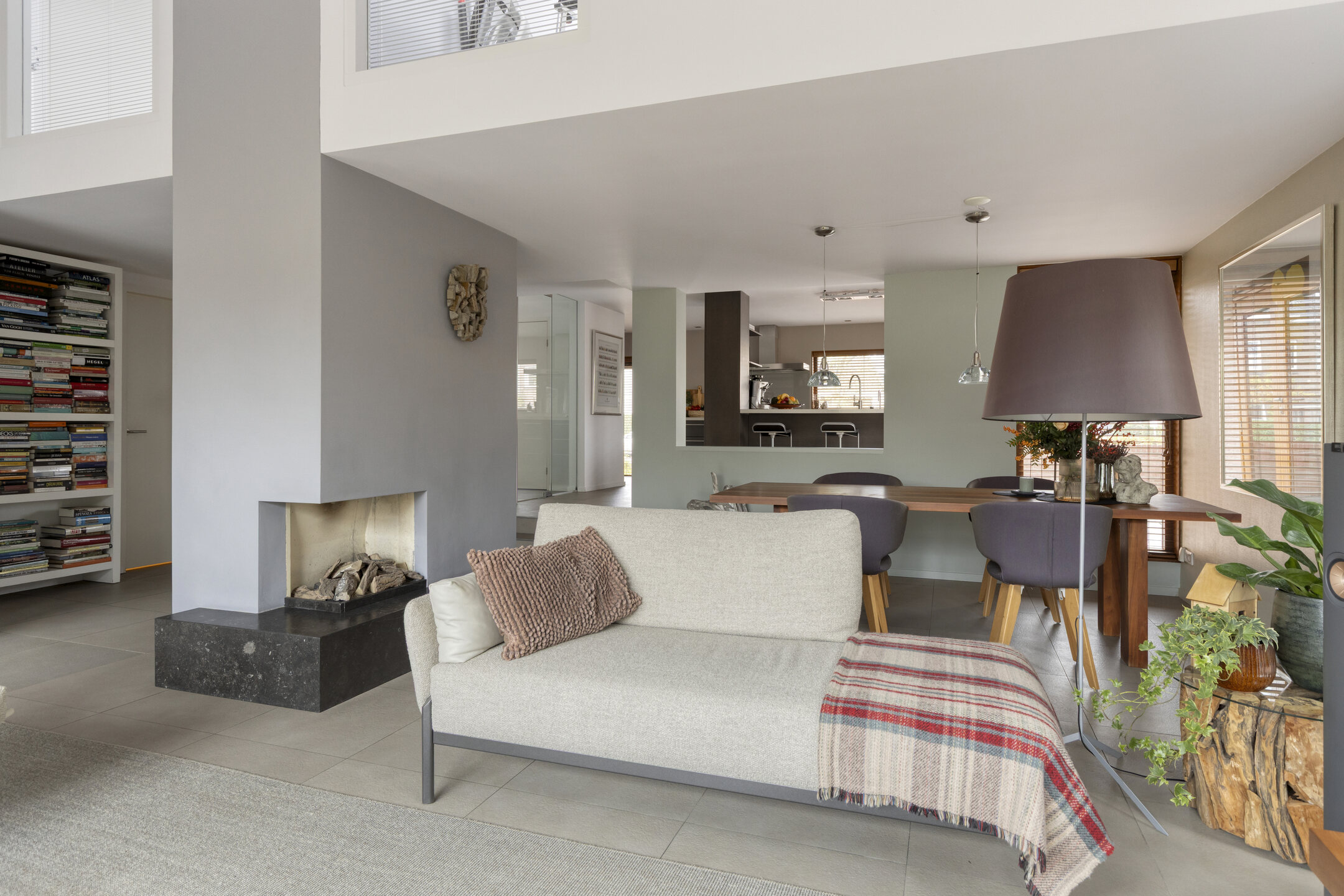 The living room is a remarkably spacious and bright space, thanks in part to the large windows in the renovated sliding doors and the high ceilings overlooking the rooms on the first floor. The fireplace in the center of the living room adds to the ambiance. Located at the rear of the house, the living room opens directly onto the garden. Adjacent is an additional room that could serve as an office, playroom, TV room, or a spacious bedroom with a bathroom. The necessary connections for this are already in place. Finally, a spacious storage room, ideal as a pantry and with space for an extra refrigerator and freezer, is accessible through the living room.