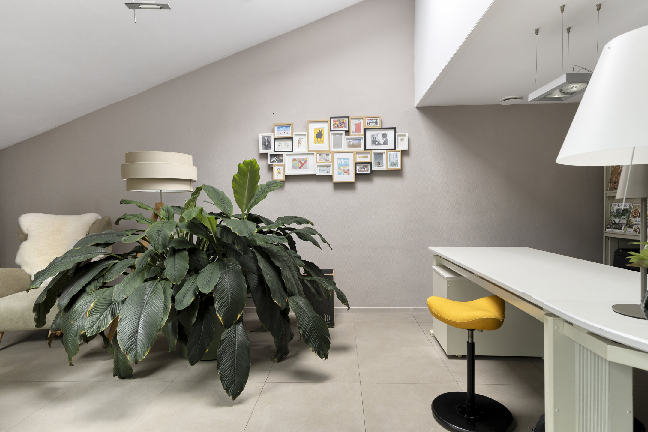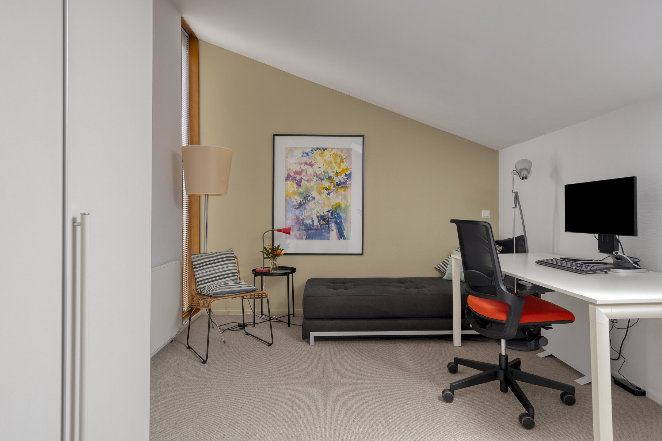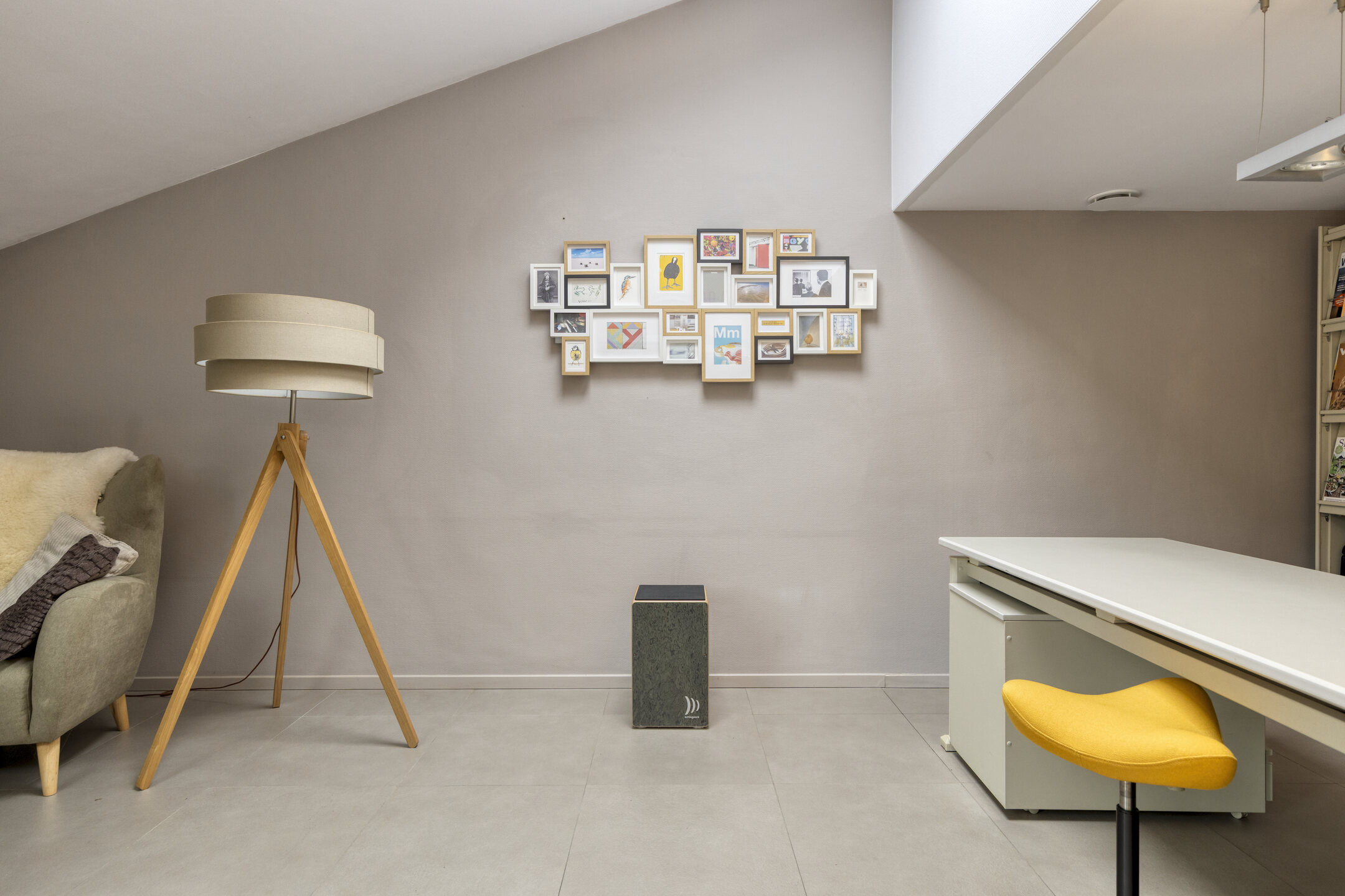 The living room is a remarkably spacious and bright space, thanks in part to the large windows in the renovated sliding doors and the high ceilings overlooking the rooms on the first floor. The fireplace in the center of the living room adds to the ambiance. Located at the rear of the house, the living room opens directly onto the garden. Adjacent is an additional room that could serve as an office, playroom, TV room, or a spacious bedroom with a bathroom. The necessary connections for this are already in place. Finally, a spacious storage room, ideal as a pantry and with space for an extra refrigerator and freezer, is accessible through the living room.