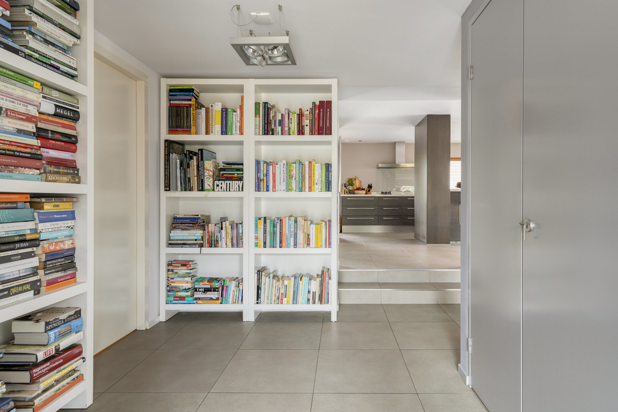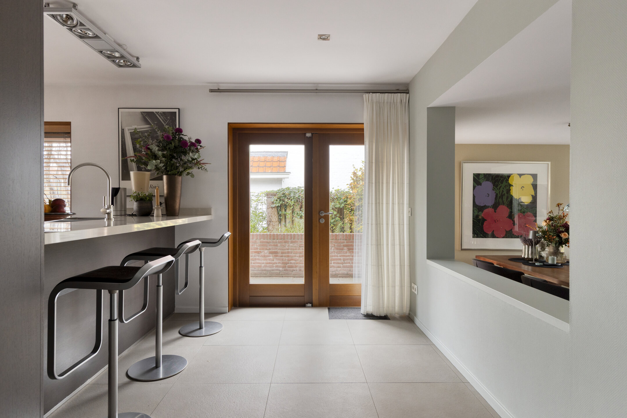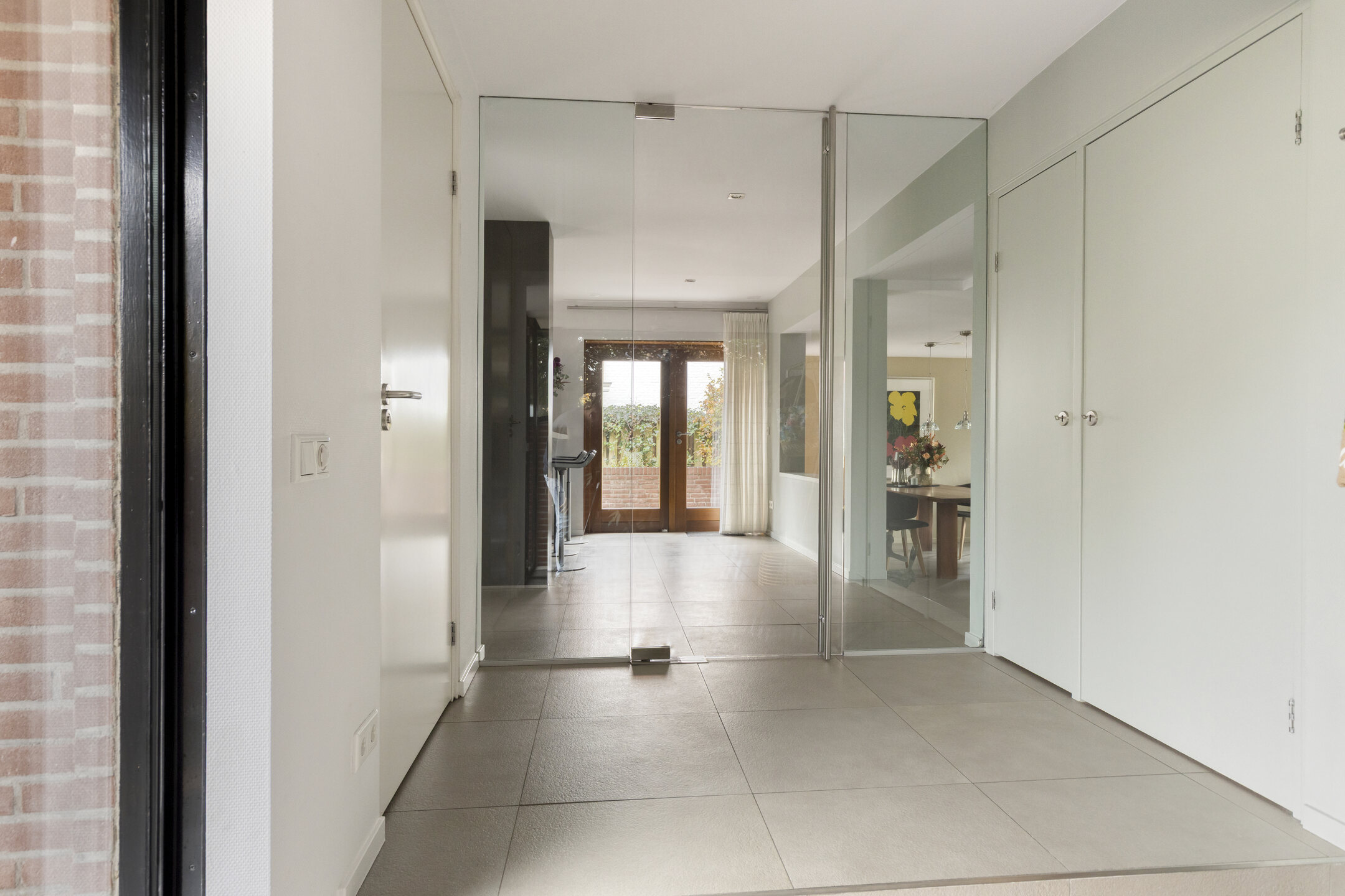 The entrance to this architect-designed house is located in a side extension. This extension features ample glass and a spacious layout, befitting a modern villa. The entrance provides access to the toilet and the stairs to the first floor.