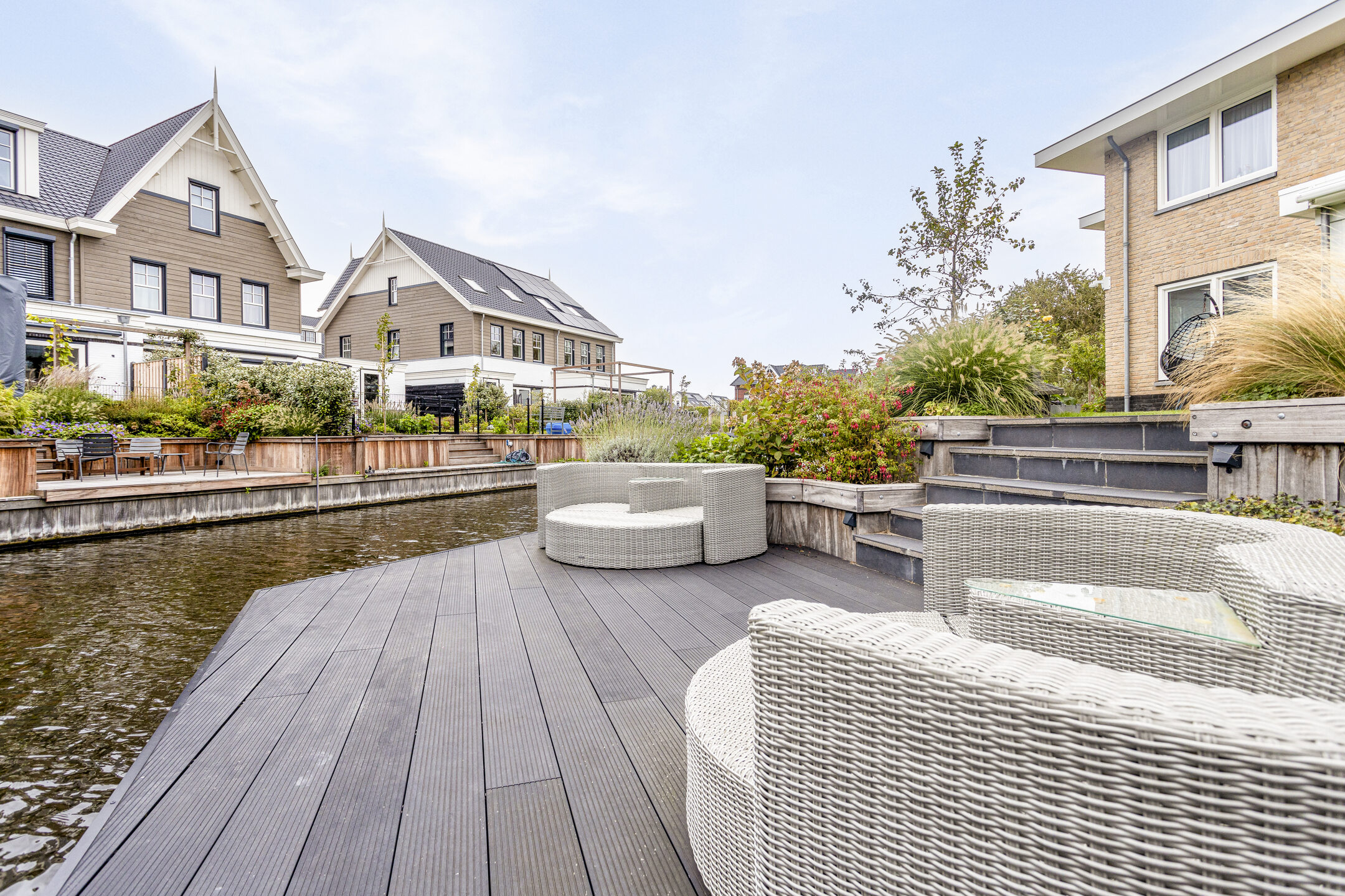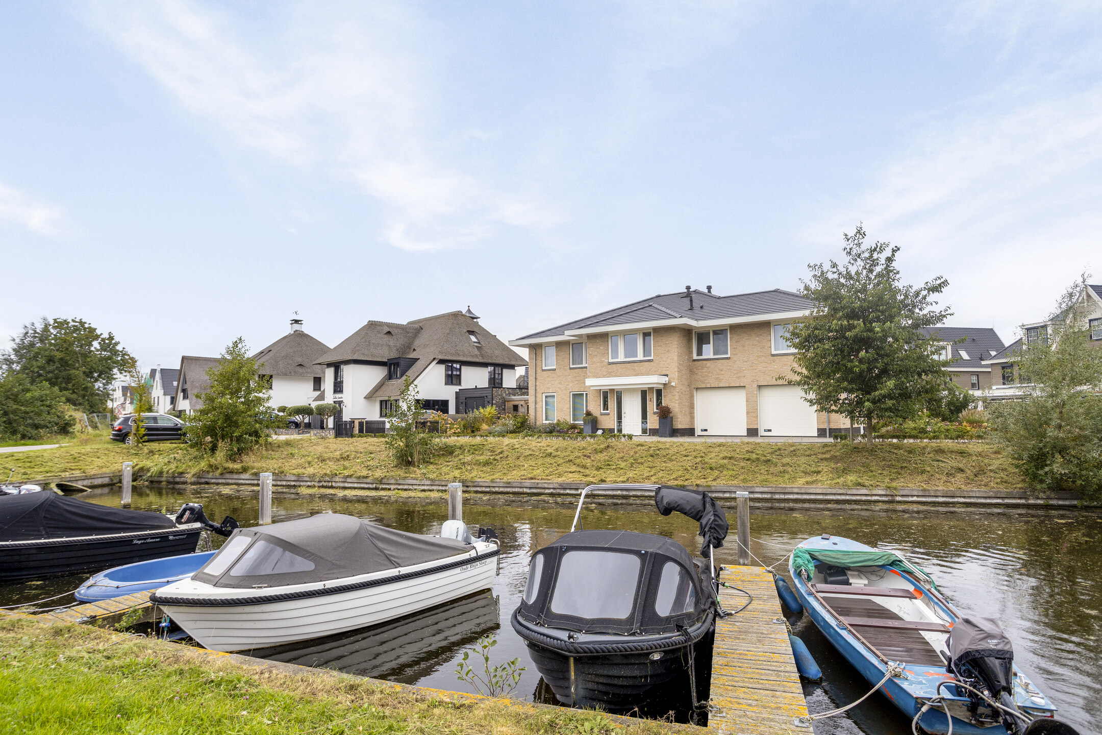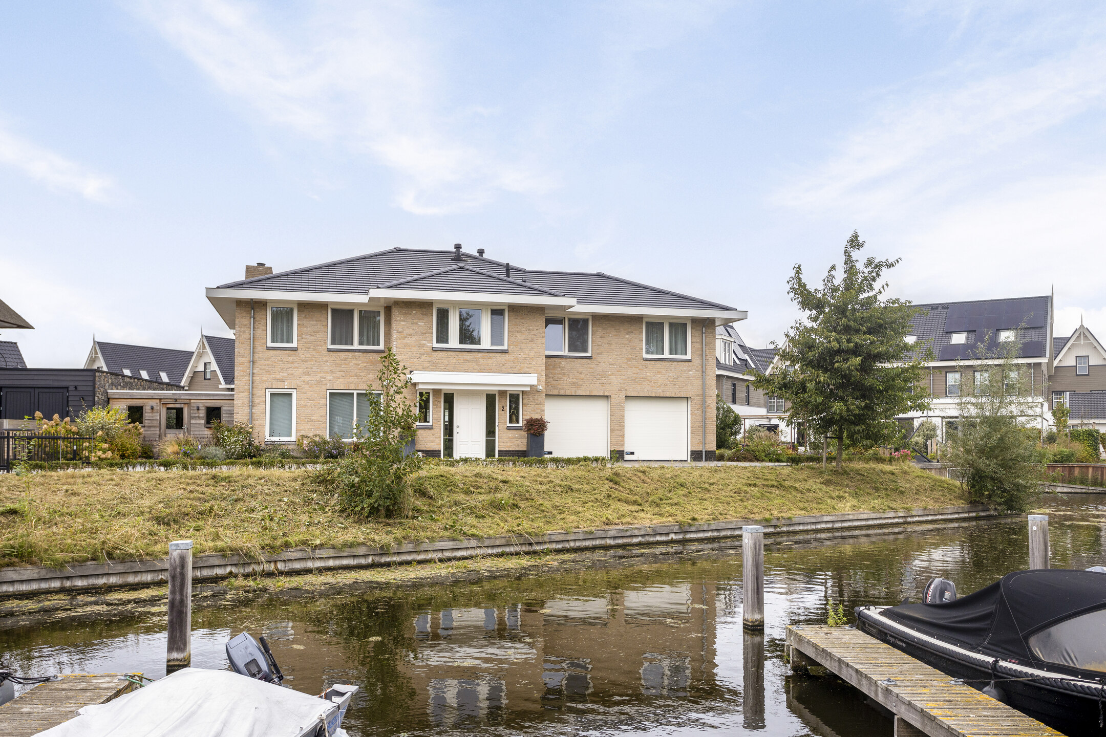Walking up to the house, you will immediately notice the very spacious driveway with an electrically operated driveway gate. At the end of the driveway there is a double indoor garage. Next to the house is the wooden shed, which can be useful to store bicycles. The backyard is beautifully landscaped and has a spacious terrace directly adjacent to the house and a large 'deck' on the water. On the long side of the garden there are several mooring places for boats, one of which is equipped with a boat lift.