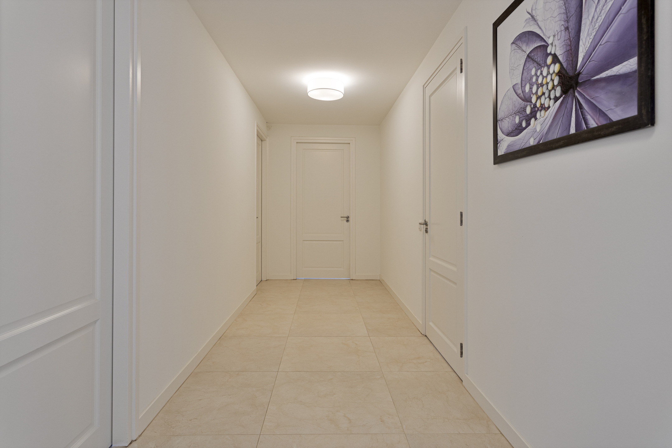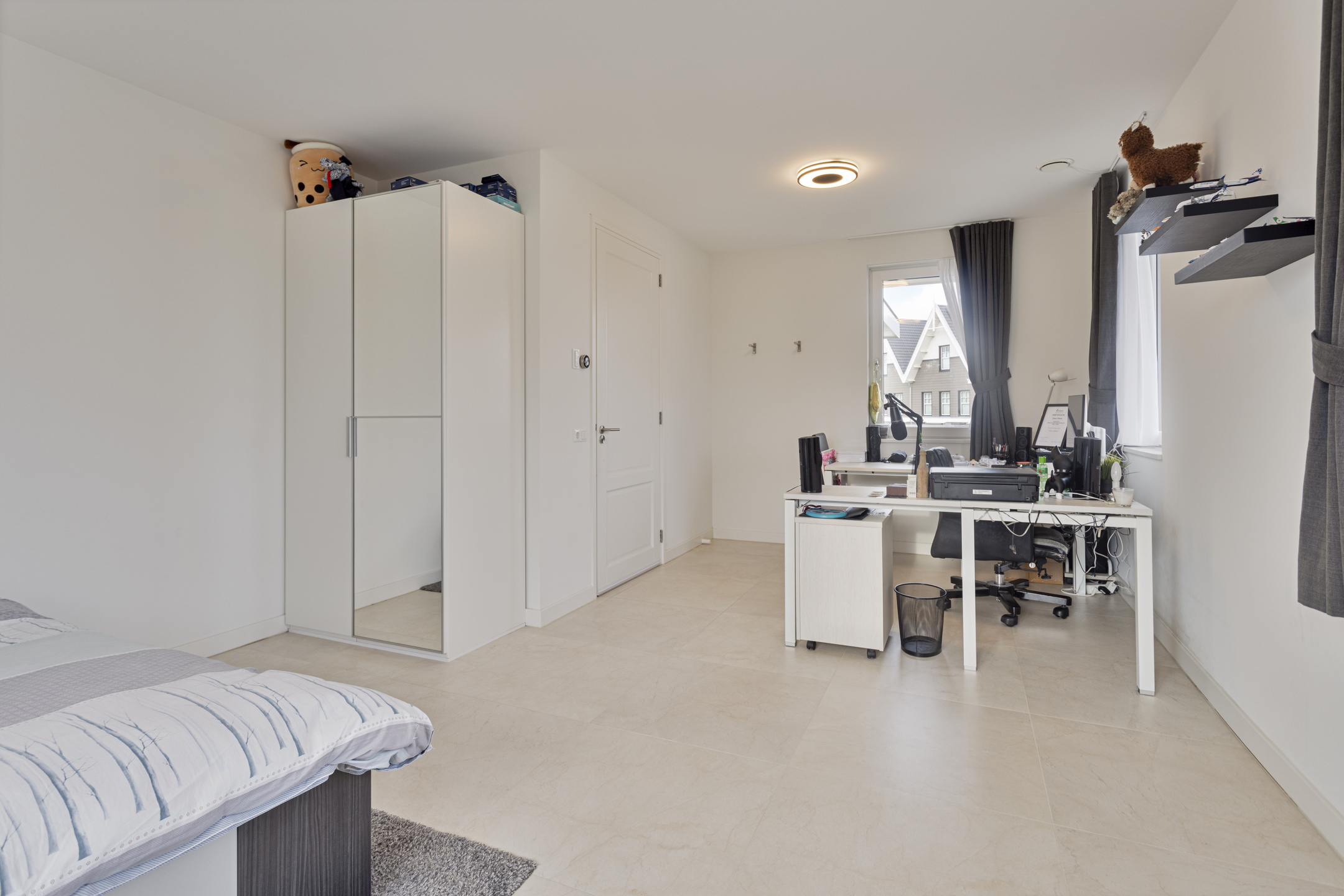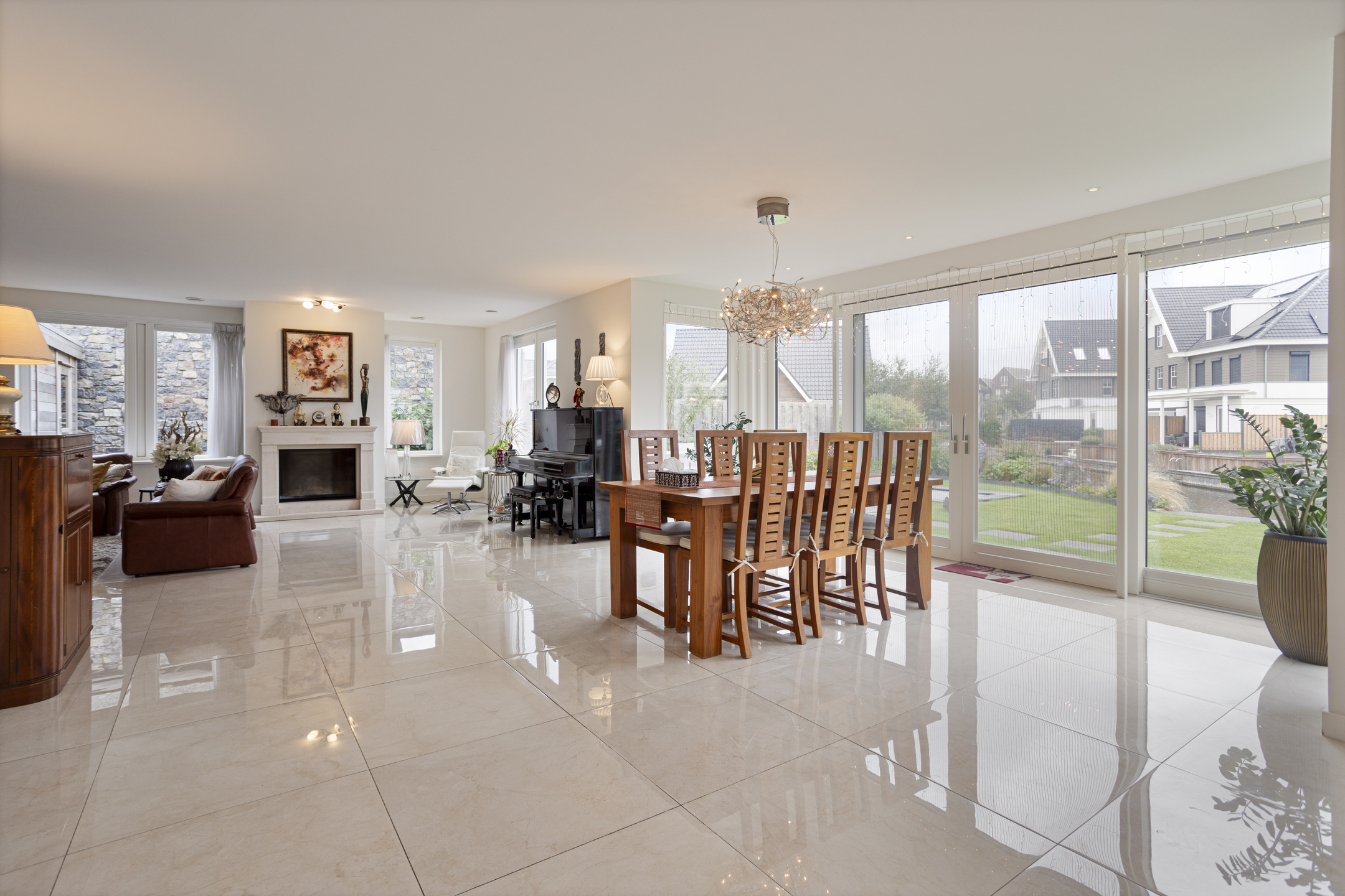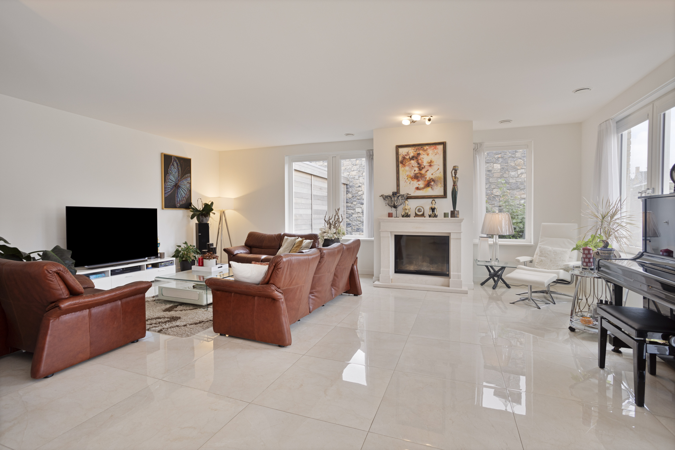 Spacious and bright entrance with toilet and storage cupboard. On the left there is a beautiful work or play room. On the right side, the door gives access to the double indoor garage. The living area (along with the kitchen) measures over 65 m2 and consists of a spacious and bright living room with fireplace, a dining area in the middle part with patio doors to the garden and a modern and luxurious open kitchen with an 'island', which is of course equipped with all modern equipment.