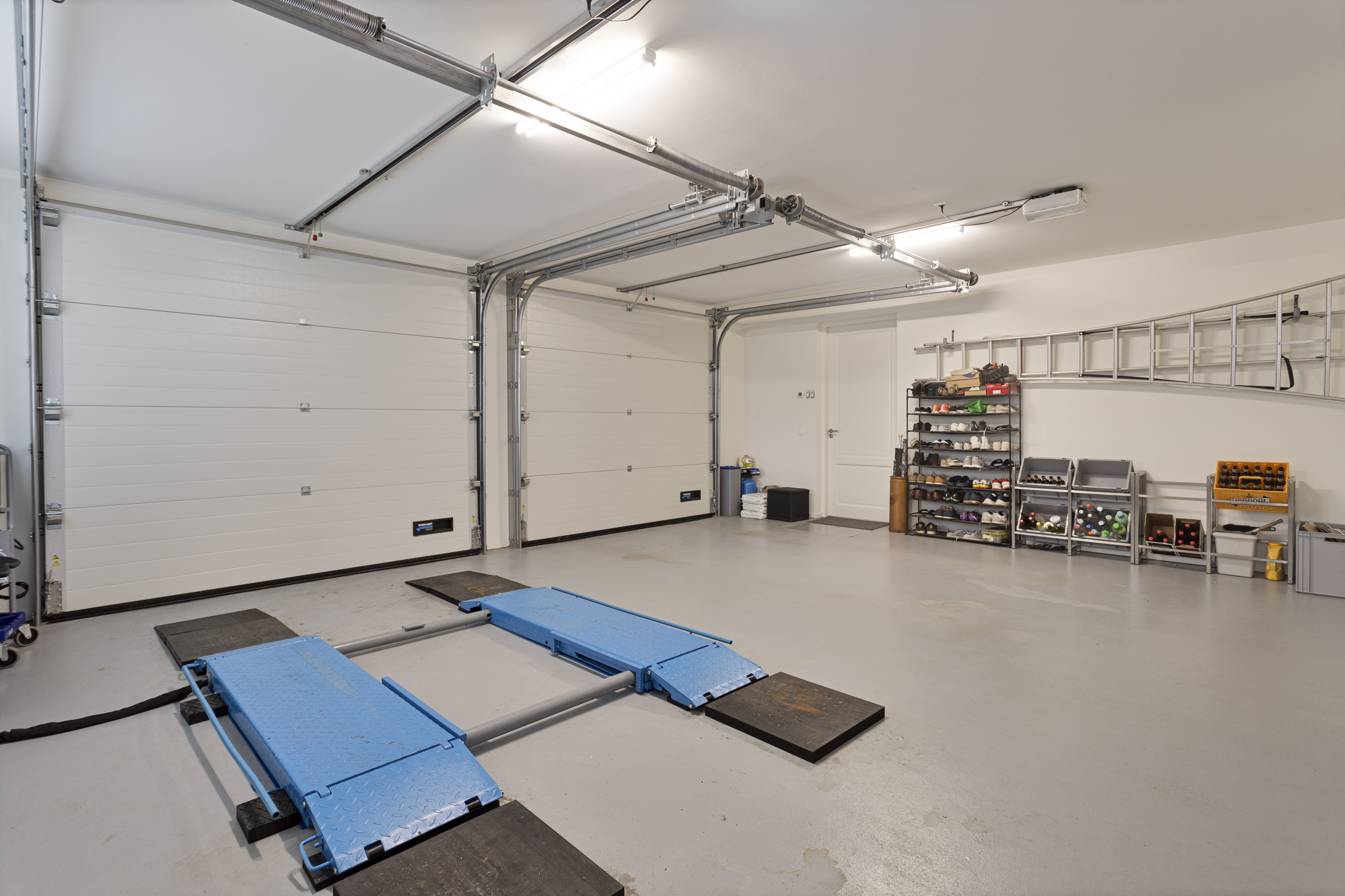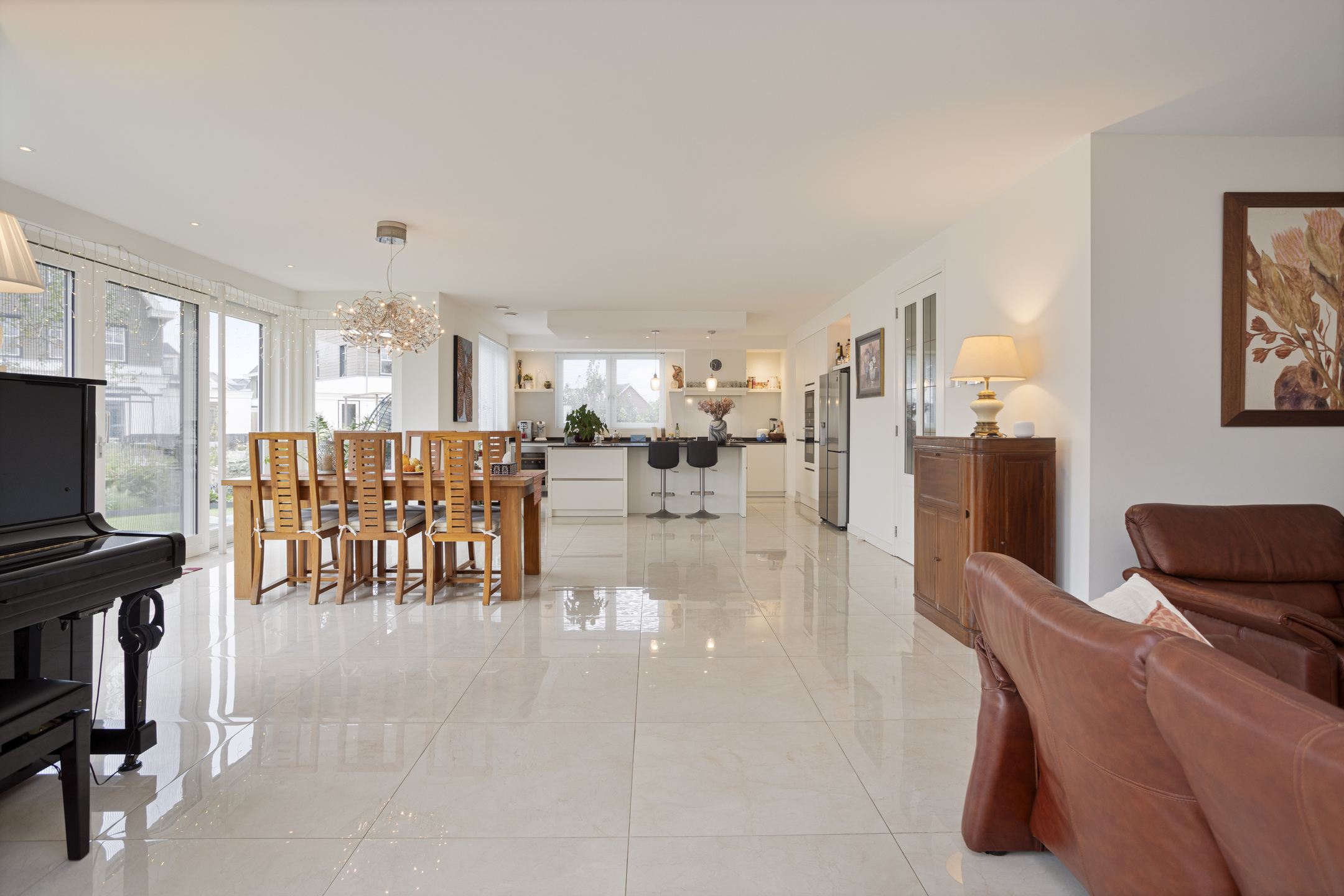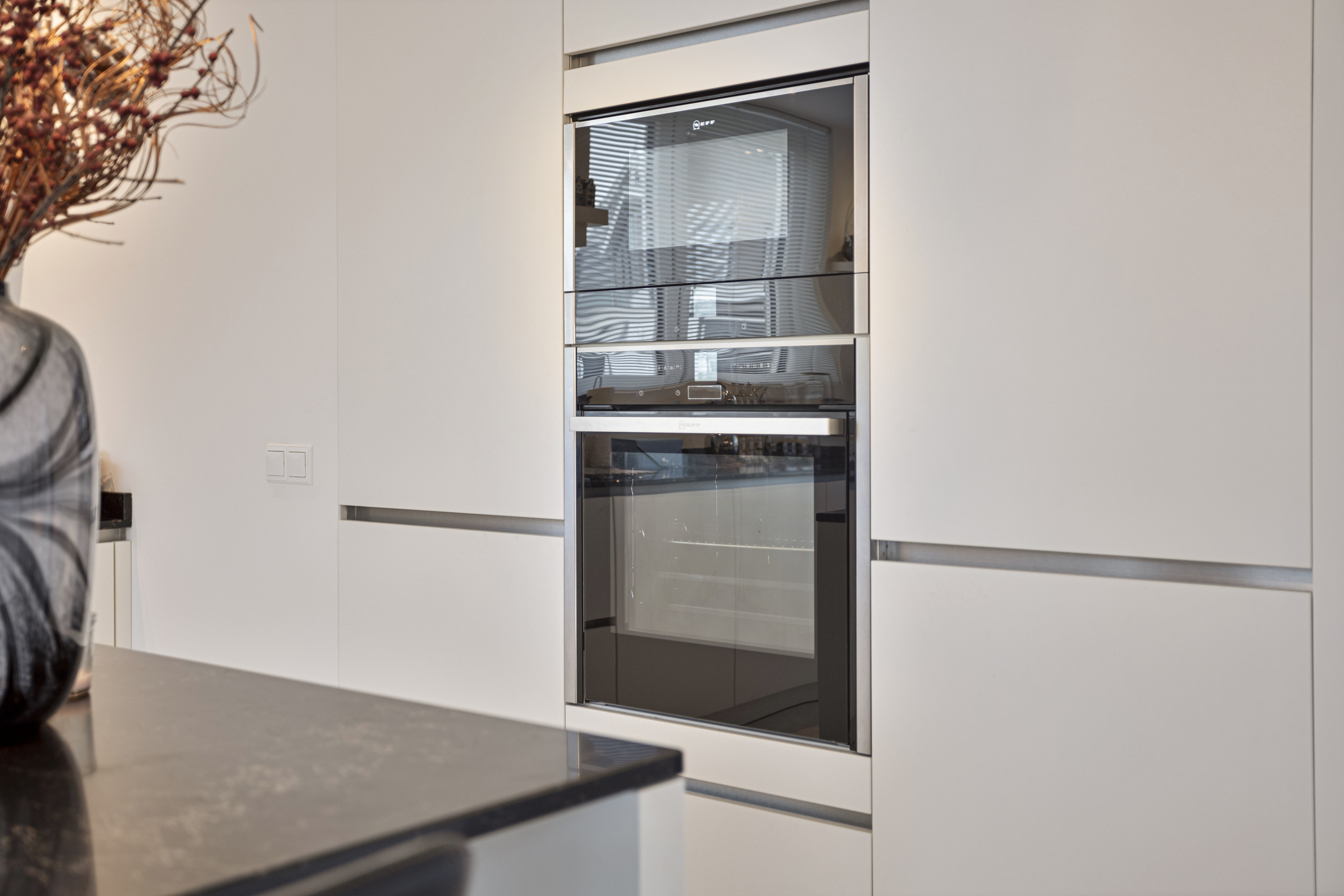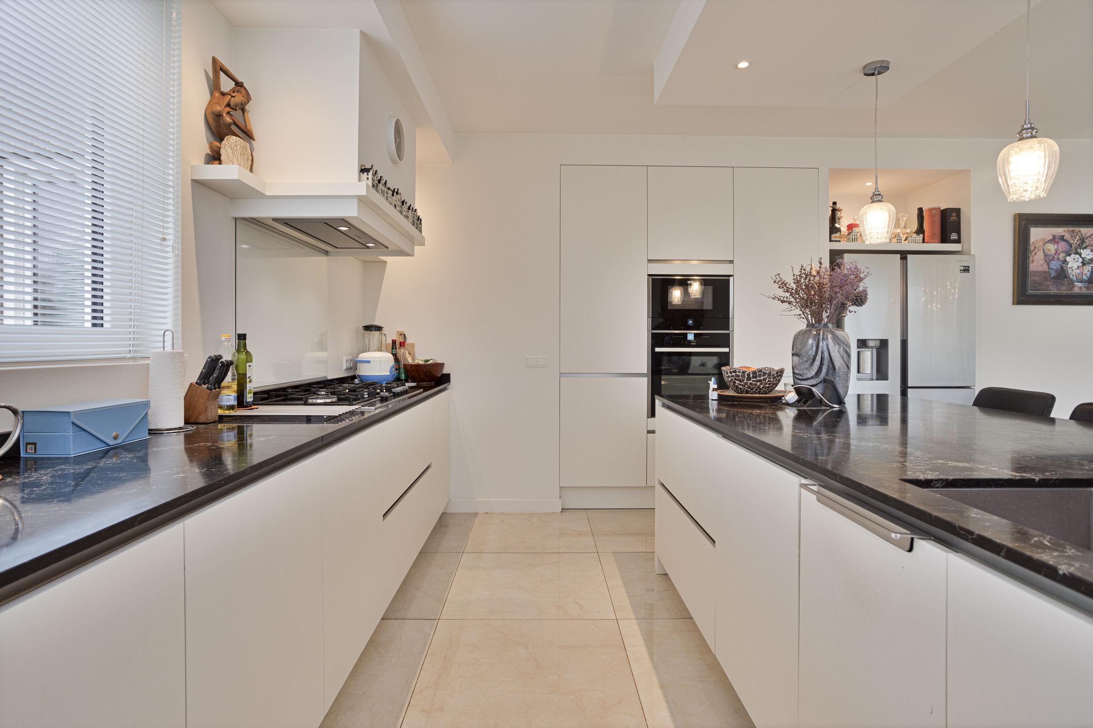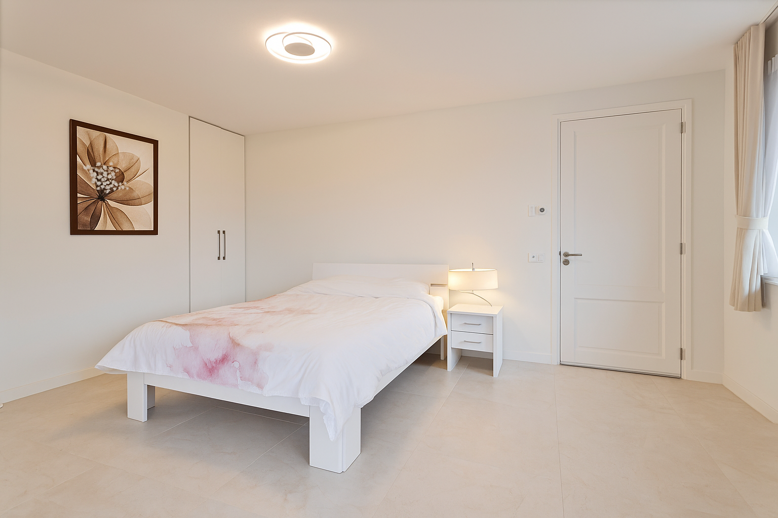 Spacious and bright entrance with toilet and storage cupboard. On the left there is a beautiful work or play room. On the right side, the door gives access to the double indoor garage. The living area (along with the kitchen) measures over 65 m2 and consists of a spacious and bright living room with fireplace, a dining area in the middle part with patio doors to the garden and a modern and luxurious open kitchen with an 'island', which is of course equipped with all modern equipment.