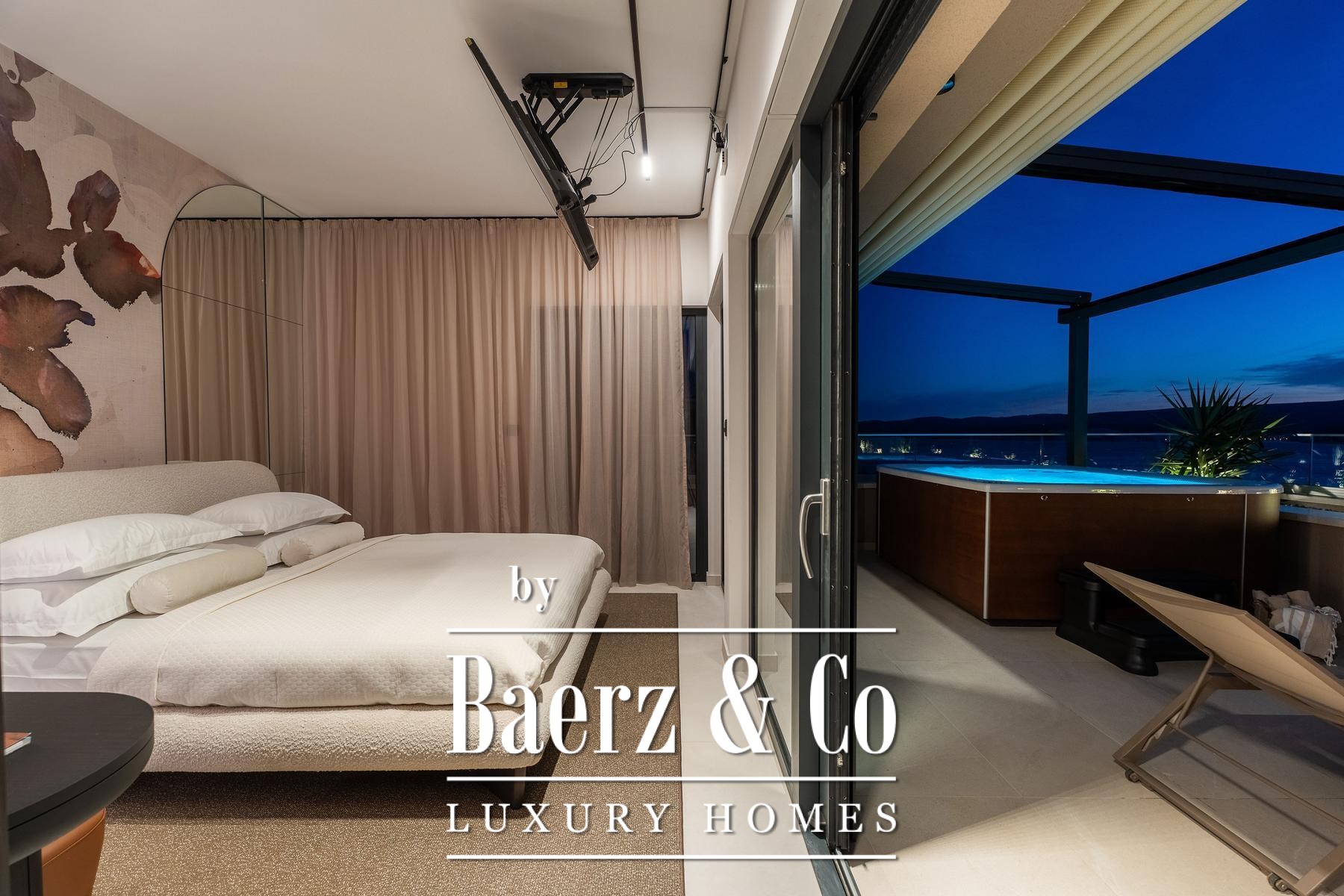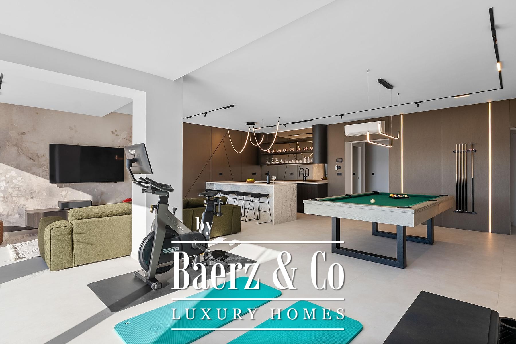 Das Design der Villa setzt auf Privatsphäre mit fünf großzügigen Schlafzimmern, jeweils en suite. Die Mastersuite verfügt über einen begehbaren Kleiderschrank, während sich die Wohnbereiche zu Terrassen und Loggien mit meditativen Gartenblicken öffnen. Der offene Wohn- und Essbereich im Hauptgeschoss mit Designer-Küche führt auf eine teilweise überdachte Terrasse mit Infinity-Pool, Whirlpool, Sonnenliegefläche und einem vollautomatischen Garten—eine perfekte Verbindung von Innen- und Außenleben. Im Untergeschoss bietet eine 66 m² große Entertainmentfläche, ein Fitnessraum, eine Sauna und technische Einrichtungen alles vor der eindrucksvollen Kulisse des Meeres.