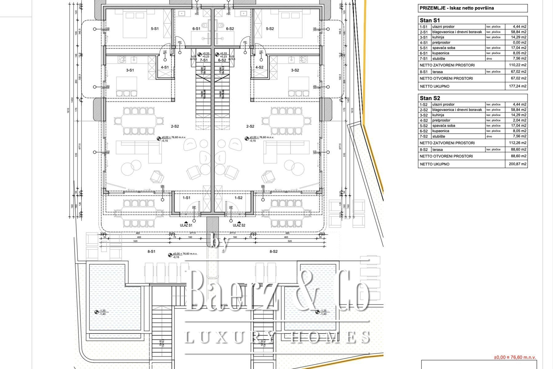 Die Doppelhaushälfte in Primošten befindet sich in einem sorgfältig konzipierten Resort und bietet 473,04 m² Wohnfläche, verteilt auf drei Etagen. Dieses Anwesen verbindet Funktionalität mit architektonischer Klarheit; vier Schlafzimmer und vier Badezimmer gewährleisten reibungslose Abläufe und Privatsphäre im Alltag. Im Untergeschoss befindet sich eine großzügige Garage für drei Fahrzeuge, ergänzt durch einen Abstellraum, einen Hauswirtschaftsraum und Einrichtungen für den Pool, was einen ruhigen Fokus auf den praktischen Nutzen widerspiegelt.