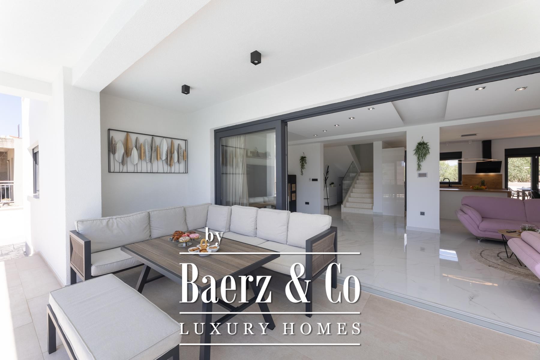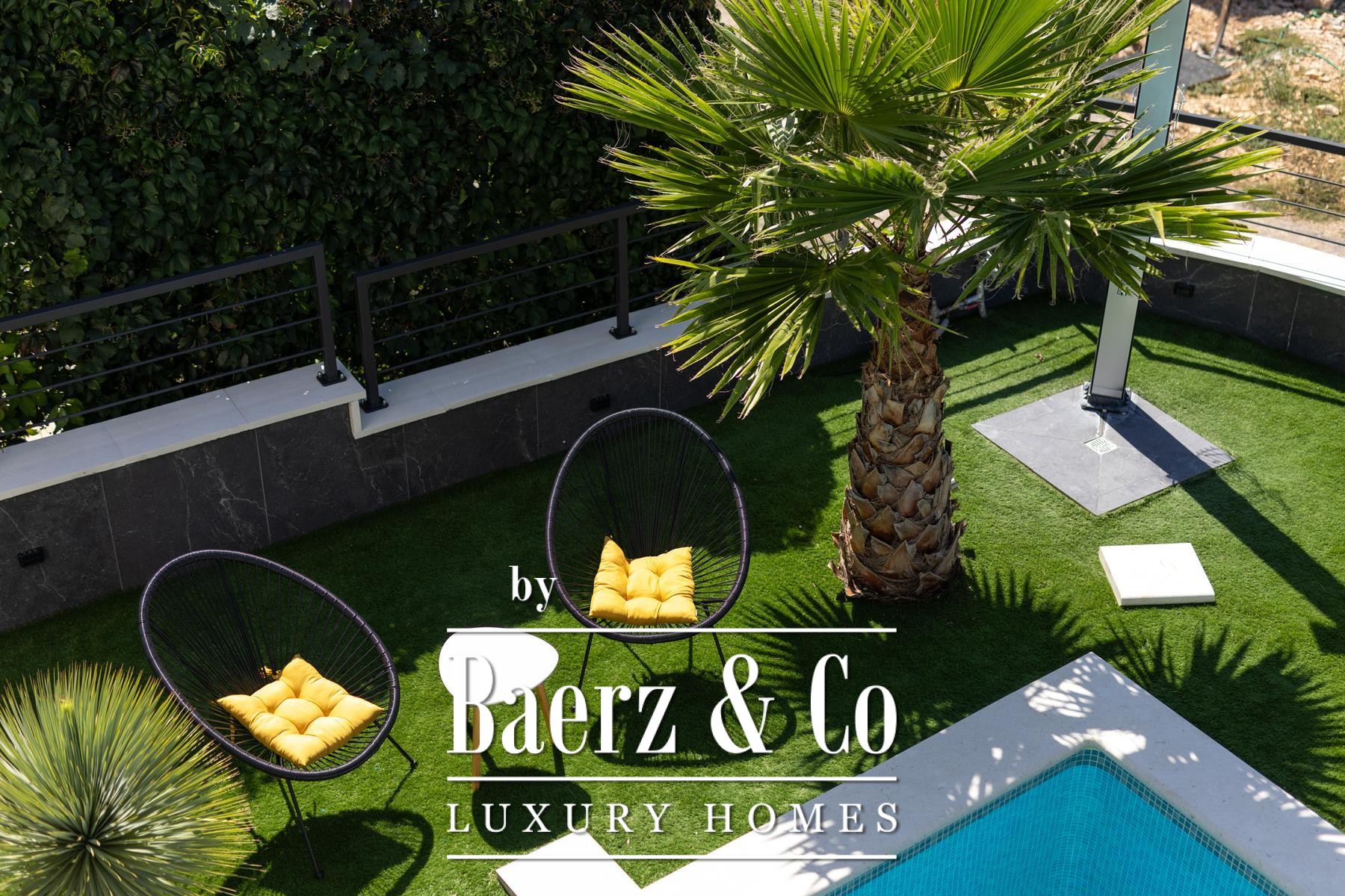 Im oberen Stockwerk befinden sich vier weitere Schlafzimmer—zwei davon mit eigenen Bädern, drei mit privaten Balkonen—und bieten zurückgezogene Ruhe. Praktischer Komfort setzt sich im Untergeschoss fort, das über eine Außentreppe erreichbar ist. Die umliegenden Gärten und Sonnenterrassen schaffen eine natürliche, ruhige Kulisse. Vier ausgewiesene Parkplätze sind dezent neben dem Haus platziert, während im hinteren Bereich eine Grillzone zum geselligen Speisen einlädt. Lediglich 2.200 Meter vom Meeresufer entfernt und in einer ruhigen Umgebung gelegen, vereint diese Villa Abgeschiedenheit mit Nähe. Hochwertige Möbel und Geräte runden das Angebot ab und machen diese Liegenschaft zu einer besonderen Gelegenheit für stilvolles Leben an der Küste.