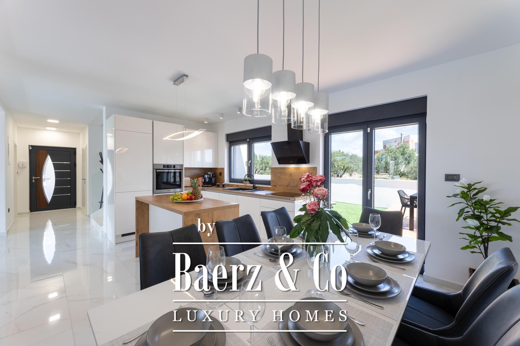 Die Villa Primošten mit Meerblick verkörpert einen modernen kroatischen Rückzugsort. Sie bietet 311,56 m² gepflegten Wohnraum und einen faszinierenden Blick auf die Adria. Fertiggestellt im Jahr 2024 auf einem 515 m² großen Grundstück, spiegelt diese Residenz zeitgenössische Architektur über drei durchdacht strukturierte Etagen wider. Im Erdgeschoss verbindet sich das lichtdurchflutete Wohnzimmer harmonisch mit Küche und Essbereich, ergänzt durch eine Suite und einen separaten Wellnessraum mit Sauna. Weitläufige Glasfronten öffnen sich auf eine überdachte Terrasse am Pool, dessen Gegenstromanlage sowohl zur Entspannung als auch für sportliche Betätigung einlädt.