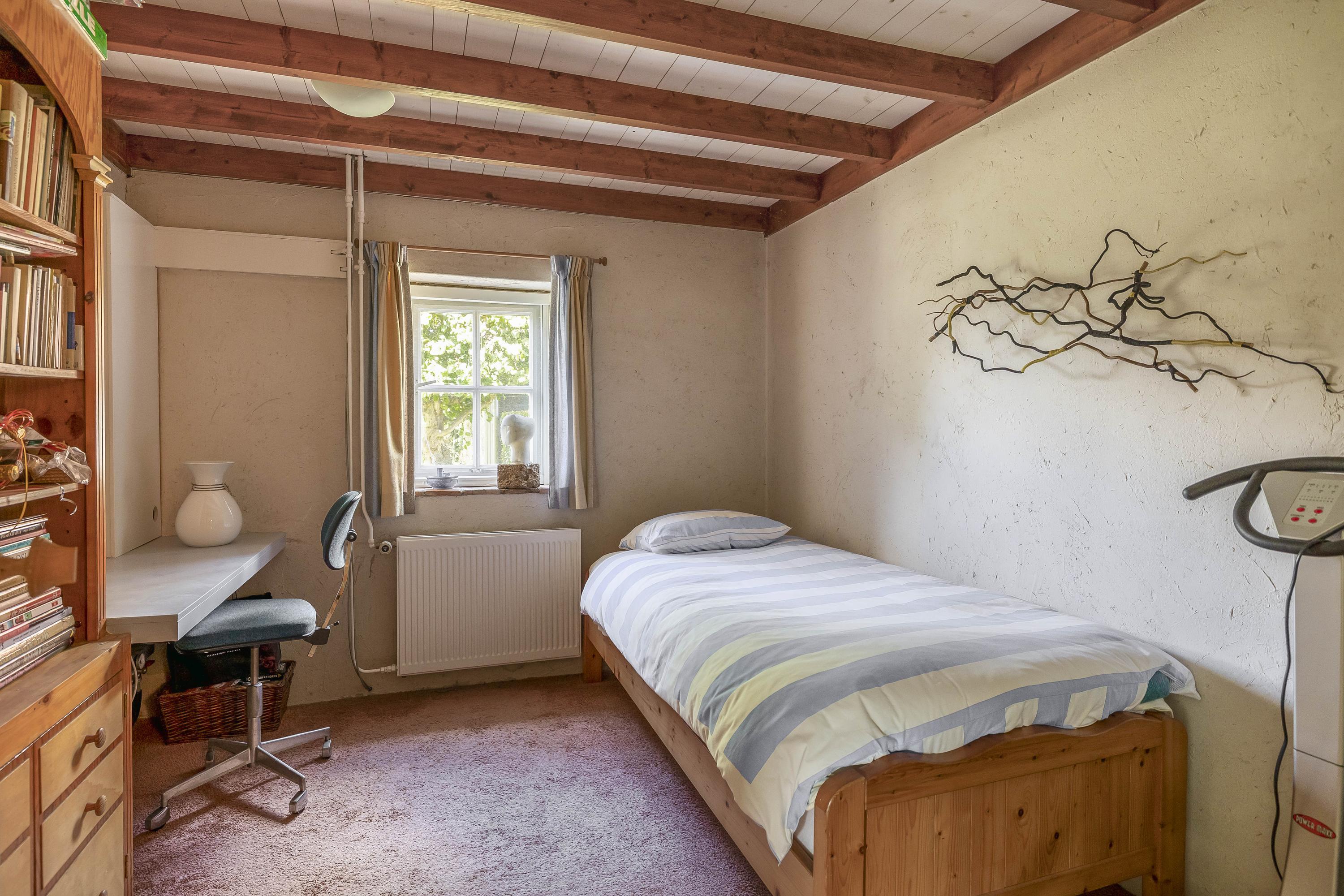 The first bedroom on this floor, located entirely on the left side of the farmhouse, is finished with carpet, stucco walls, and a beamed ceiling. This room has a large Velux skylight at the rear and a beautiful high window that extends into the kitchen on the ground floor. This spacious bedroom also has a built-in bookcase in the wall. Bedroom two, located in the middle of the house, has a similar finish and three large skylights that provide plenty of light.
