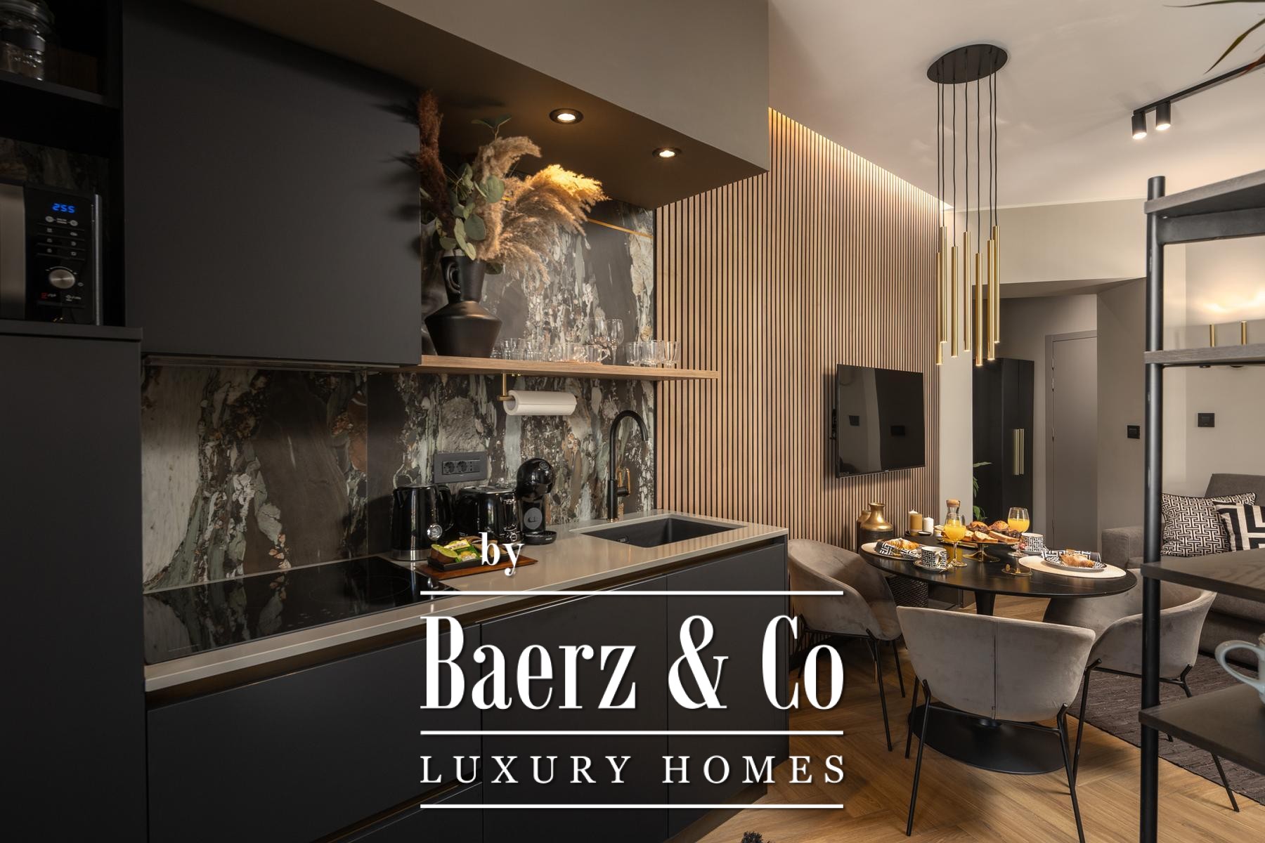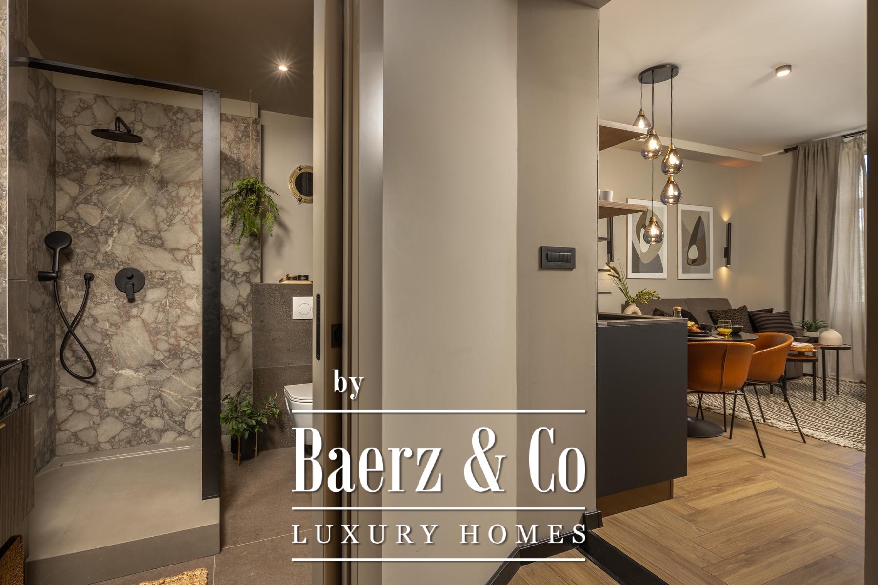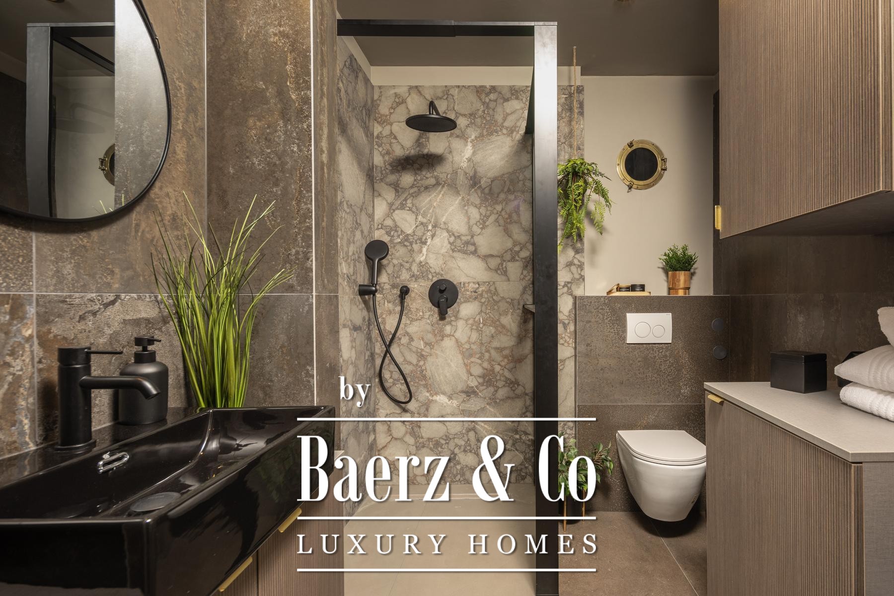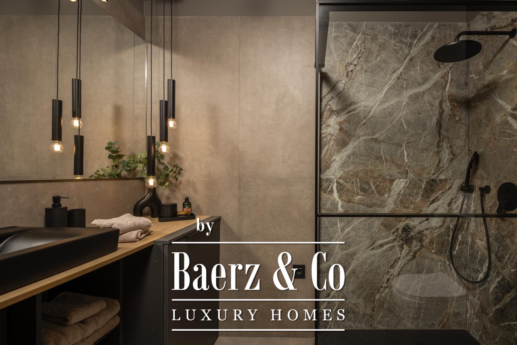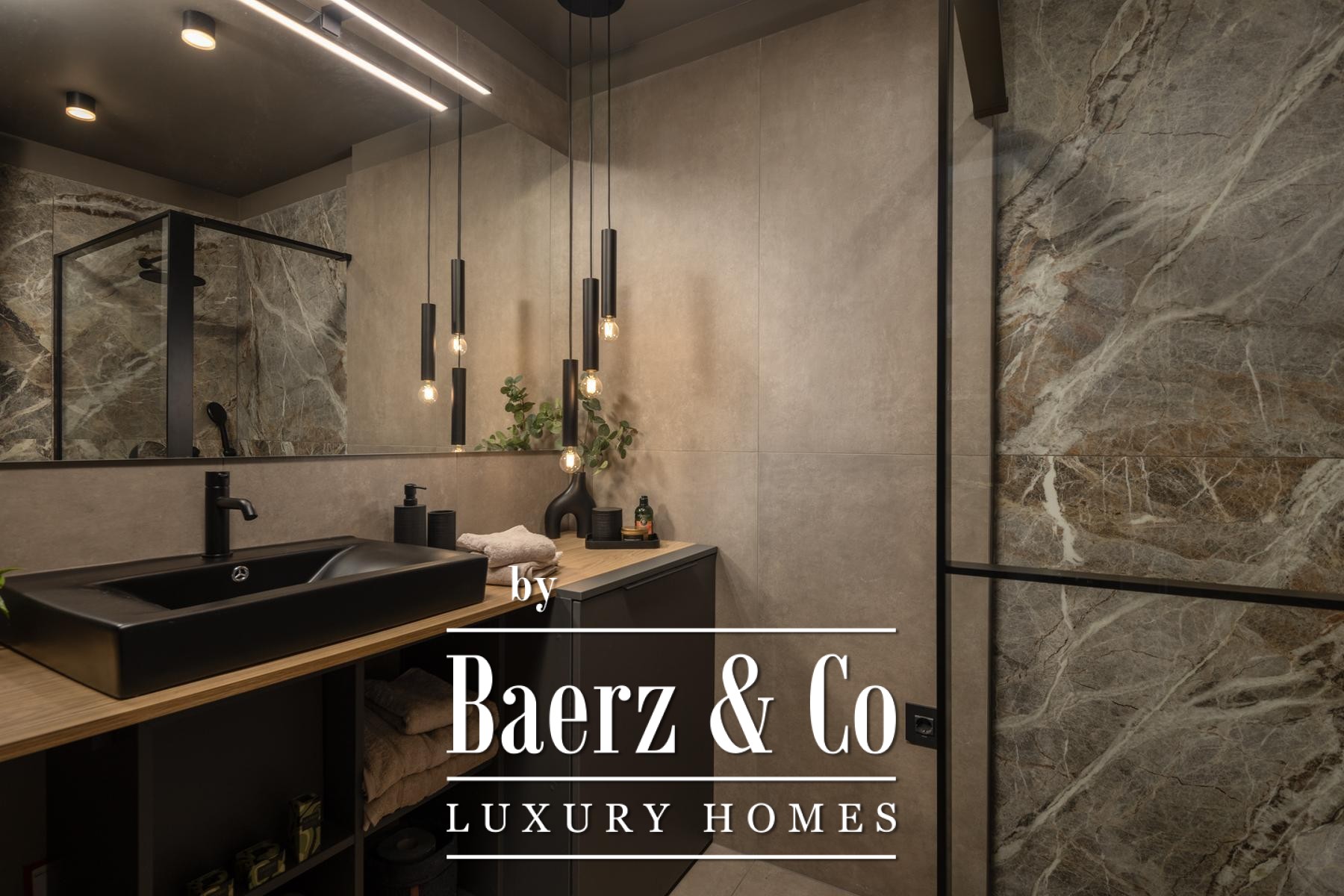 Das Interieur überzeugt durch eine elegante Kombination aus warmem Beige und Anthrazit, akzentuiert mit goldenen Details und maßgefertigter Beleuchtung. Italienische Möbel, großformatige Feinsteinzeugfliesen und matt-schwarze Veneta Cucine-Küchen mit edlen Stein-Marmor-Rückwänden verleihen eine besonders anspruchsvolle Note. Satiniertes Glas, Holzpaneele mit LED-Akzenten und Designer-Lampen aus Messing vervollständigen das Ambiente.