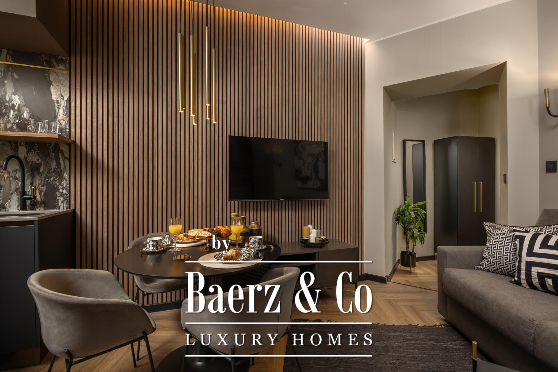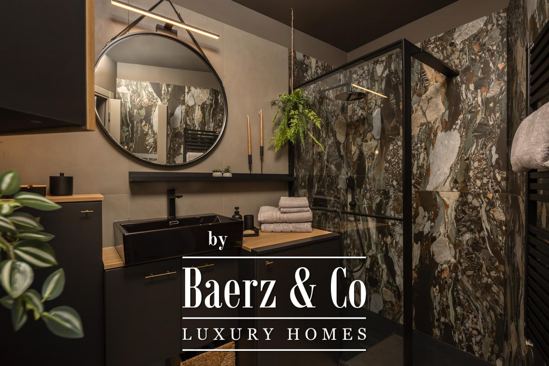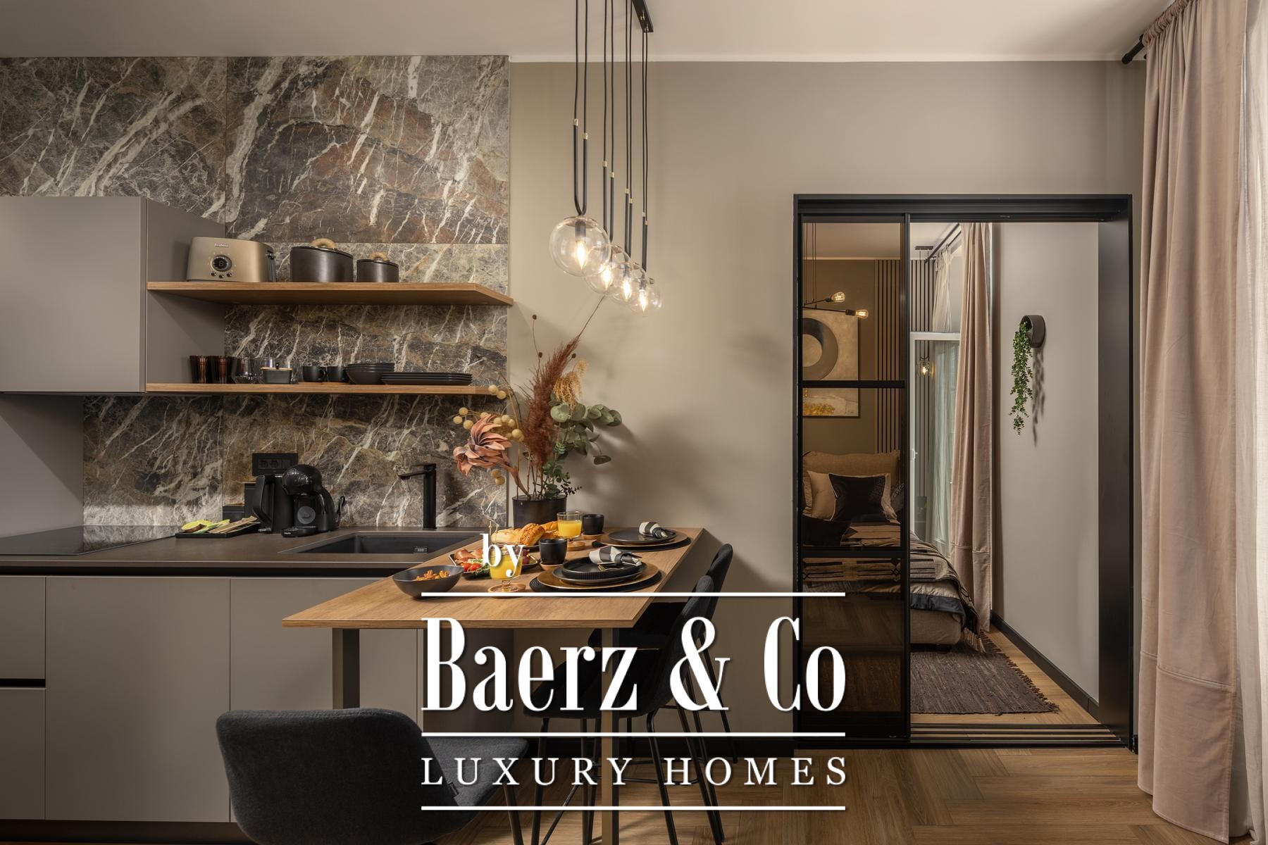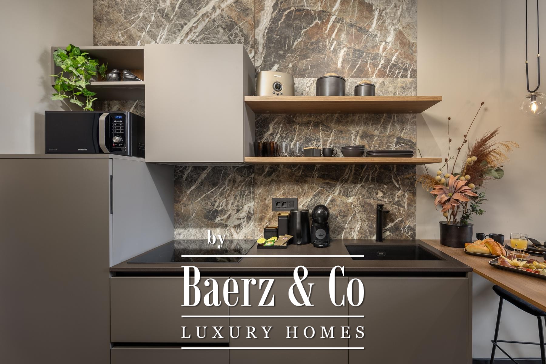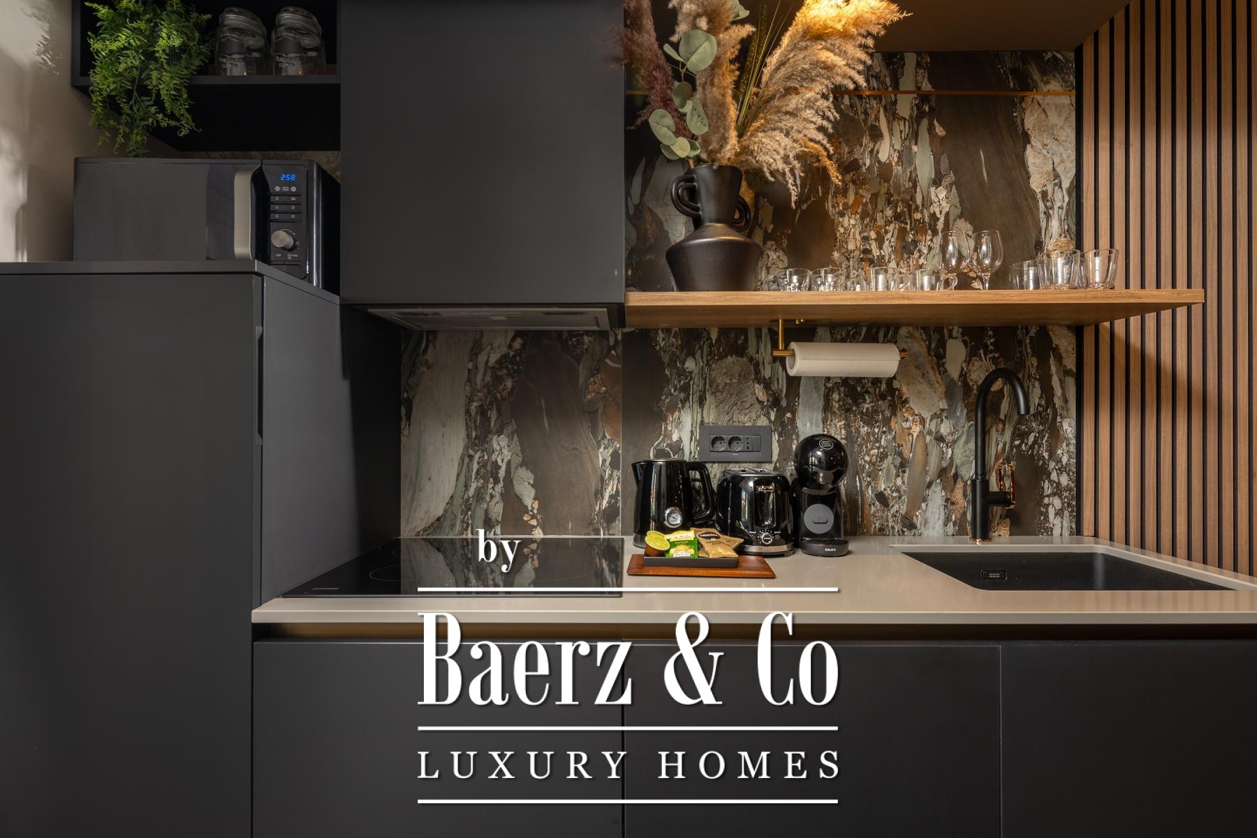 Das Interieur überzeugt durch eine elegante Kombination aus warmem Beige und Anthrazit, akzentuiert mit goldenen Details und maßgefertigter Beleuchtung. Italienische Möbel, großformatige Feinsteinzeugfliesen und matt-schwarze Veneta Cucine-Küchen mit edlen Stein-Marmor-Rückwänden verleihen eine besonders anspruchsvolle Note. Satiniertes Glas, Holzpaneele mit LED-Akzenten und Designer-Lampen aus Messing vervollständigen das Ambiente.
