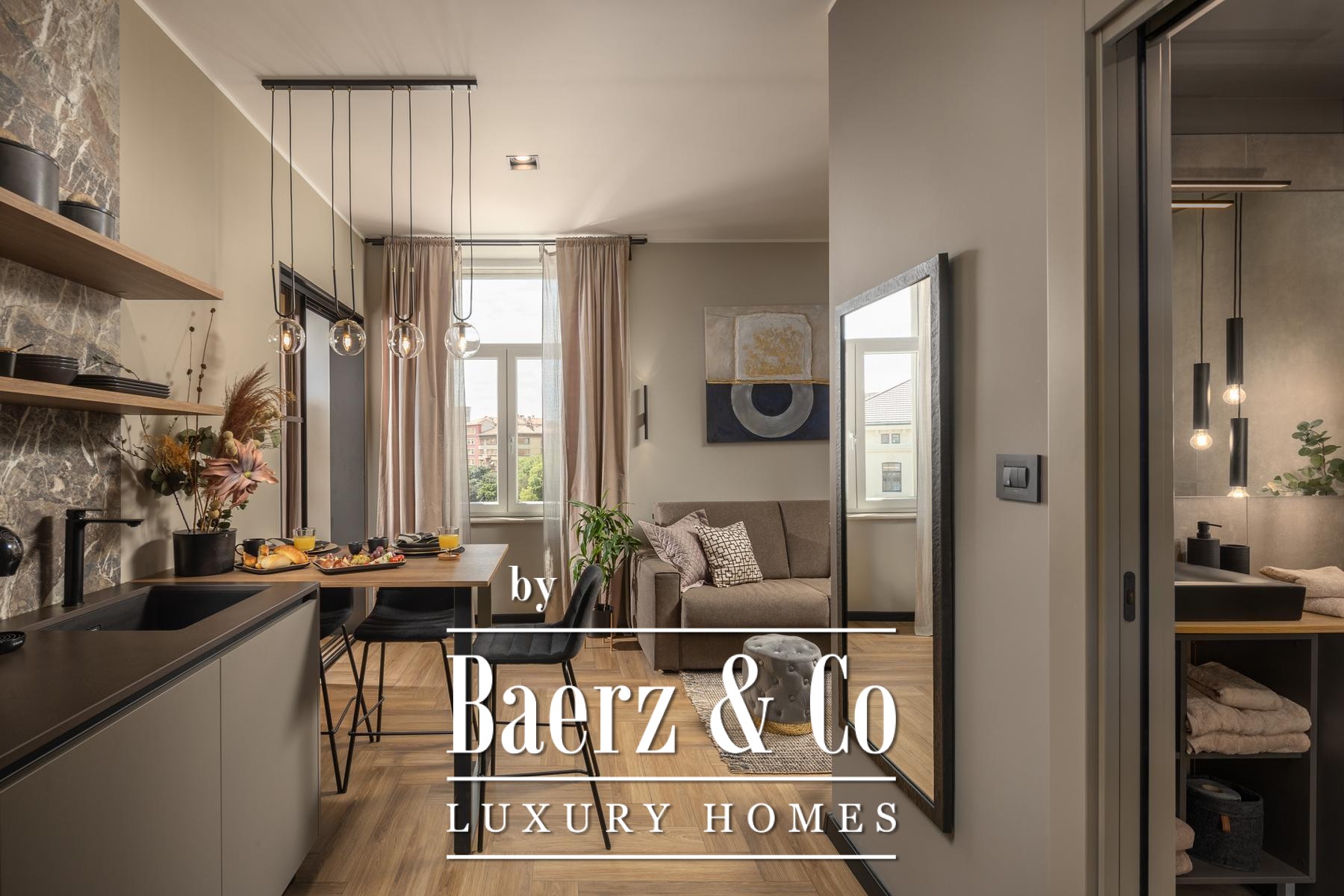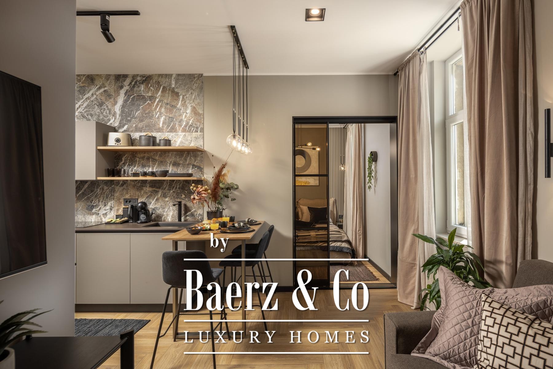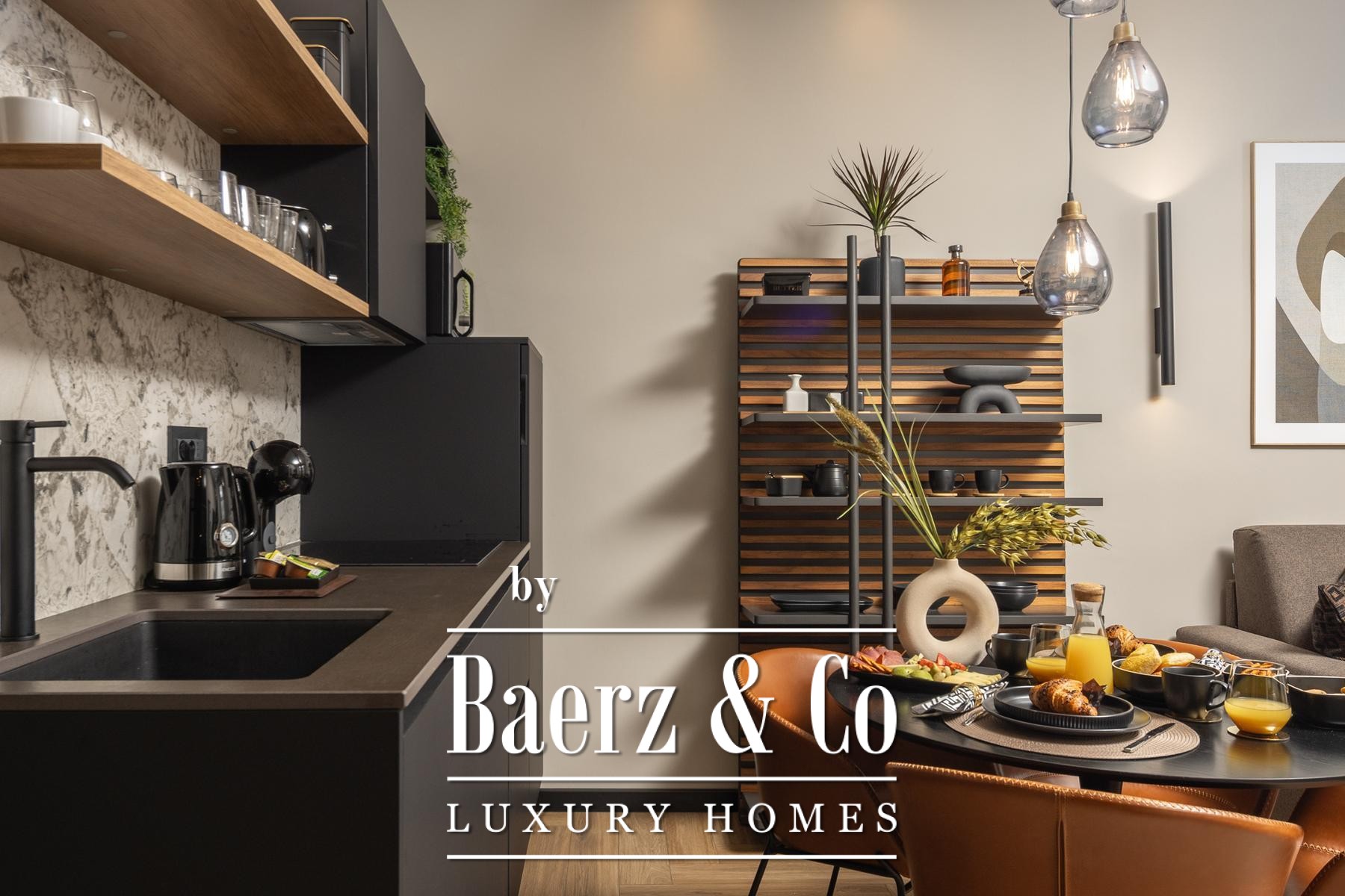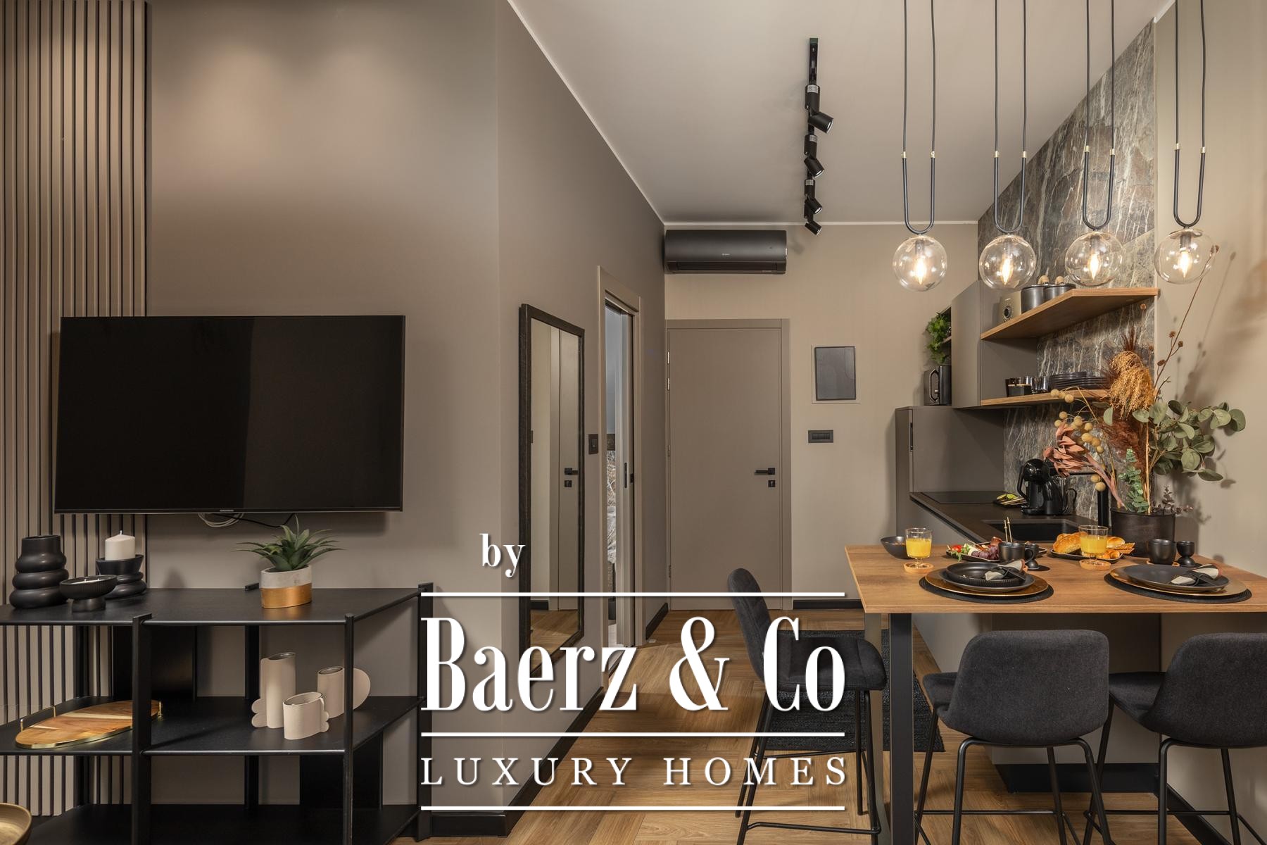 Das Interieur überzeugt durch eine elegante Kombination aus warmem Beige und Anthrazit, akzentuiert mit goldenen Details und maßgefertigter Beleuchtung. Italienische Möbel, großformatige Feinsteinzeugfliesen und matt-schwarze Veneta Cucine-Küchen mit edlen Stein-Marmor-Rückwänden verleihen eine besonders anspruchsvolle Note. Satiniertes Glas, Holzpaneele mit LED-Akzenten und Designer-Lampen aus Messing vervollständigen das Ambiente.