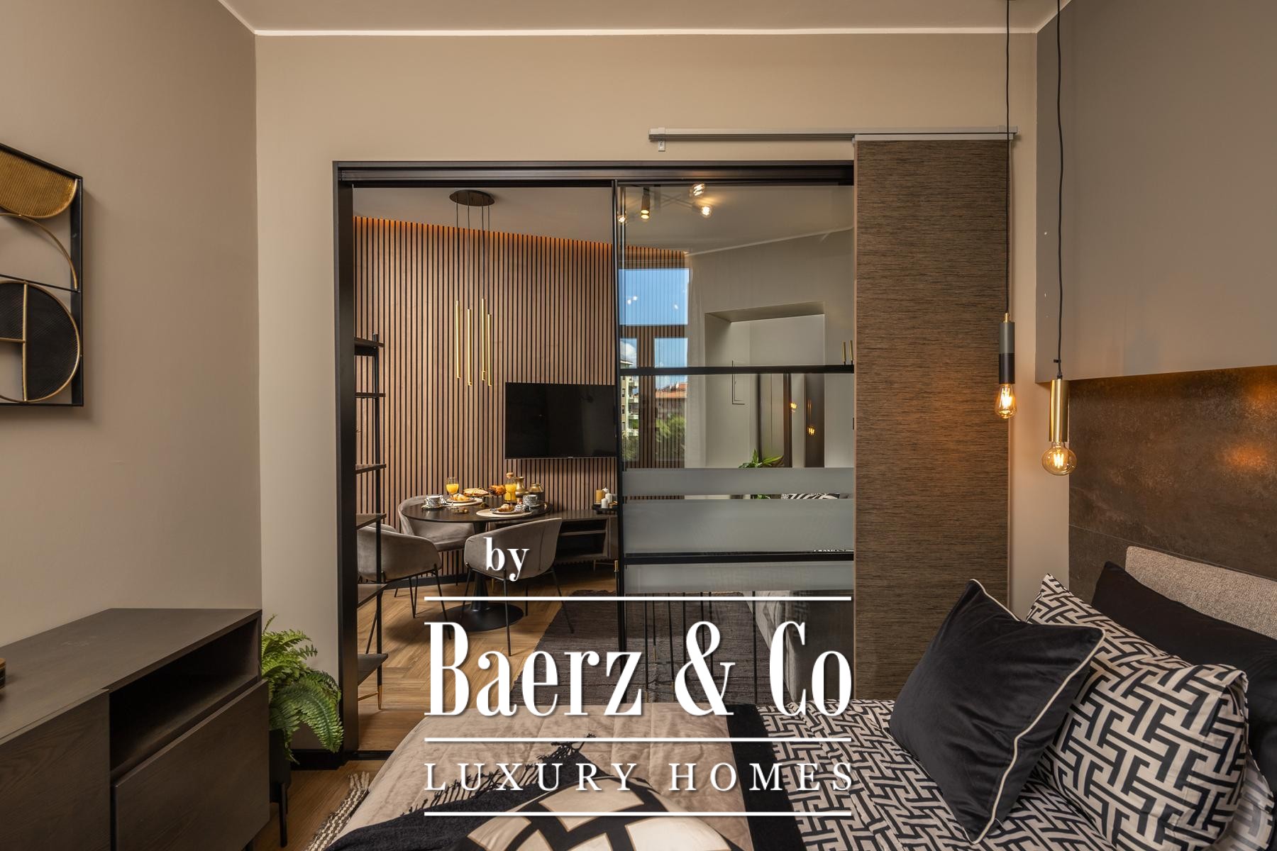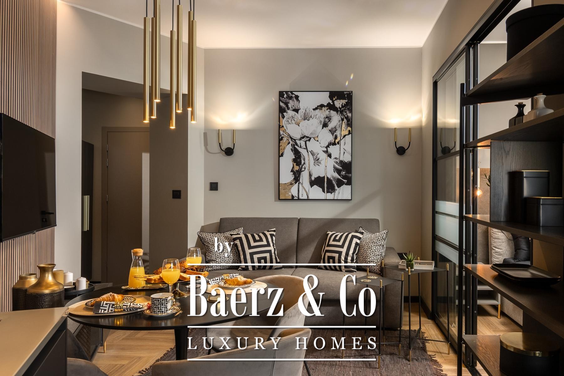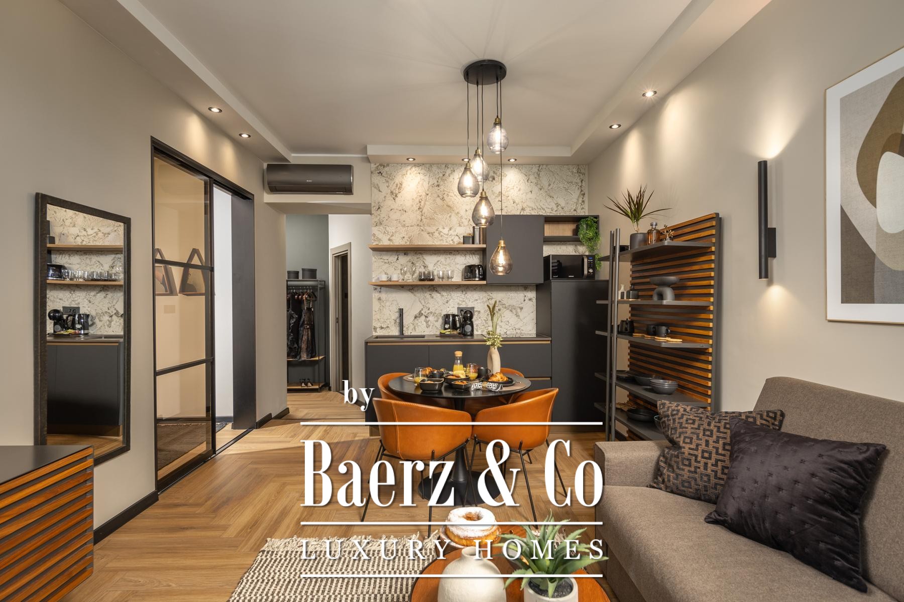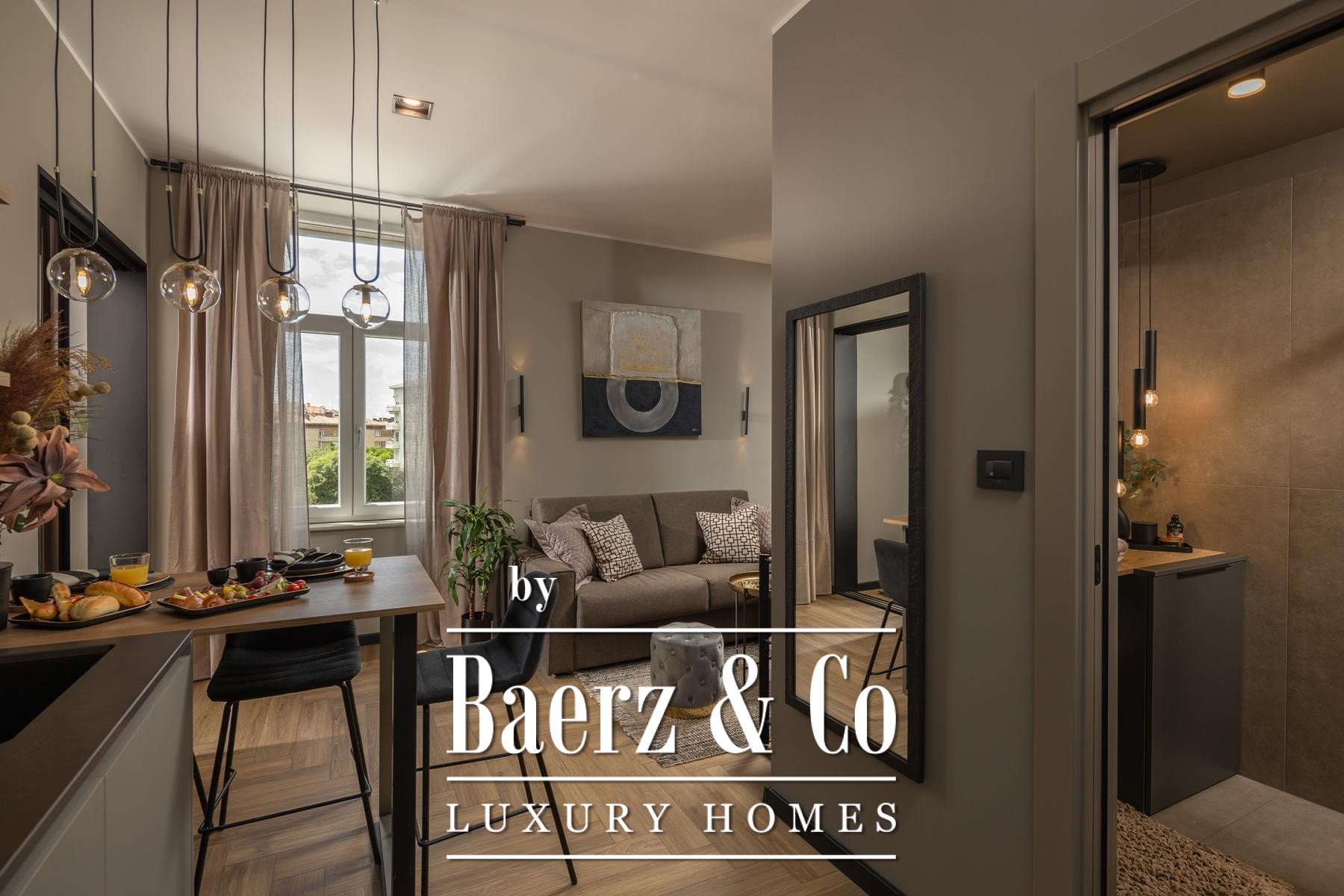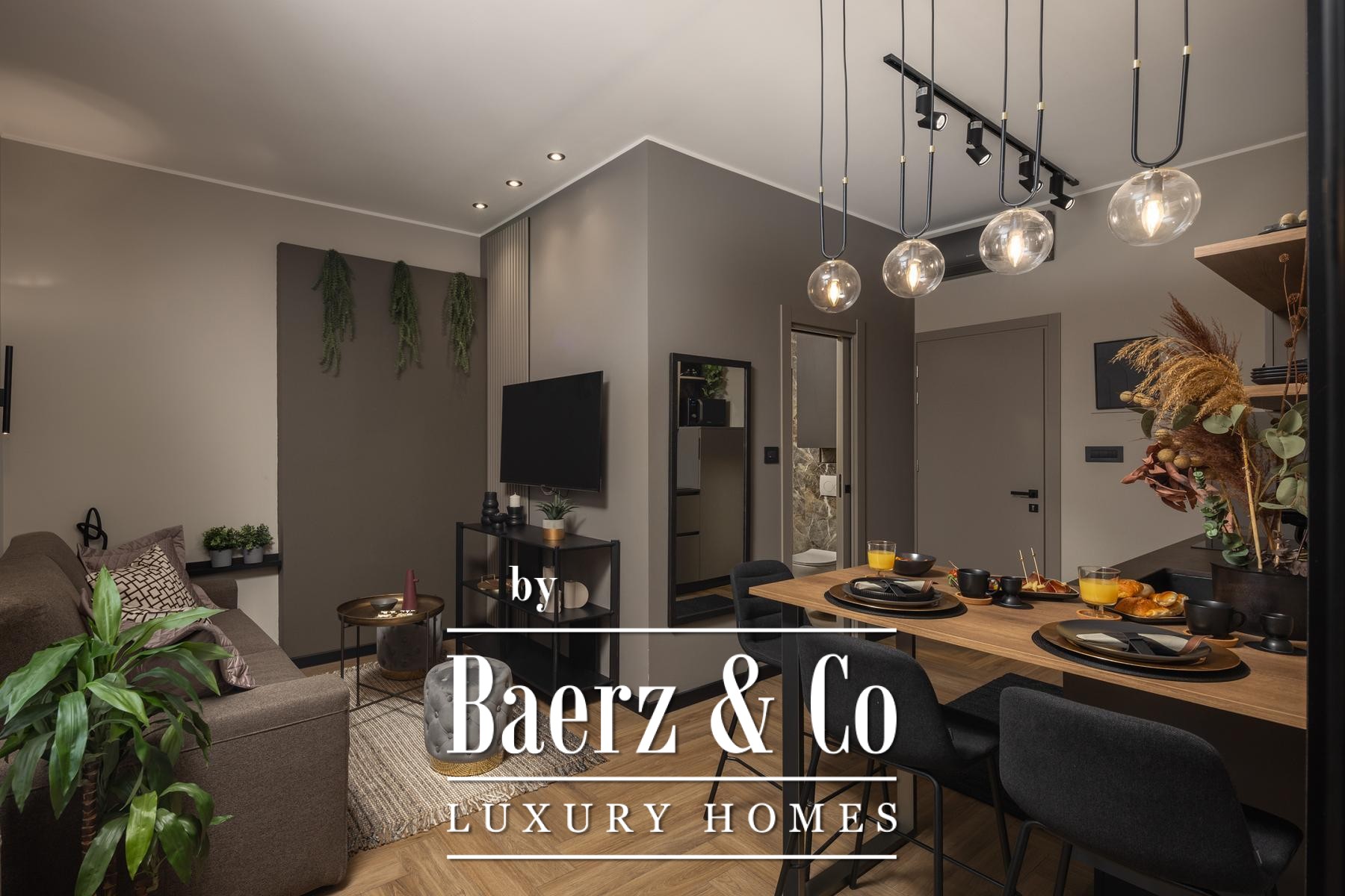 Das Interieur überzeugt durch eine elegante Kombination aus warmem Beige und Anthrazit, akzentuiert mit goldenen Details und maßgefertigter Beleuchtung. Italienische Möbel, großformatige Feinsteinzeugfliesen und matt-schwarze Veneta Cucine-Küchen mit edlen Stein-Marmor-Rückwänden verleihen eine besonders anspruchsvolle Note. Satiniertes Glas, Holzpaneele mit LED-Akzenten und Designer-Lampen aus Messing vervollständigen das Ambiente.