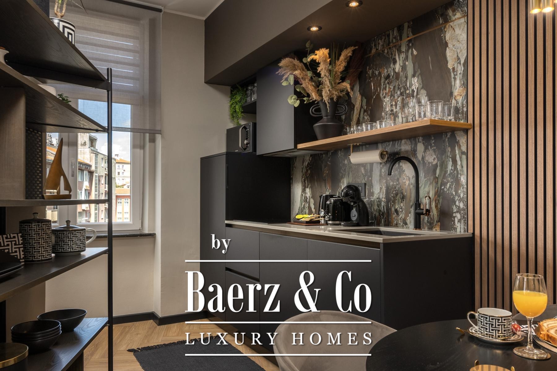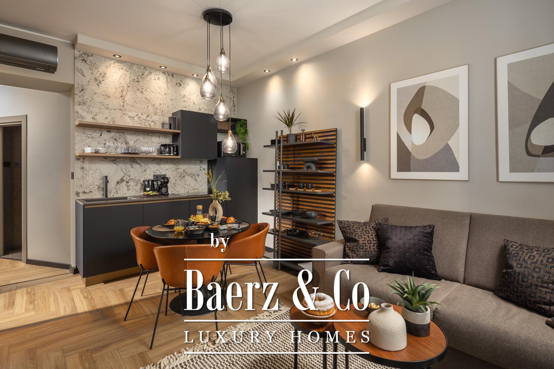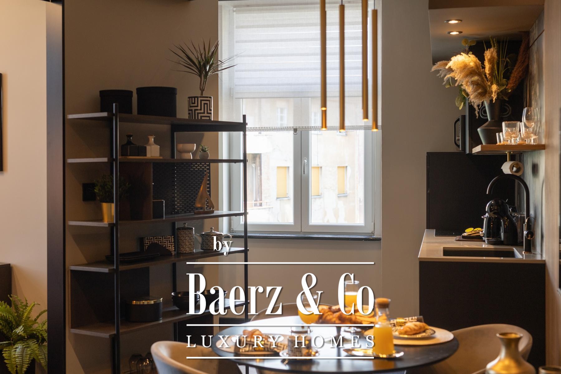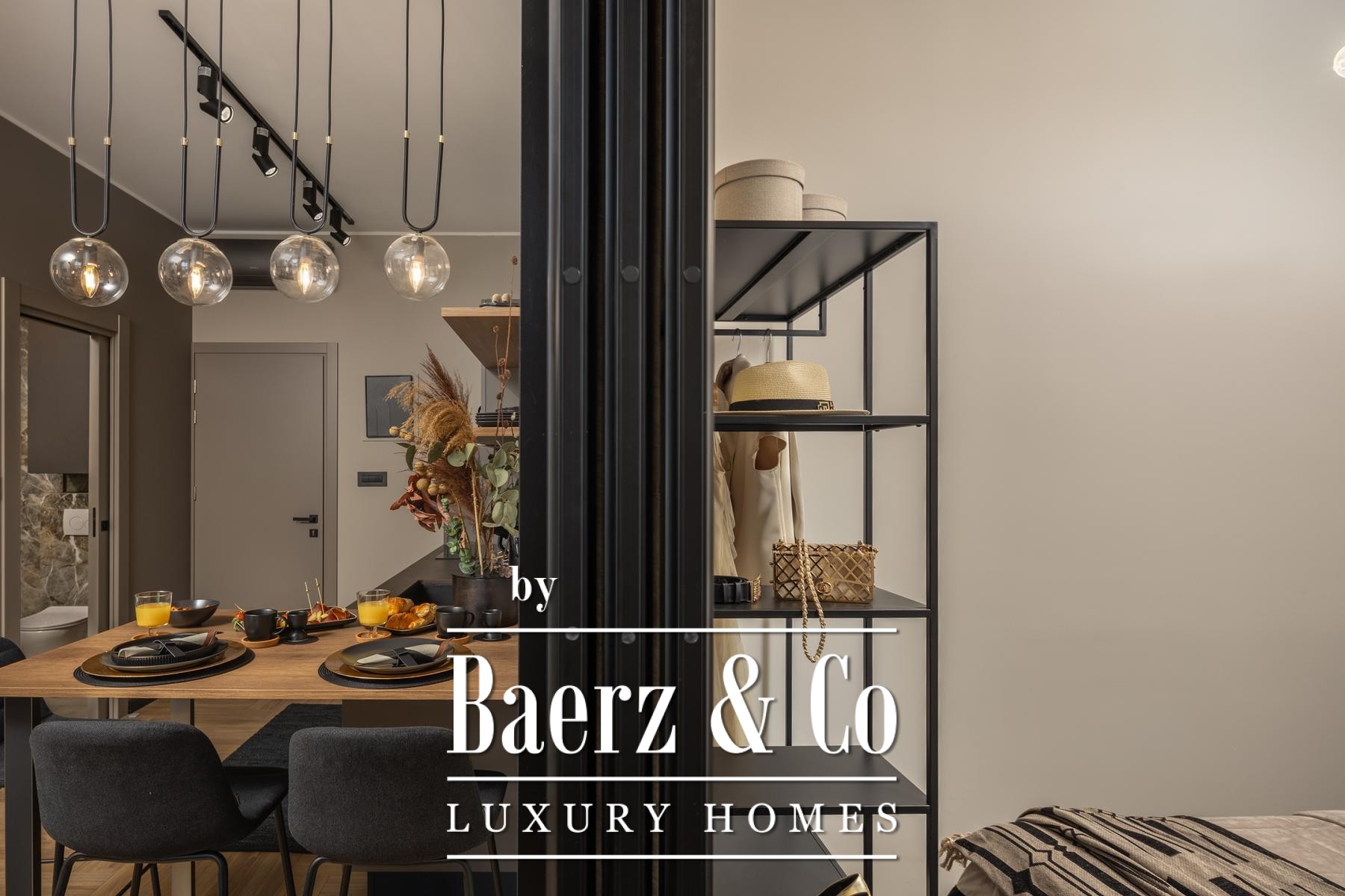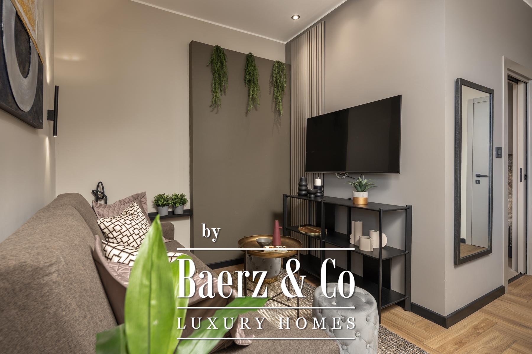 Das Interieur überzeugt durch eine elegante Kombination aus warmem Beige und Anthrazit, akzentuiert mit goldenen Details und maßgefertigter Beleuchtung. Italienische Möbel, großformatige Feinsteinzeugfliesen und matt-schwarze Veneta Cucine-Küchen mit edlen Stein-Marmor-Rückwänden verleihen eine besonders anspruchsvolle Note. Satiniertes Glas, Holzpaneele mit LED-Akzenten und Designer-Lampen aus Messing vervollständigen das Ambiente.