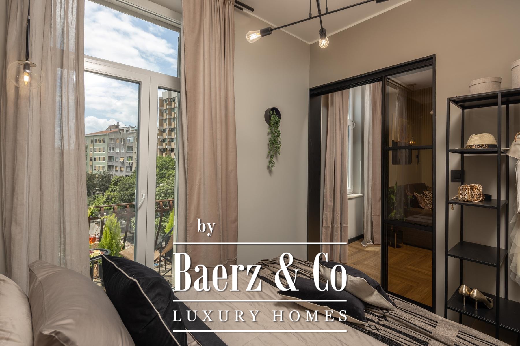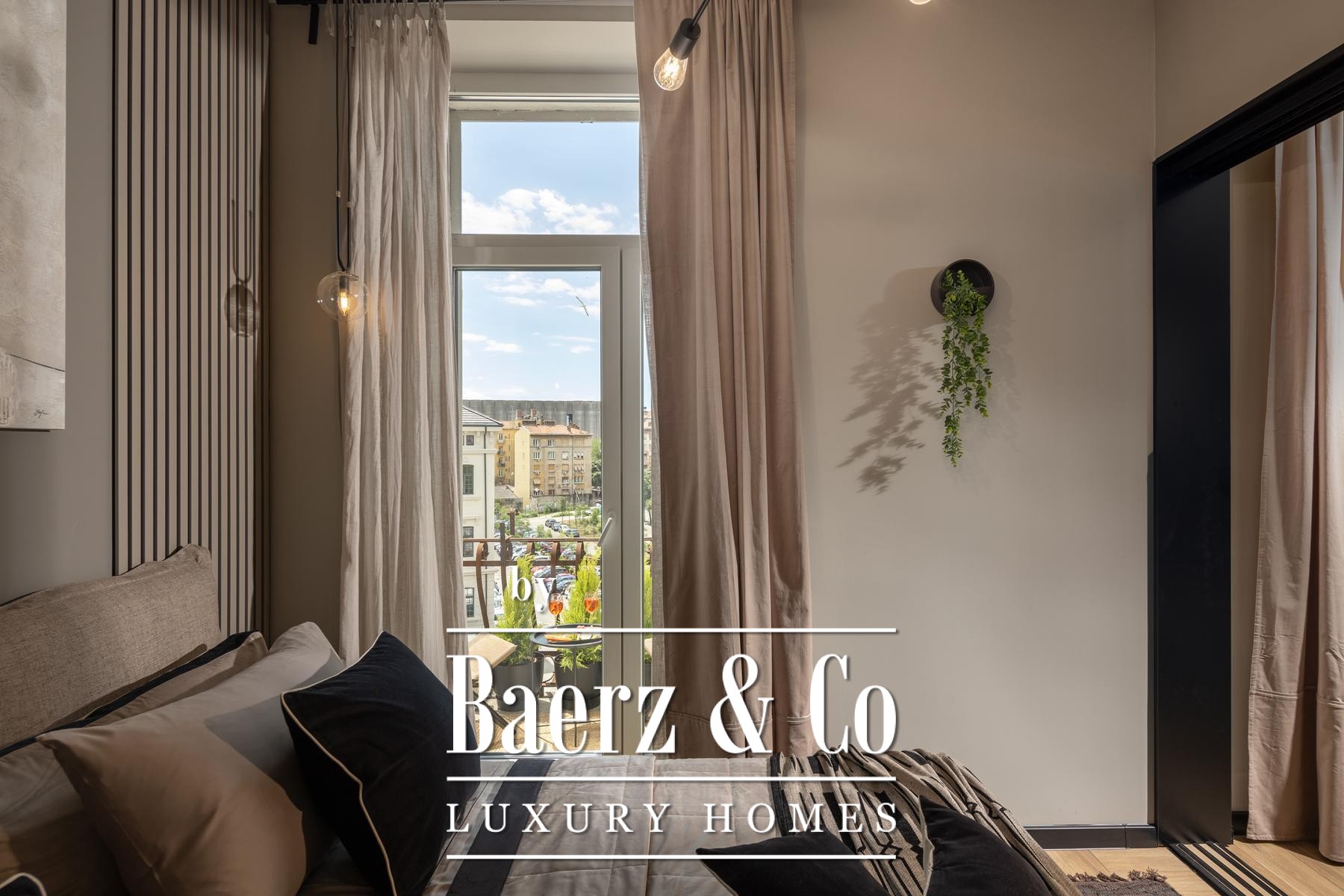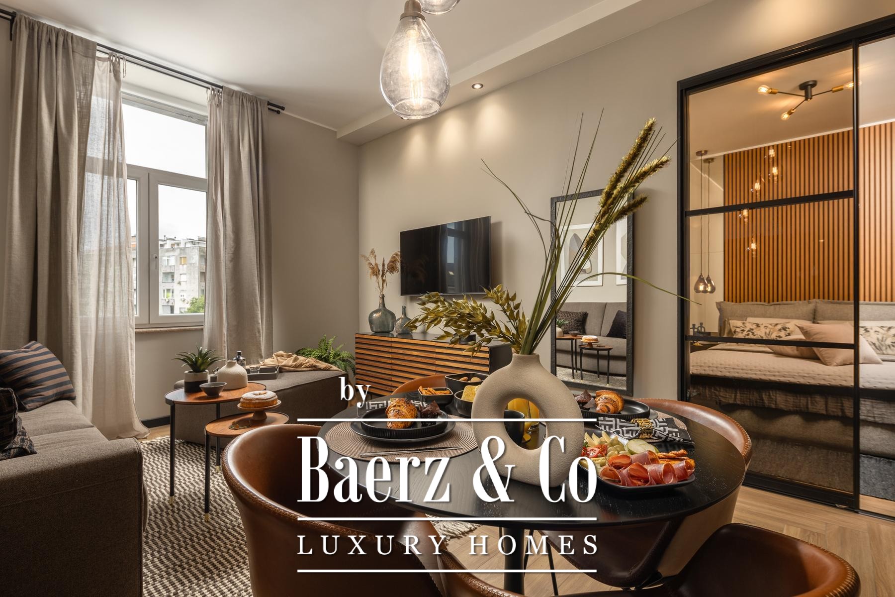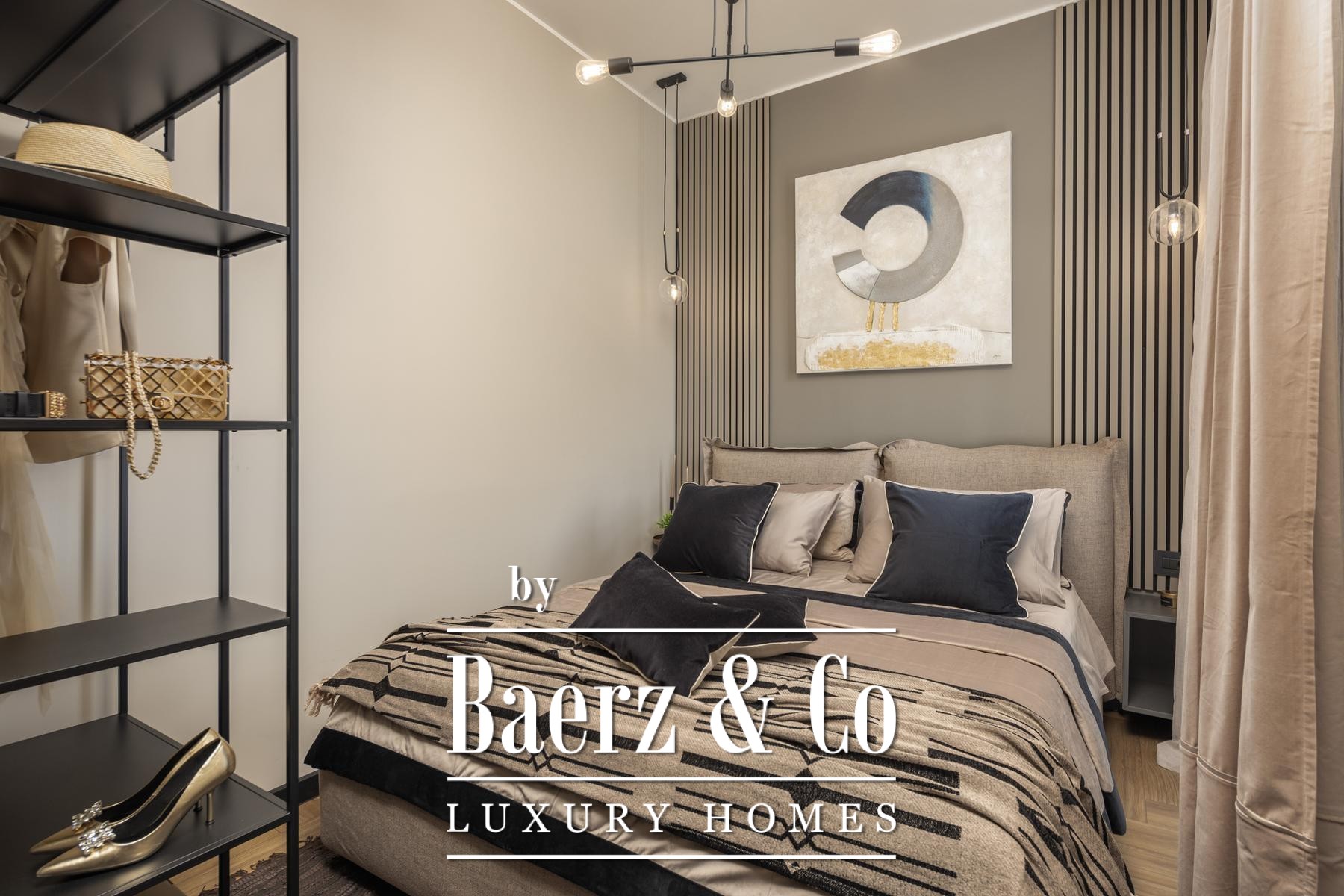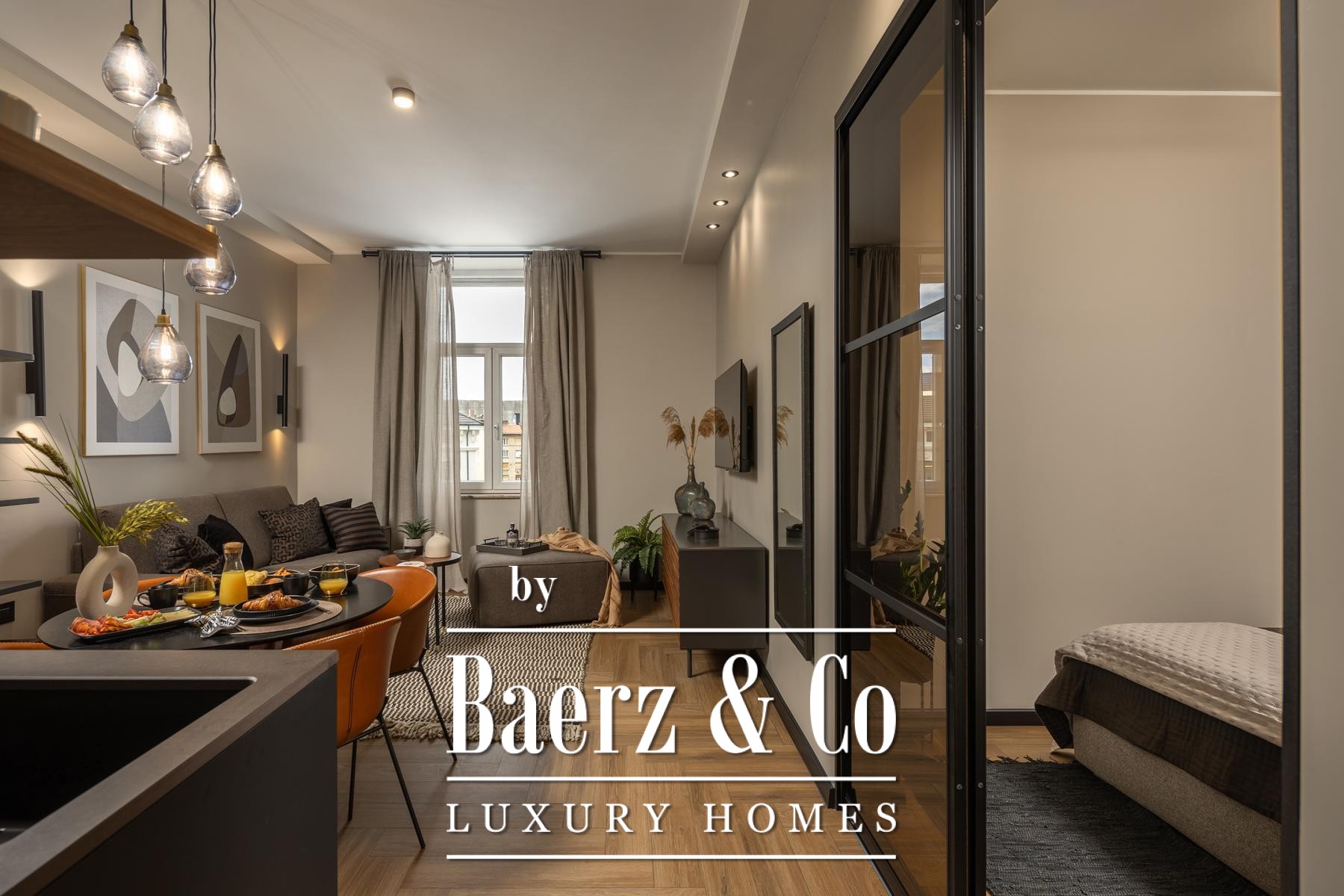 Das Interieur überzeugt durch eine elegante Kombination aus warmem Beige und Anthrazit, akzentuiert mit goldenen Details und maßgefertigter Beleuchtung. Italienische Möbel, großformatige Feinsteinzeugfliesen und matt-schwarze Veneta Cucine-Küchen mit edlen Stein-Marmor-Rückwänden verleihen eine besonders anspruchsvolle Note. Satiniertes Glas, Holzpaneele mit LED-Akzenten und Designer-Lampen aus Messing vervollständigen das Ambiente.
