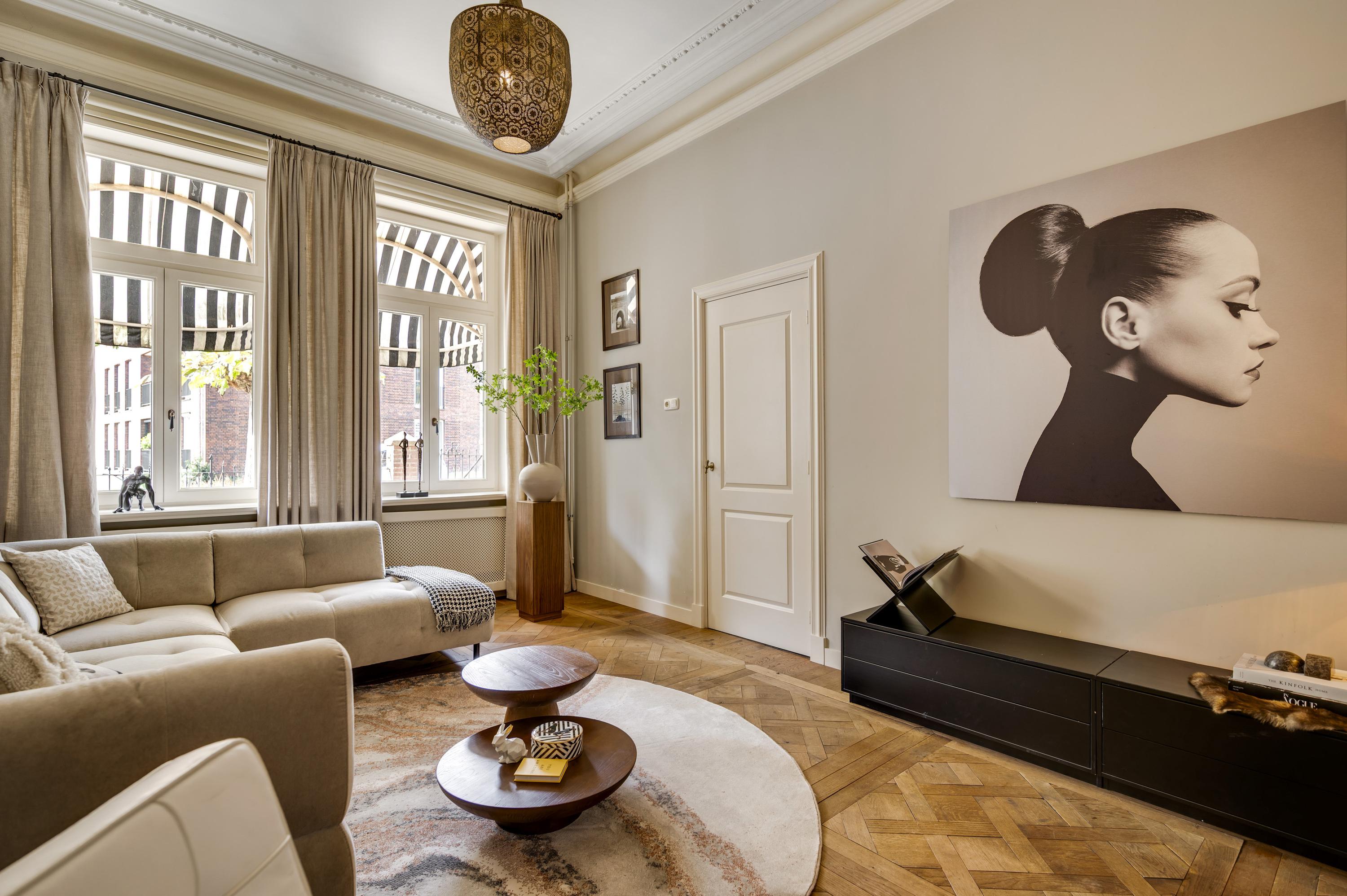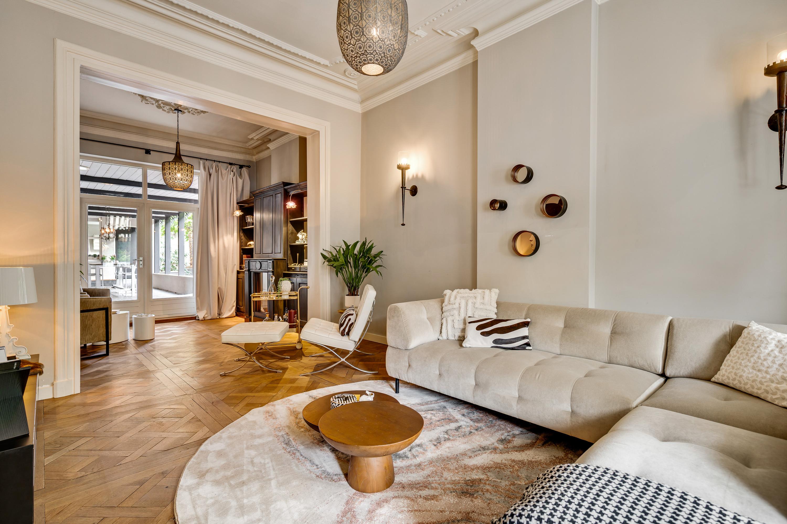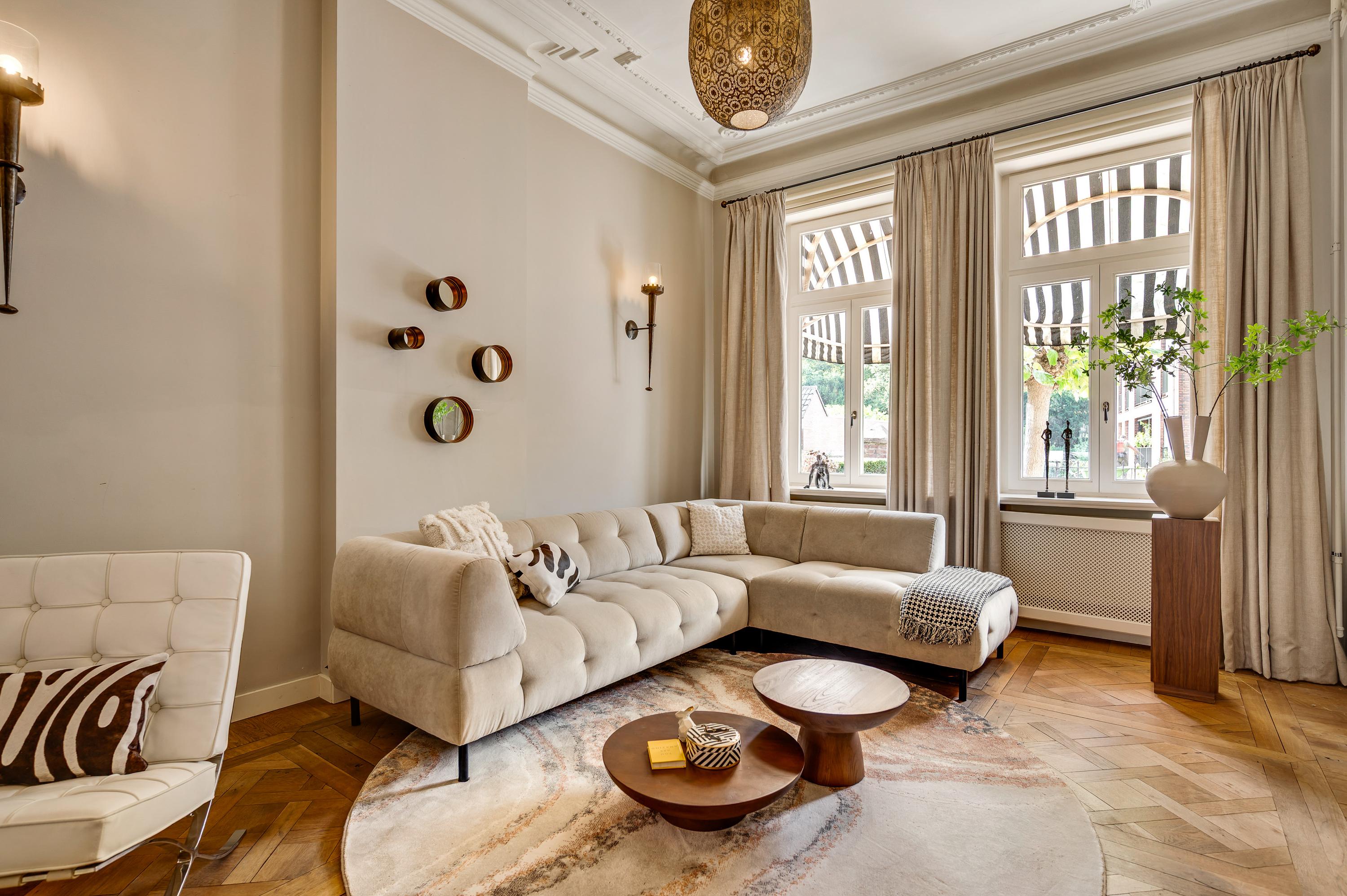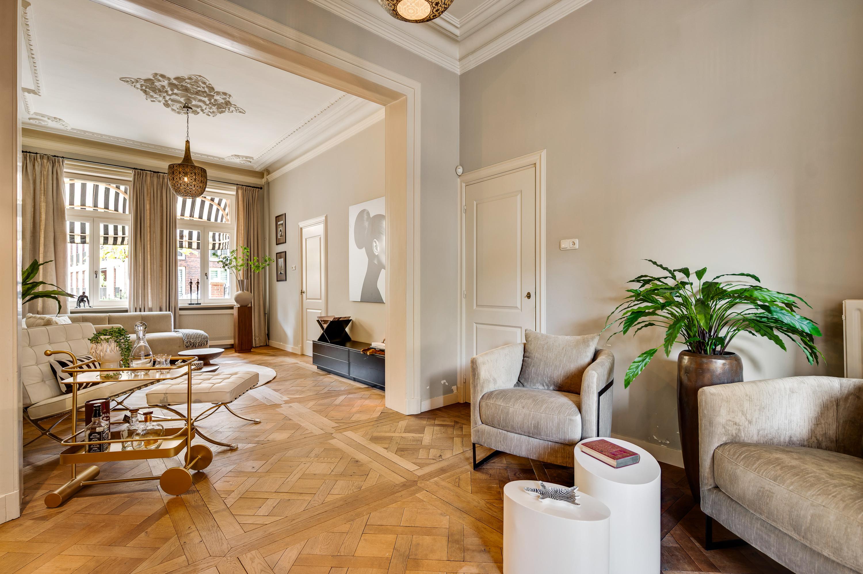 Das Herrenhaus Roermond präsentiert sich als stattliche Residenz im beliebten Viertel Kapel in ’t Zand, wo klassische Grandezza auf modernen Komfort im Herzen der Stadt trifft. Mit einer Wohnfläche von 420 m² auf einem 576 m² großen Grundstück repräsentiert diese Immobilie gehobenes städtisches Wohnen und ermöglicht zugleich Privatsphäre wie auch Nähe zum lebendigen Zentrum von Roermond. Hinter der imposanten Fassade verbinden sich neun Schlafzimmer, drei Bäder und ein elegantes Arbeitszimmer zu einem durchdachten, fließenden Raumkonzept. Das fast zehn Meter lange Wohnzimmer ist mit einem Versailles-Stabparkett und hohen Fenstern ausgestattet; französische Türen führen auf eine überdachte Terrasse und in einen ruhigen Stadtgarten – eine private Oase mitten im urbanen Leben.