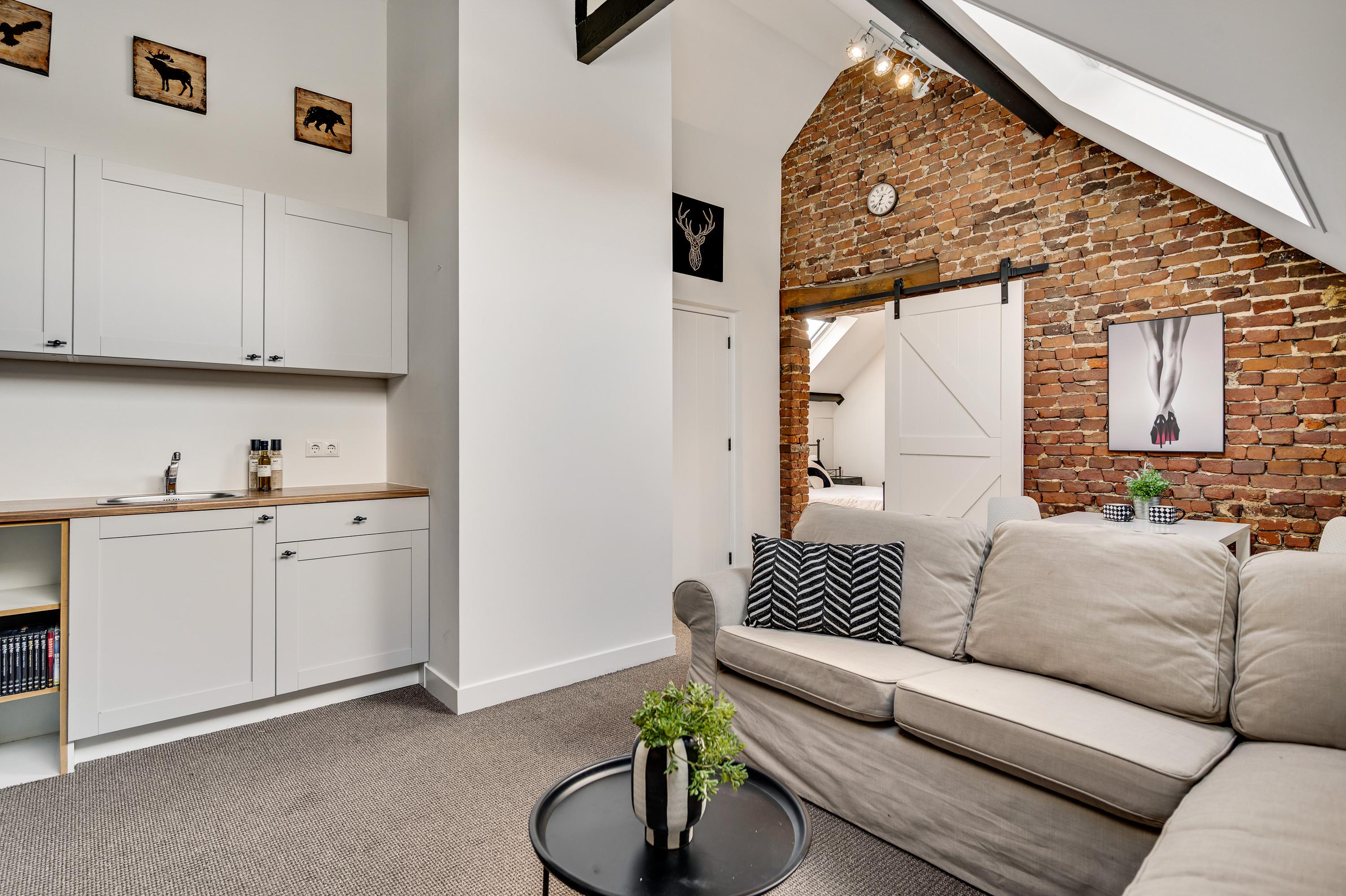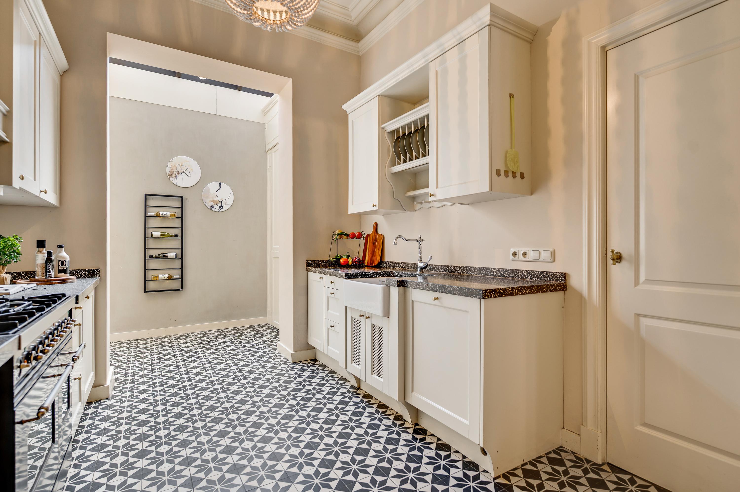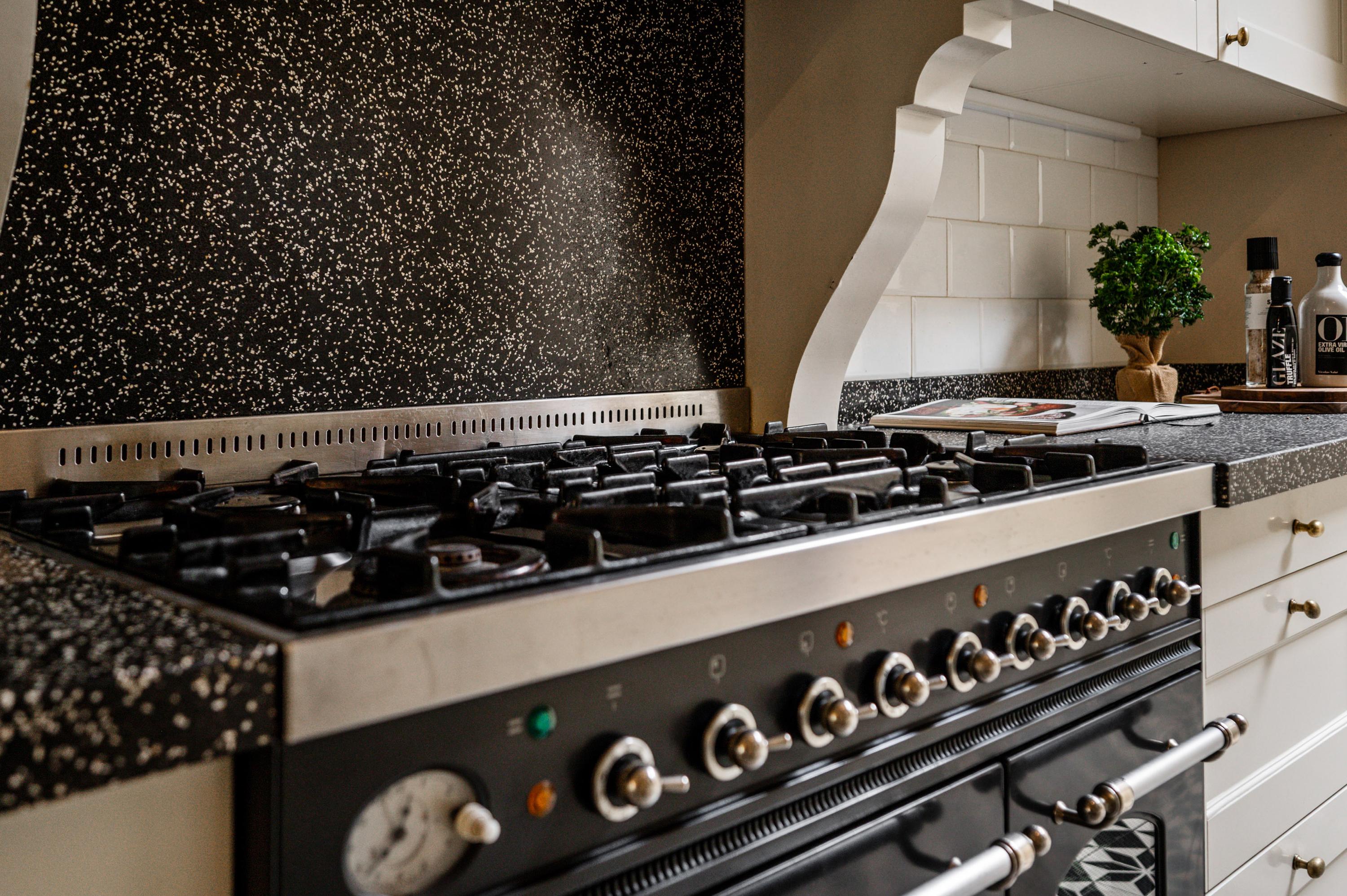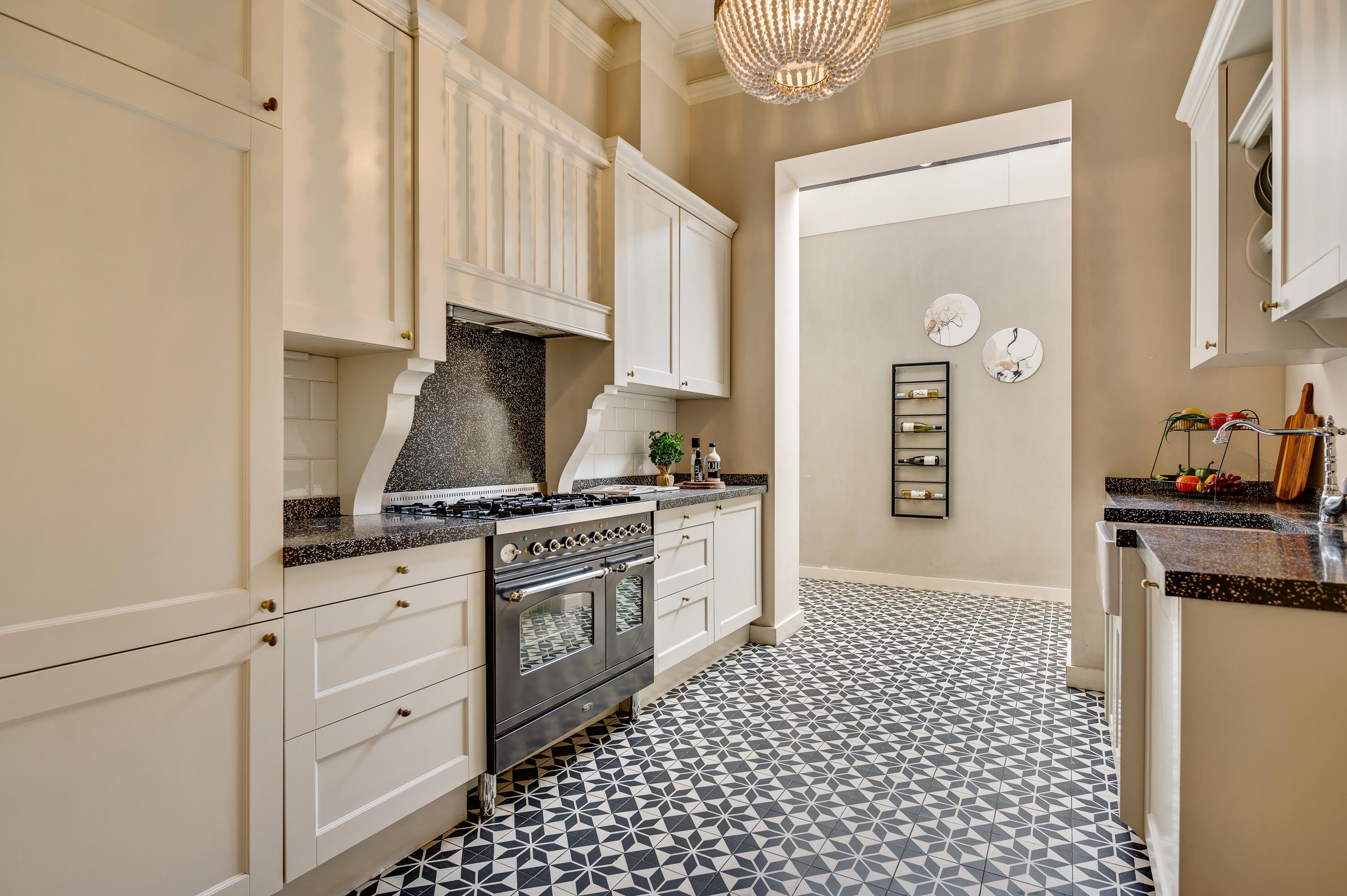Die Wohnküche mit etwa 25 m² Fläche zelebriert Handwerkskunst mit einer Terrazzo-Arbeitsplatte, einem Boretti-Sechsflammenherd mit Doppelbackofen und hochwertigen Einbaugeräten. Flexibles Wohnen bietet das voll ausgestattete Studio-Apartment im Erdgeschoss ebenso wie das 2019 eingerichtete Studio im Dachgeschoss mit Pantryküche – ideal für Gäste oder Homeoffice.
