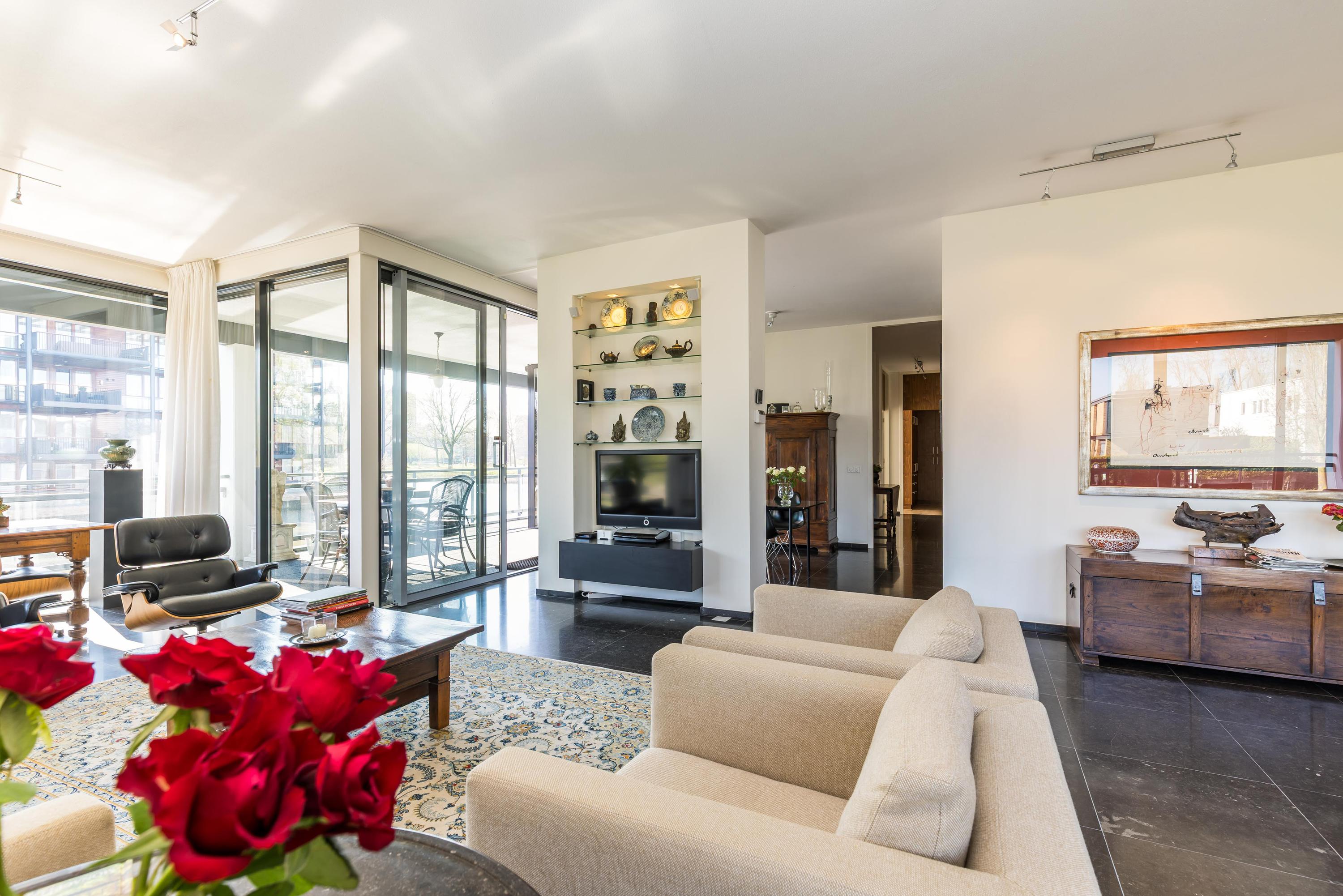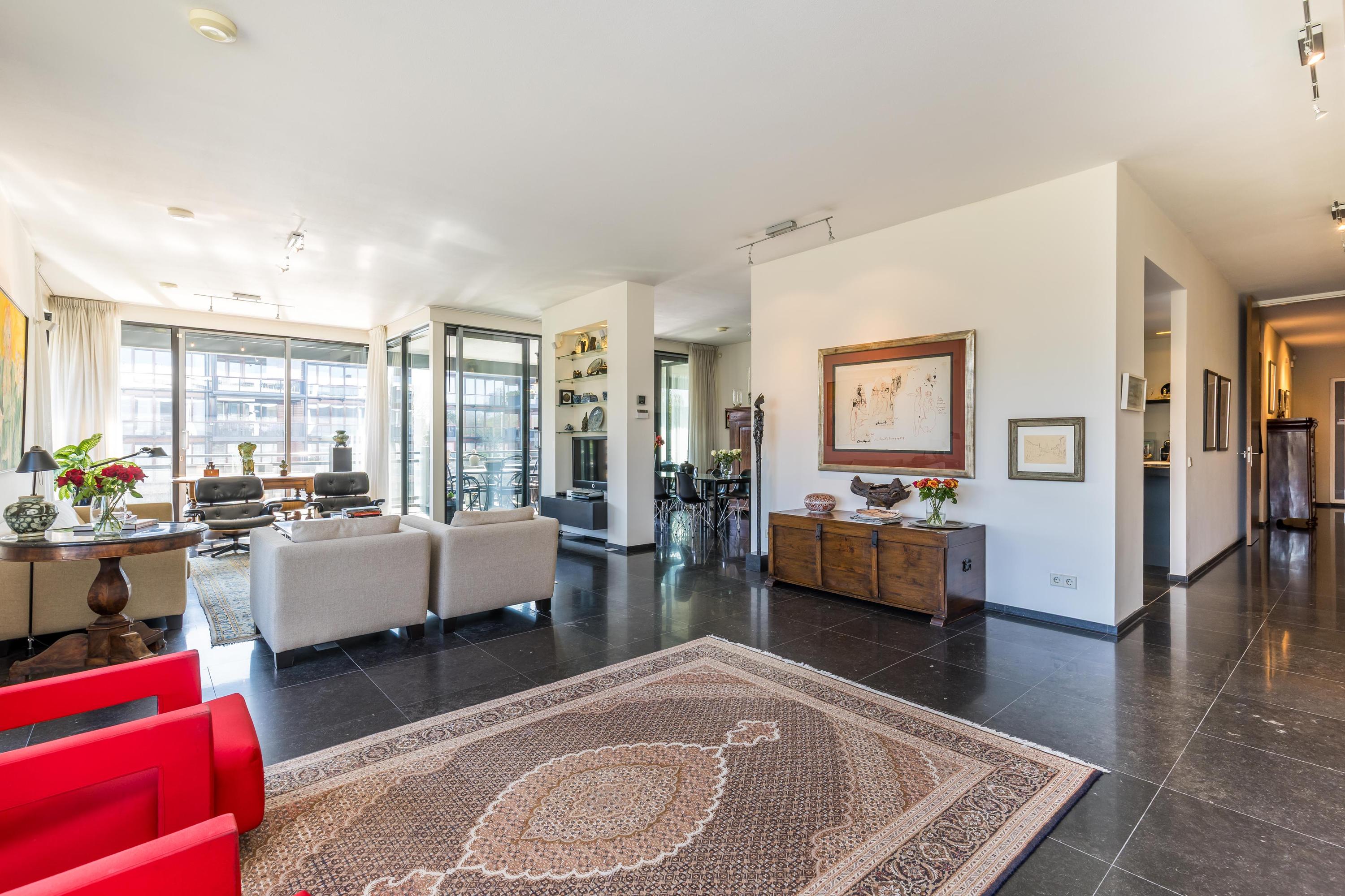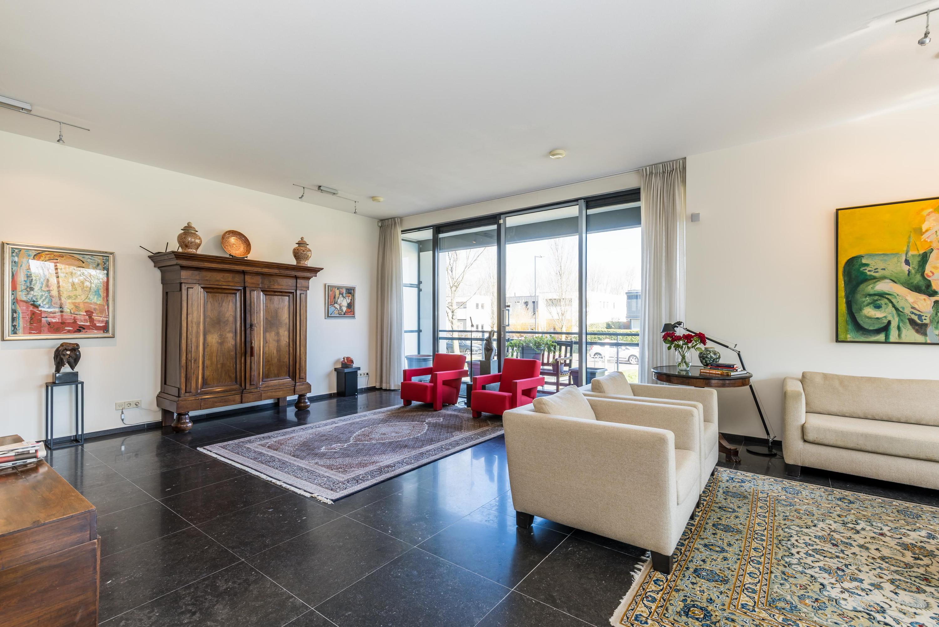 Het appartement is gelegen op eigen grond, volledig voorzien van vloerverwarming, volledig voorzien van dubbel glas en beschikt over een energielabel A. De aanwezigheid van een dubbele liftinstallatie, 2 privé parkeerplaatsen, de algehele luxe afwerking van zowel het appartement als de bijzonder ruim opgezette algemene ruimtes maken het geheel tot een zeer aantrekkelijk appartement. Het ontwerp van de architect is gebaseerd op een ontwerp van de beroemde architect Le Corbusier.