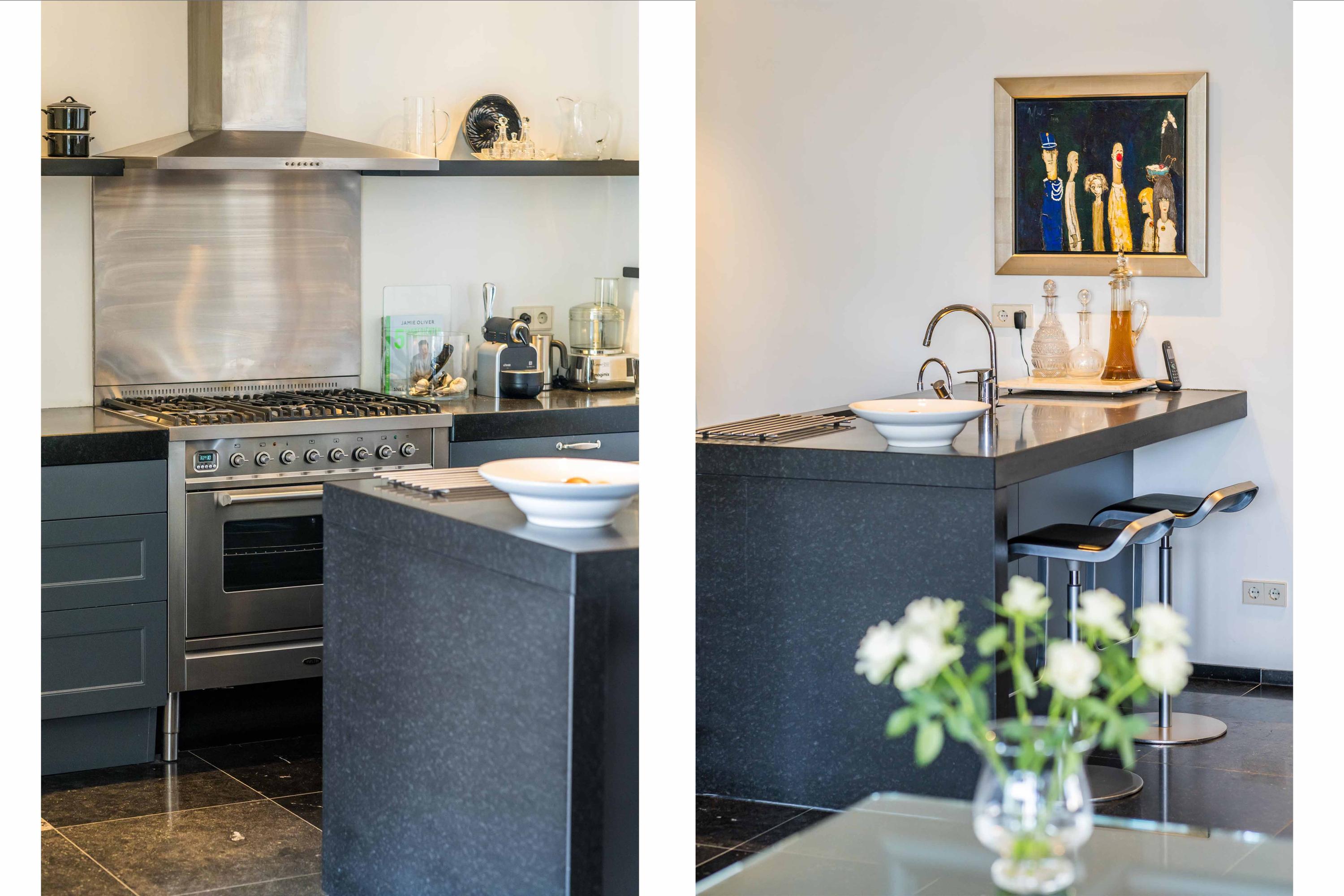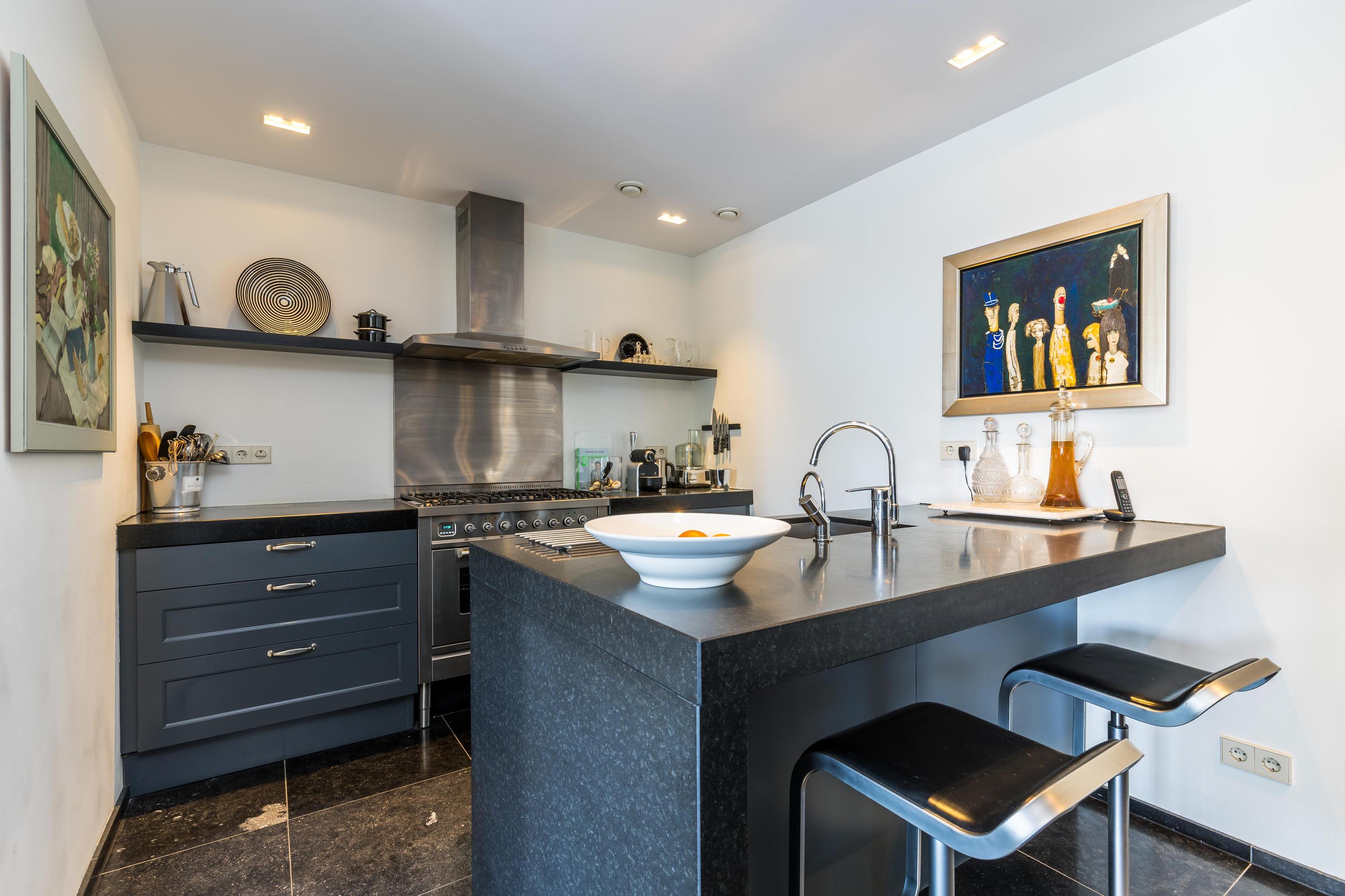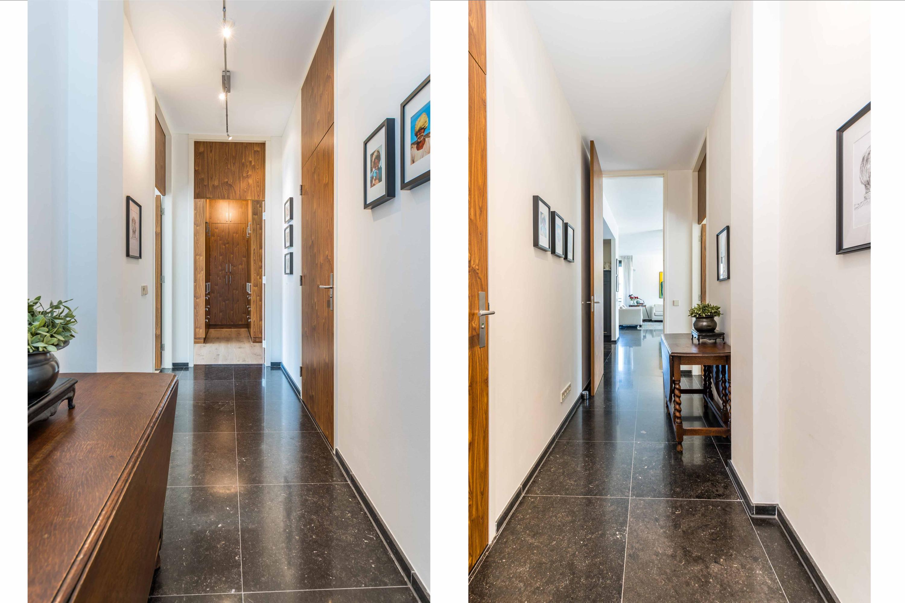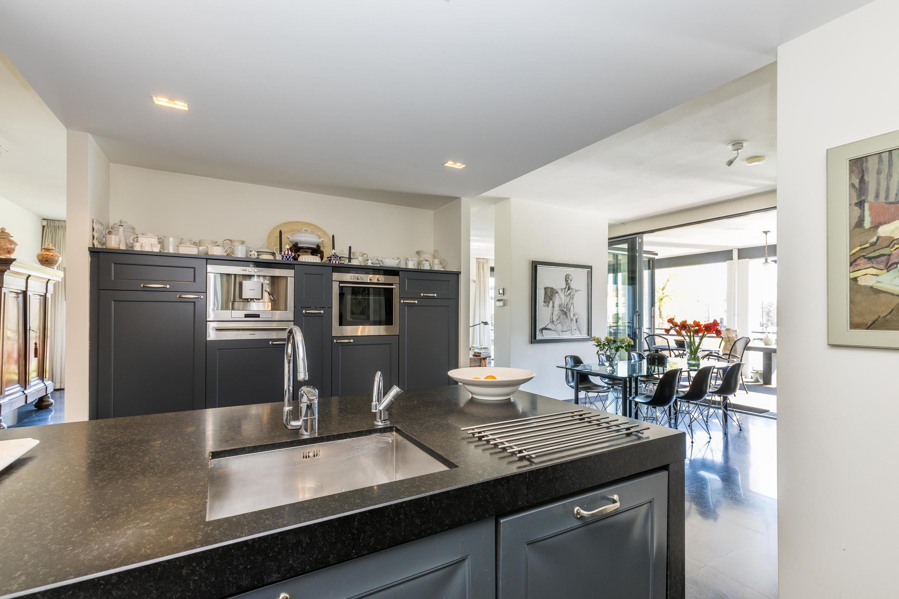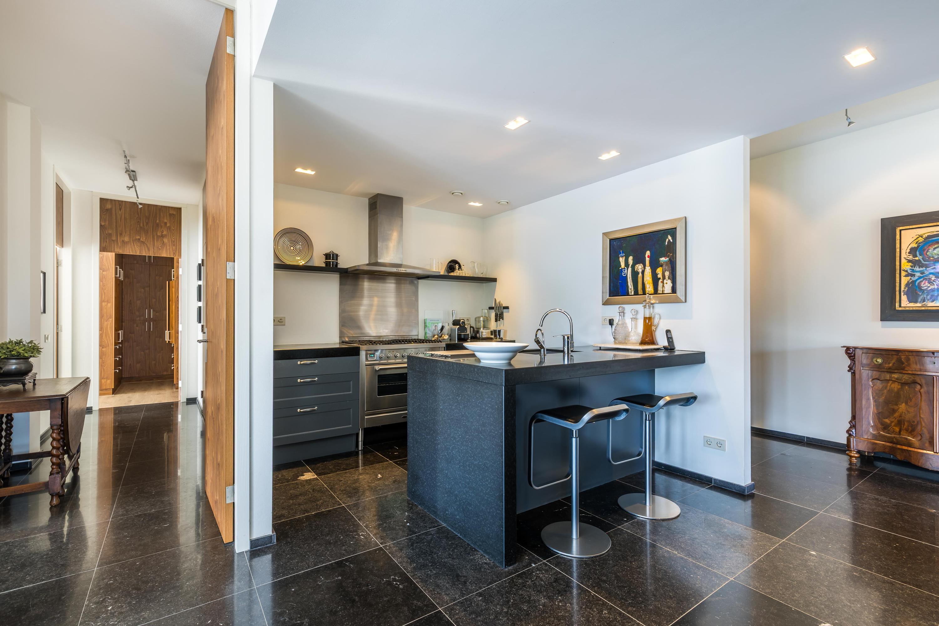 Begane grond: Bijzonder fraaie en imposante brede hal met direct een indrukwekkende zichtlijn naar de living, direct bij de entree bevindt zich de ruime berging/bijkeuken met tevens diverse techniek (c.v.-opstelling, mechanische ventilatie, wasmachine), toiletruimte met fonteintje, garderobekast, riante werkkamer, eenmaal in de woonkamer is het een oase van licht en ruimte en met een terras rondom is er altijd een heerlijk plekje op te zoeken. De woonkamer en halfopen woonkeuken staan subtiel met elkaar in verbinding waardoor de eetkamer een geborgen gevoel geeft. De eetkamer grenst aan het grootste terras dat een verbluffend mooi uitzicht biedt. De koude drankjes zijn dichtbij het terras, aangezien de keuken slim gepositioneerd is. De keukenopstelling bestaat uit 2 kastenwanden en een schiereiland. Via een afgesloten gang zijn de 3 slaapkamers en de 2 badkamers bereikbaar. De hoofdslaapkamer is voorzien van een walk-in-closet en een en suite badkamer.