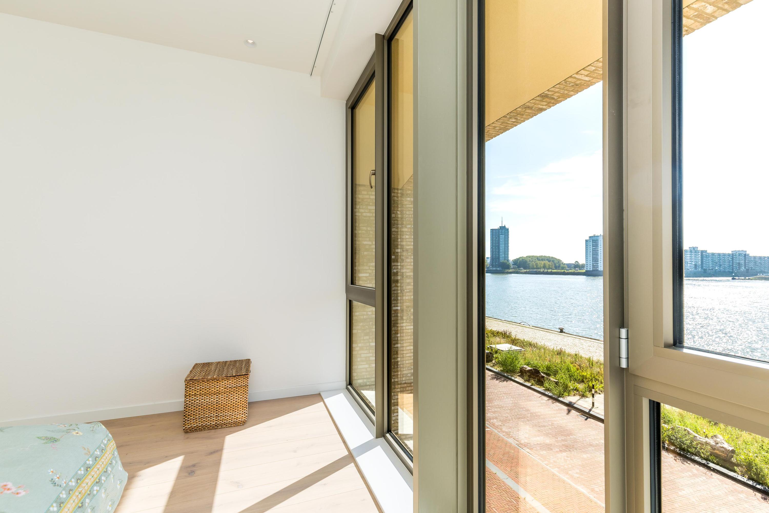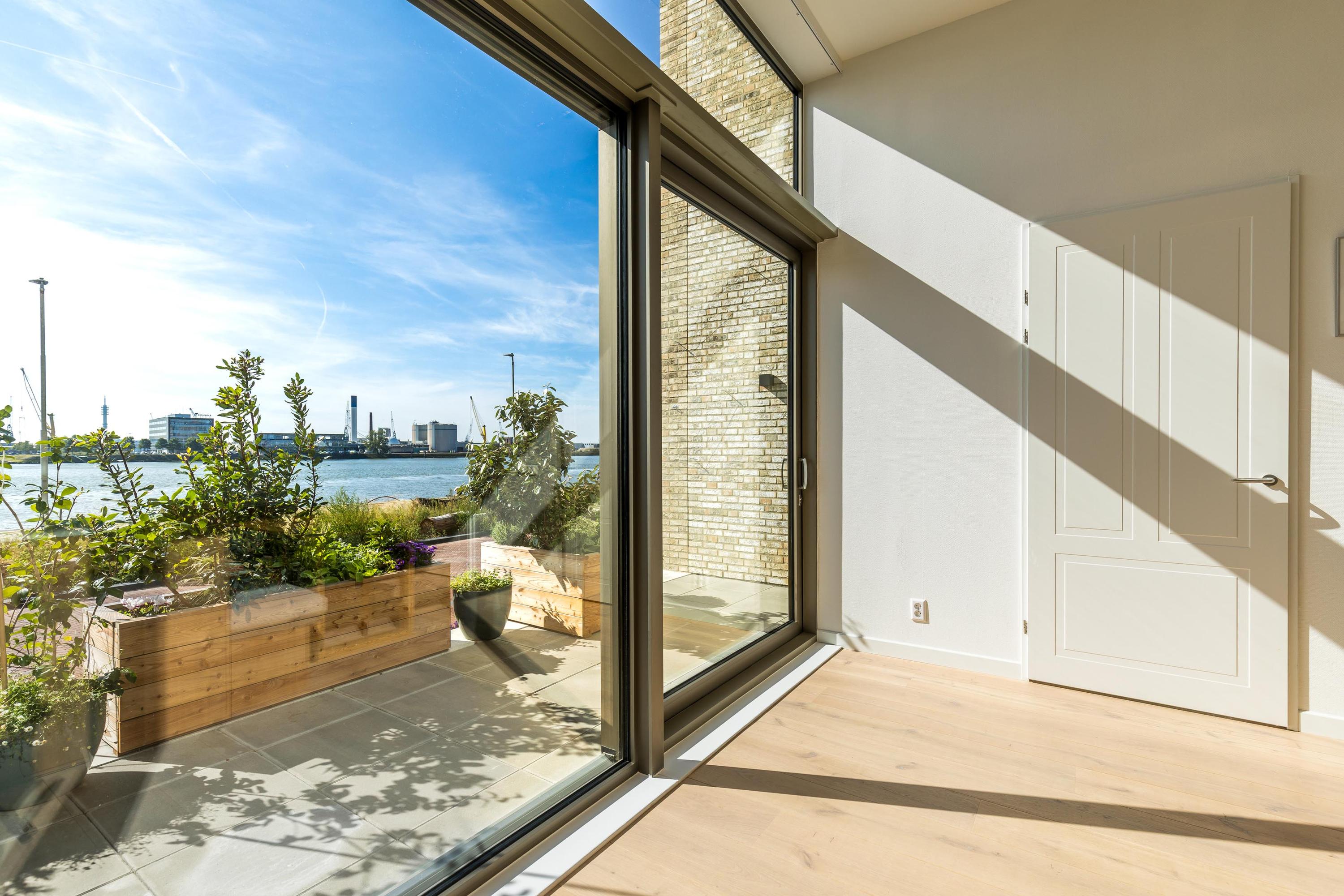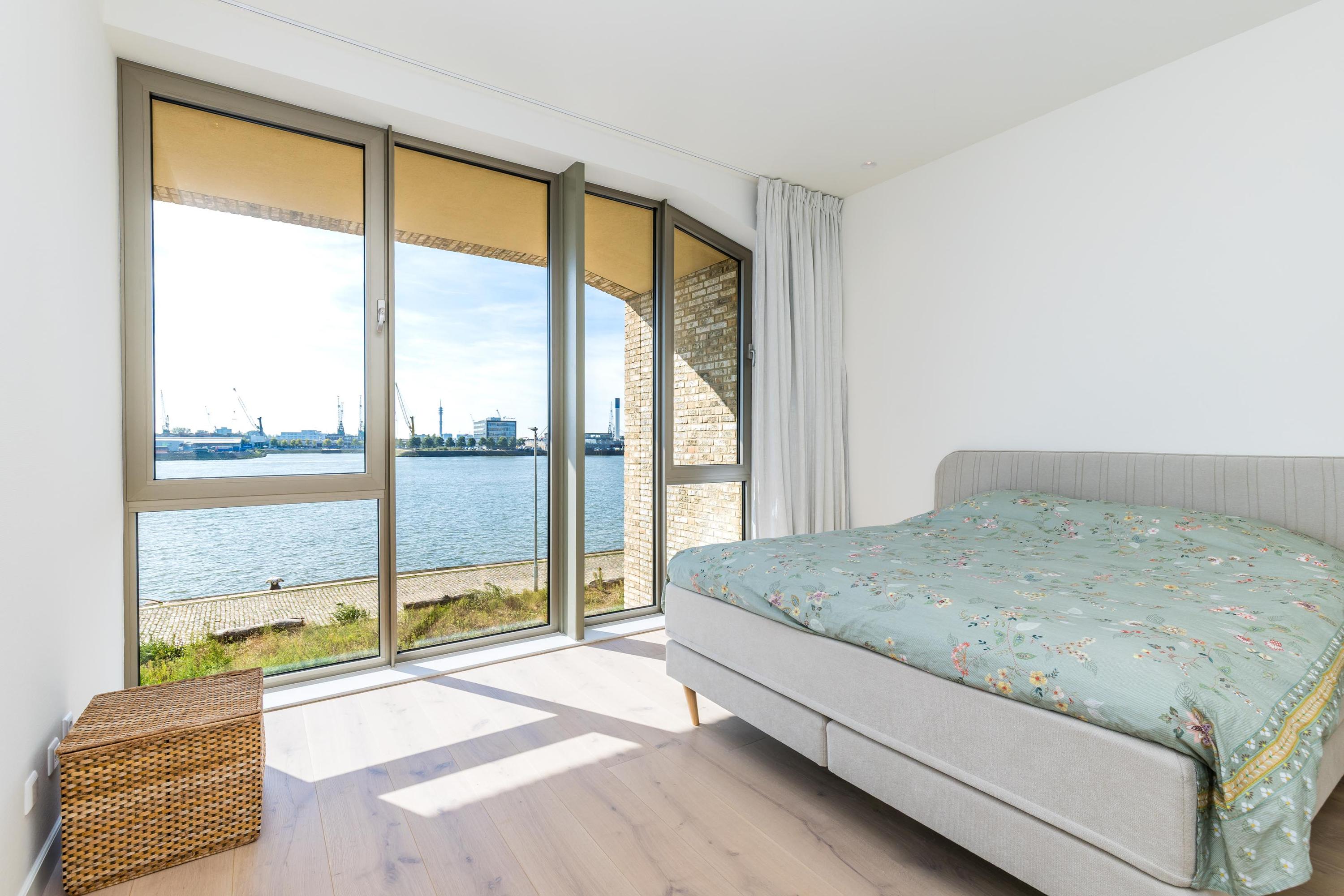 A living painting in your window every day: this spacious and stylishly finished apartment on the Lloydkade offers luxury, space, and panoramic views of the Maas River from sunrise to sunset.