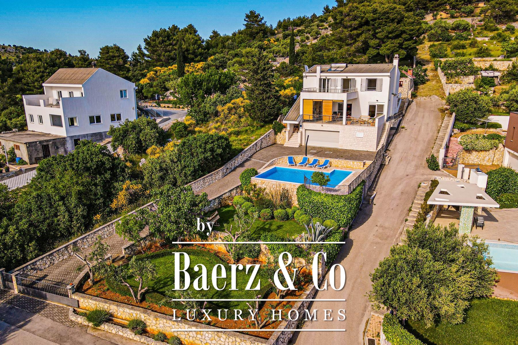 Šibenik, Žaborić, beautiful house with a swimming pool and panoramic sea views, total area 438 m² built in 2004. It is being sold fully furnished and equipped, and ideal for a vacation or tourist rental.Built on a plot of 1215 m², it consists of a basement with a garage for two cars, a machine room, a tavern, and two storage rooms. On the ground floor there is a spacious living room with a kitchen and a dining room, a storage room, laundry room and a toilet. The living room opens onto