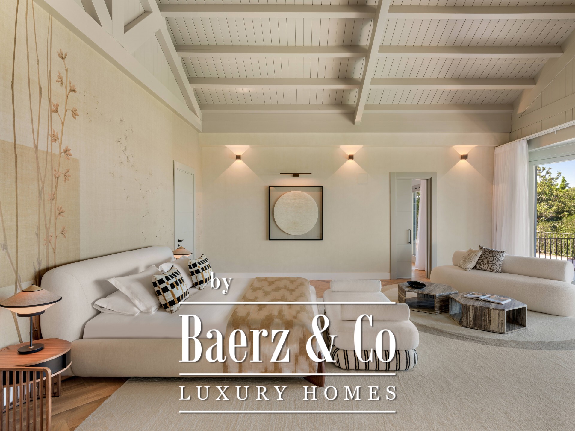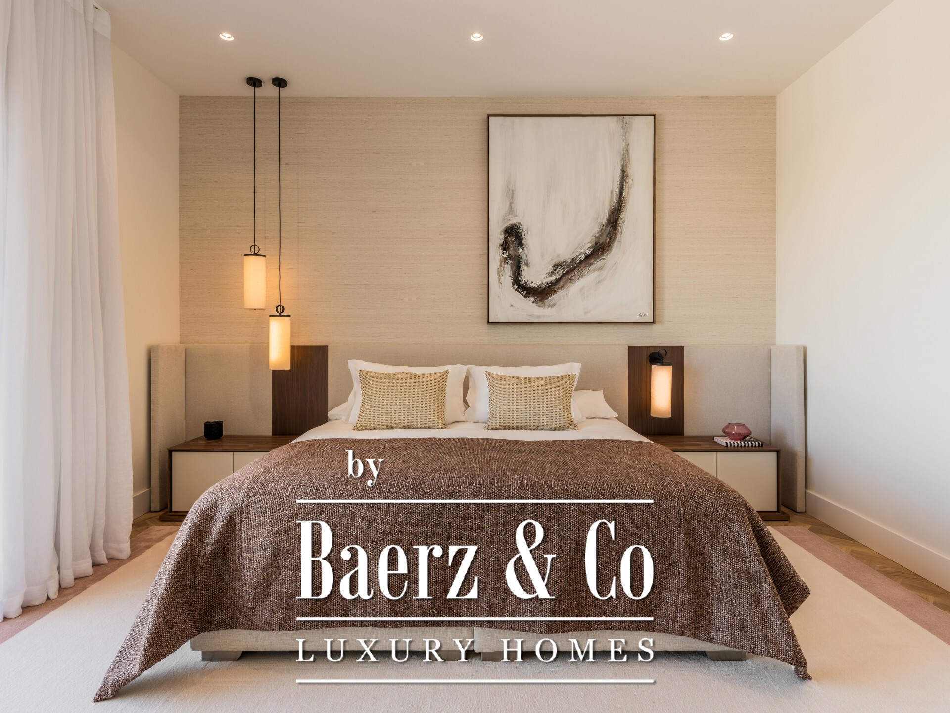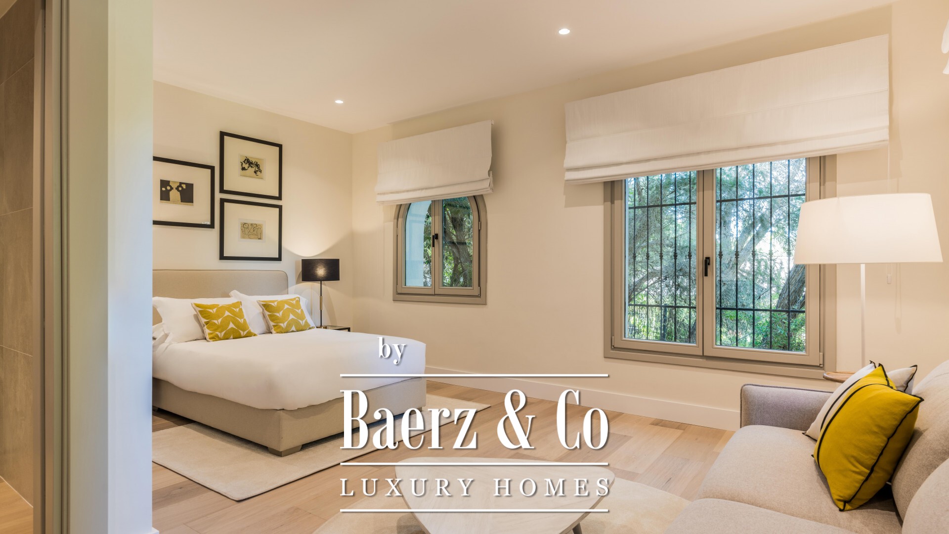 Im Gartengeschoss befindet sich ein vielseitig nutzbarer Freizeitbereich mit Spielzimmer, Heimkino, Bar und vier weiteren Schlafzimmern, von denen drei Bäder en Suite bieten. Das zweistöckige Poolhaus mit Grillplatz lädt zum entspannten Beisammensein im Schatten des Gartens oder am Abend ein. Im gesamten Haus sorgen Fußbodenheizung und Klimaanlage ganzjährig für Komfort. Zusätzliche Ausstattungsmerkmale sind Sauna, türkisches Bad, Salzwasserpool, Weinkeller und Sicherheit innerhalb einer geschlossenen Wohnanlage.