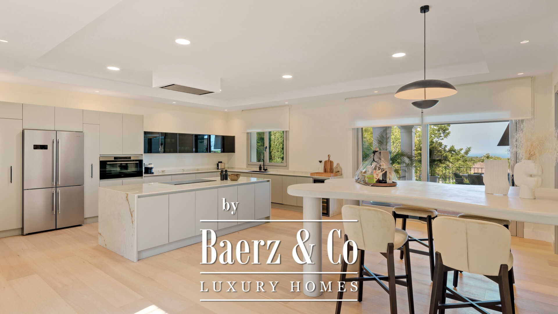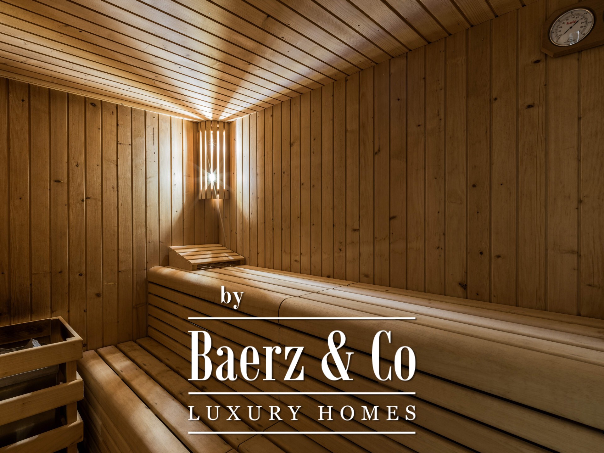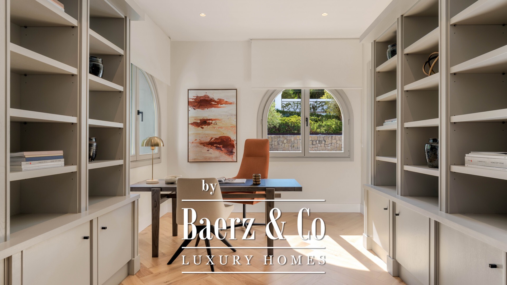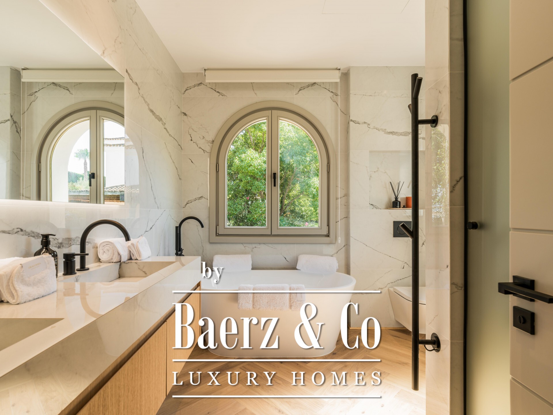 Im Gartengeschoss befindet sich ein vielseitig nutzbarer Freizeitbereich mit Spielzimmer, Heimkino, Bar und vier weiteren Schlafzimmern, von denen drei Bäder en Suite bieten. Das zweistöckige Poolhaus mit Grillplatz lädt zum entspannten Beisammensein im Schatten des Gartens oder am Abend ein. Im gesamten Haus sorgen Fußbodenheizung und Klimaanlage ganzjährig für Komfort. Zusätzliche Ausstattungsmerkmale sind Sauna, türkisches Bad, Salzwasserpool, Weinkeller und Sicherheit innerhalb einer geschlossenen Wohnanlage.