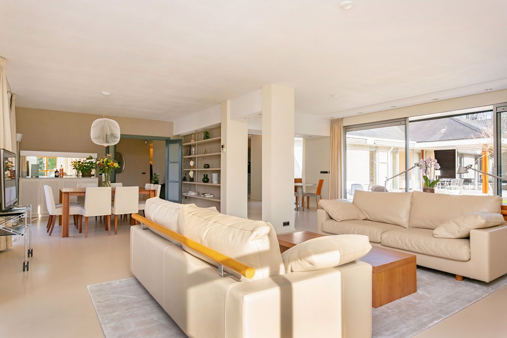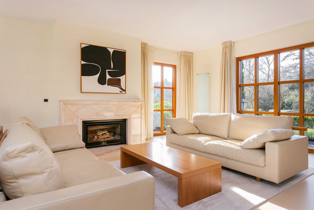 • Living: Een lichte, ruime woonkamer met symmetrische kamerhoge ramen aan drie zijden, een gesloten houthaard, dubbele deuren en een schuifpui naar achtertuin
