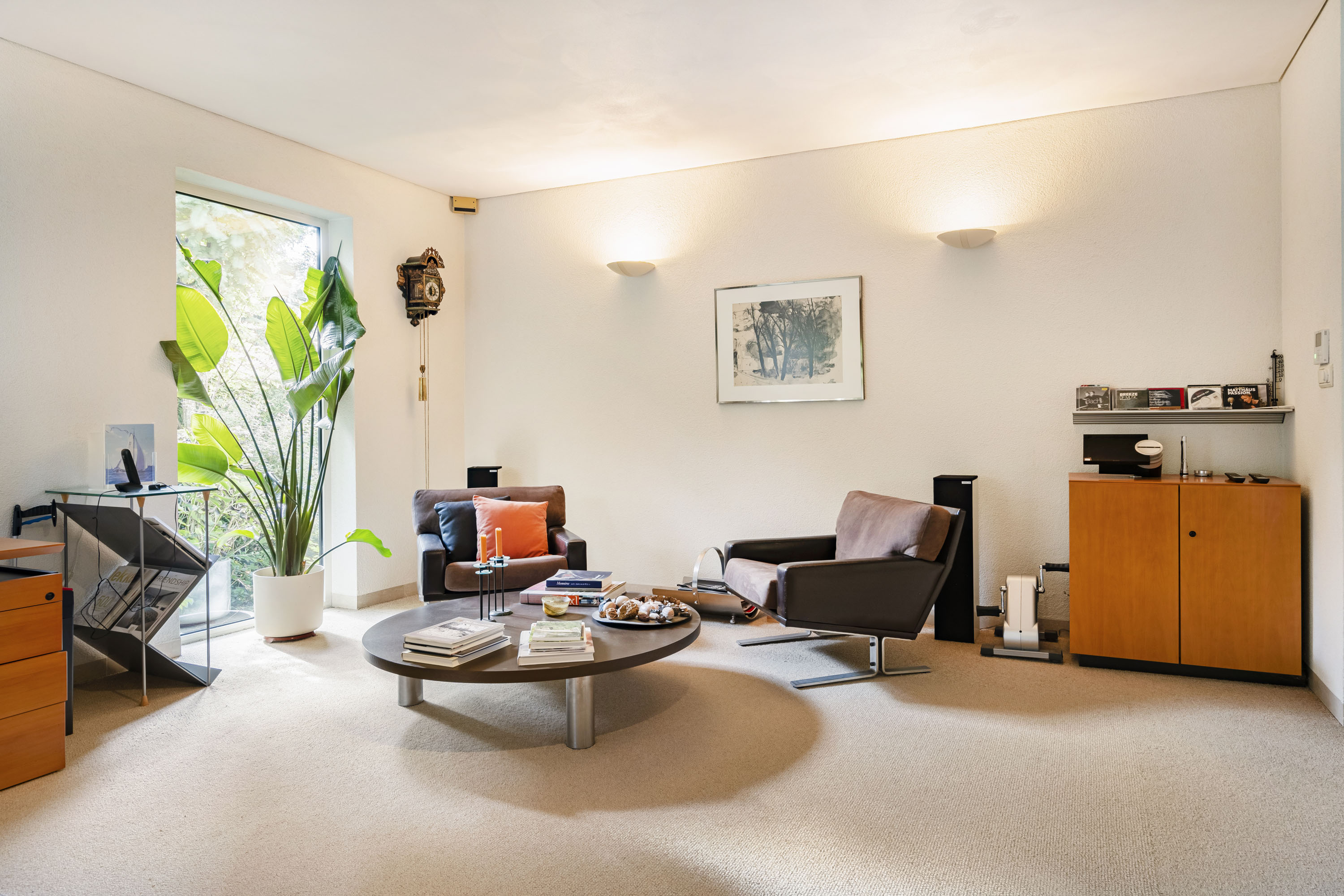 Moving further into the home, you enter the exceptionally large living area. The lounge features a full-width glass façade, offering breathtaking views of the garden. The open-plan kitchen is connected to a utility room, which includes a dumbwaiter from the basement. The dining room is located on the garden side, and in between lies a spacious study. All of these areas flow openly into each other, while the study and kitchen can be closed off with elegant sliding doors. The large covered terrace, accessible from the living room through sliding doors, features an electric retractable roof and sunshade.