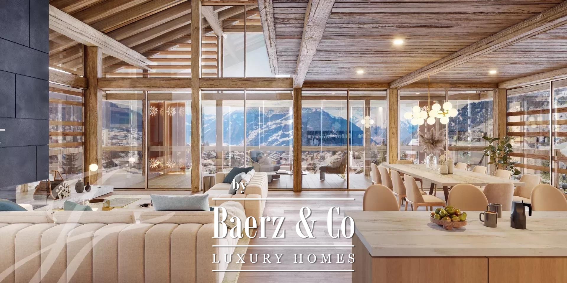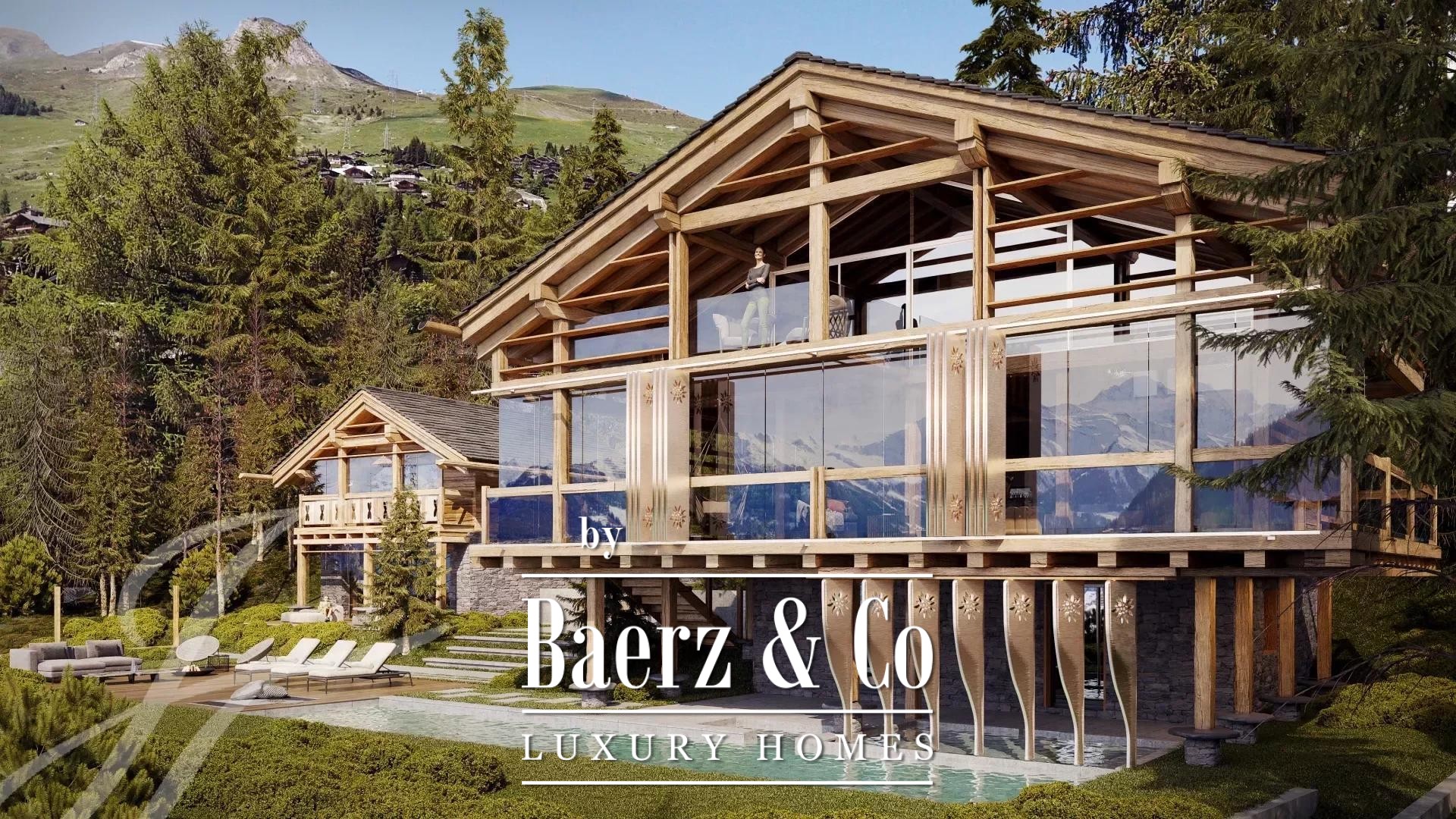 to a sumptuous master suite.The guest chalet has 2 floors, with 2 double bedrooms and en-suite bathroom. An open kitchen, living room, dining room and private south-facing terrace offer perfect independence.Both chalets are bathed in light and enjoy panoramic views.The plus points of this exceptional property: - Newly landscaped outdoor pool and gardens- Underground parking with direct access to both chalets- Customizable finishes to suit future owners' preferencesA rare combination of luxury, comfort and nature.