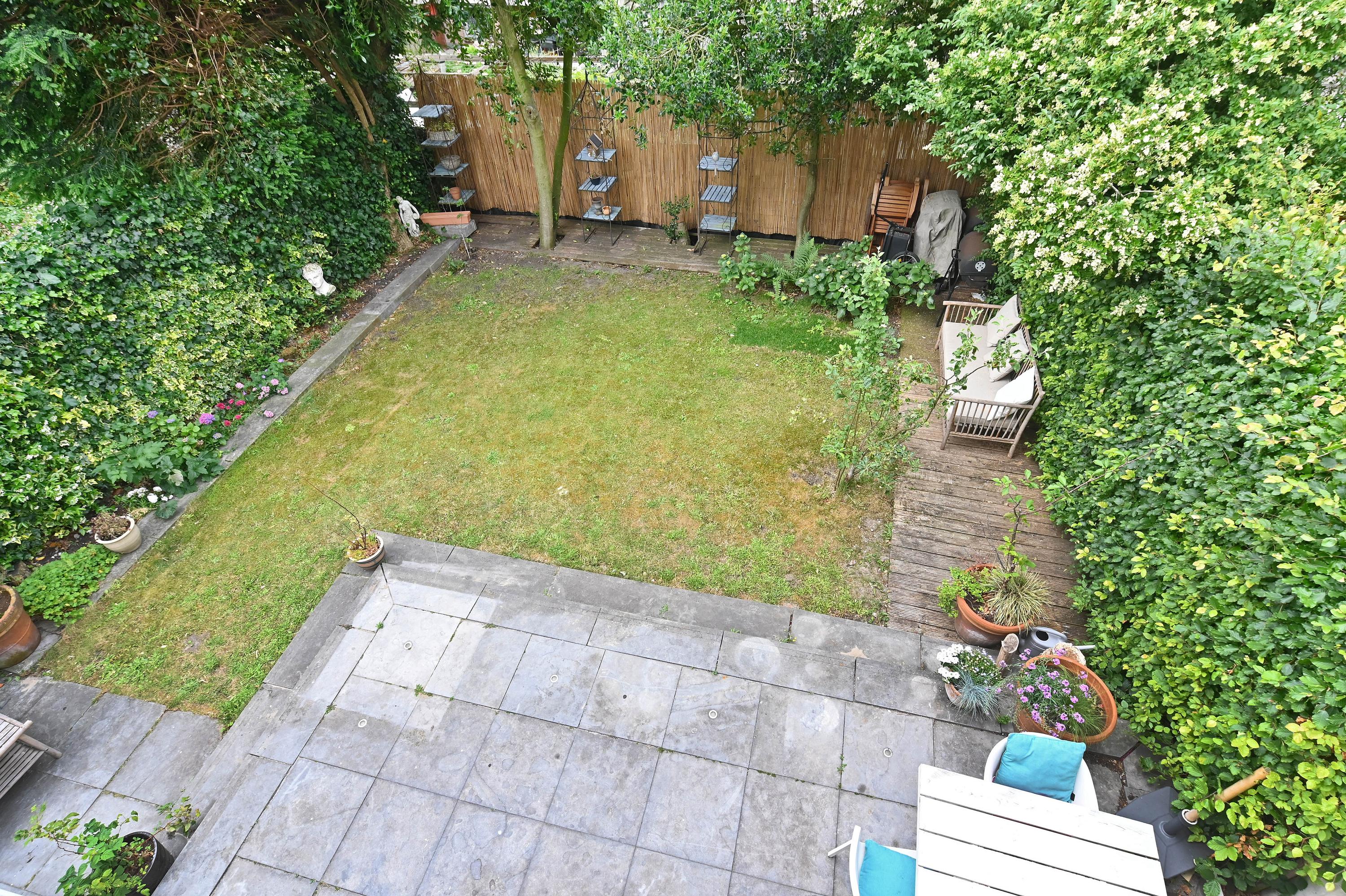 Past the front door is a vestibule with built-in storage where double doors inset with glass open to a big central hall with a modern guest lavatory. At the front is the living room, which spans the full width of the house and features bay windows and a large fireplace. The generously proportioned dining room at the rear is open to the big, modern well-equipped kitchen; both have doors to the sunny back garden. The ground level, which is largely laid with oak parquet flooring, has lofty ceilings measuring ca. 314 cm.
