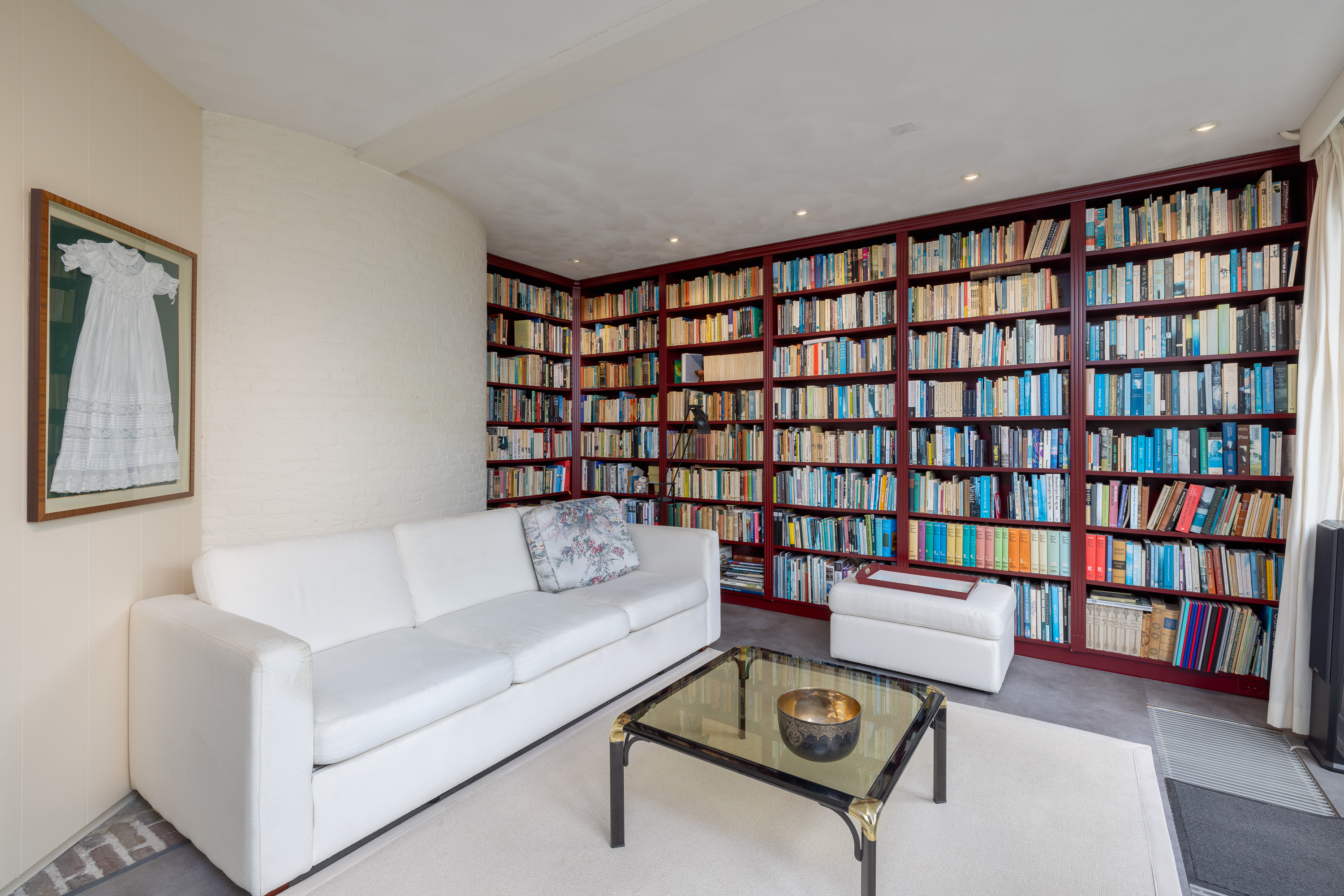 Upon entering through the spacious entrance hall with cloakroom, toilet, and built-in cupboards, you enter the spacious living room with fireplace and several sitting areas.